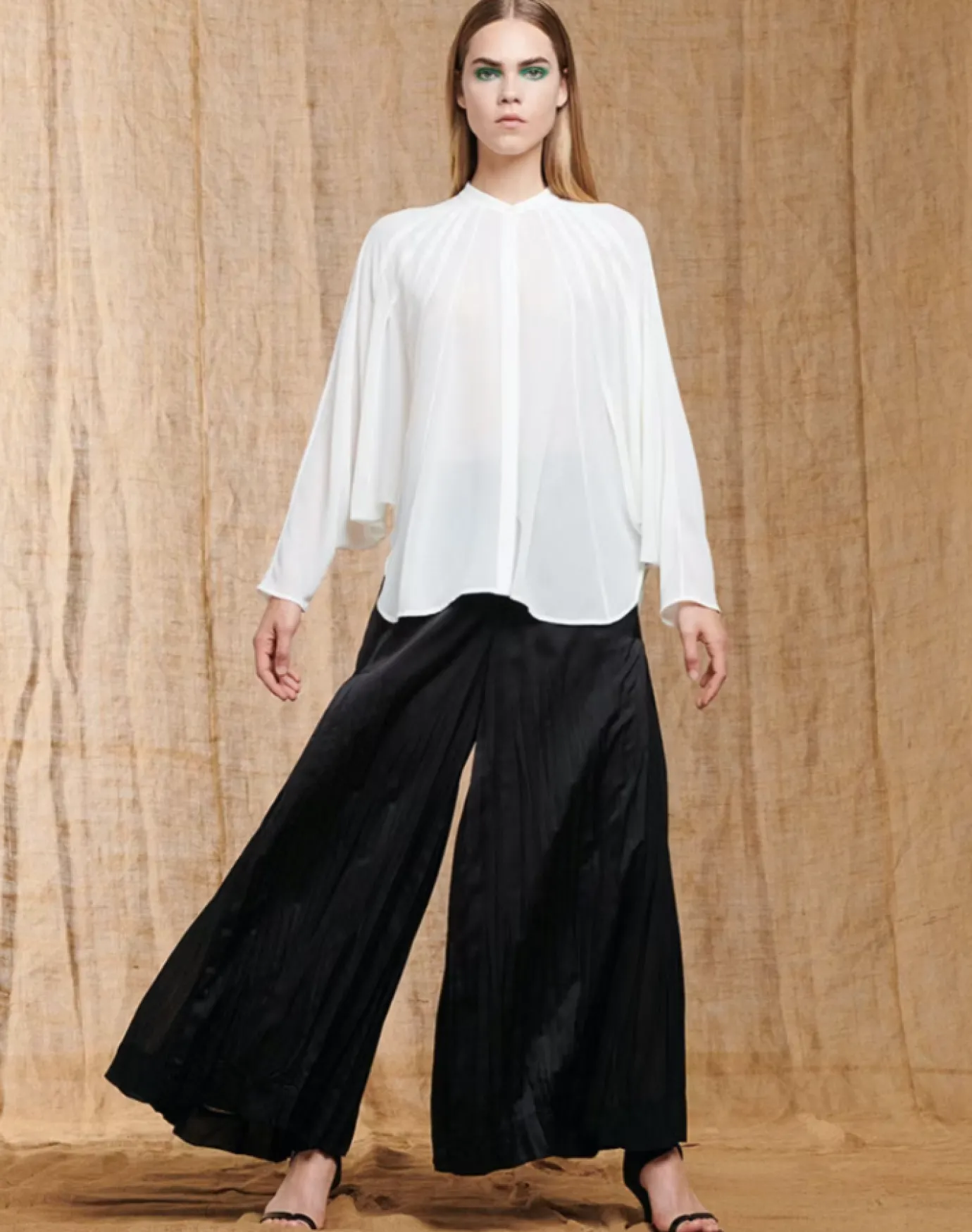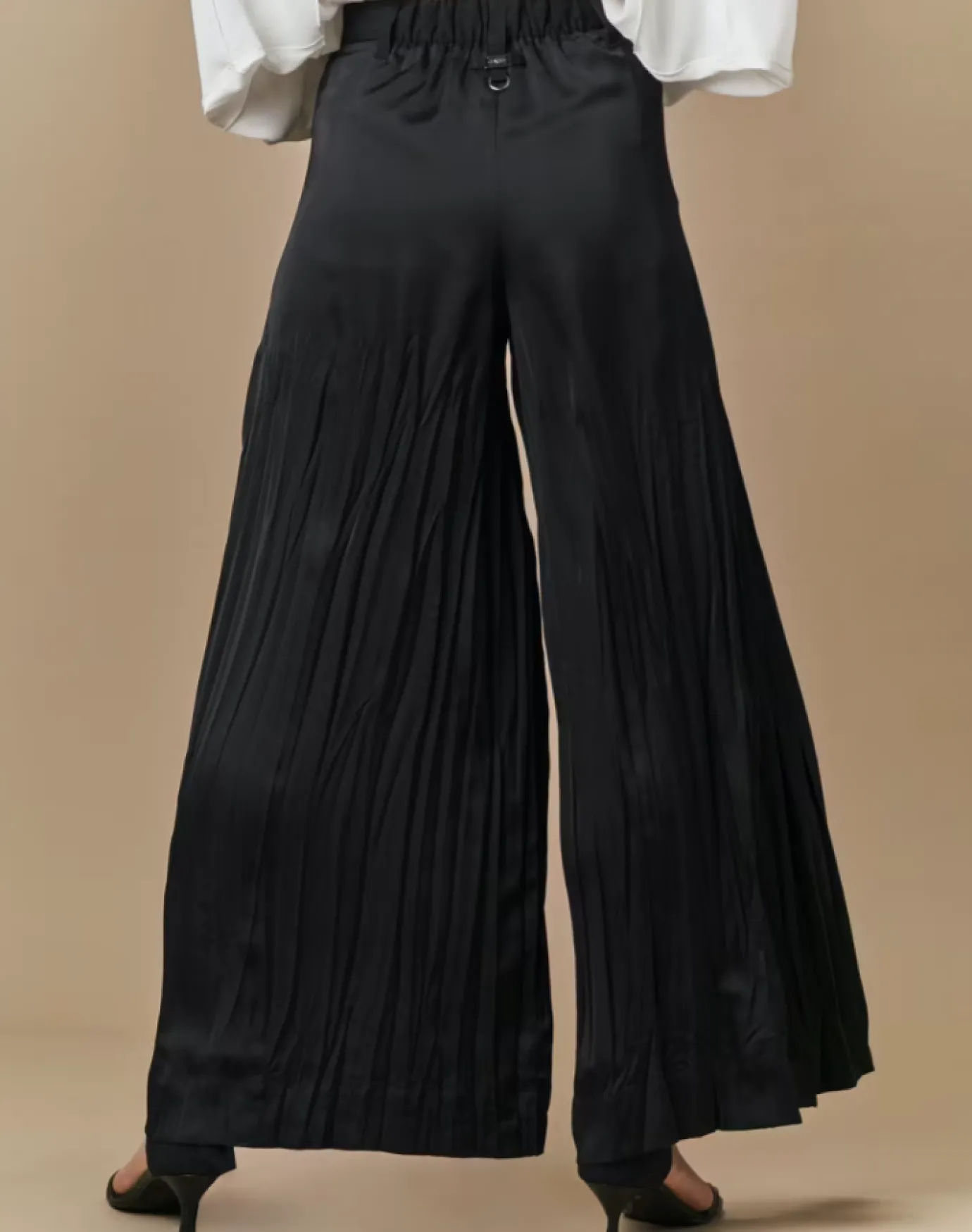 Palazzo style pants in technical satin and georgette with fixed single button waistband and tape belt loops over a fly front fastened with a silver metal zip. Flat fronts have curved entry hip pockets and extend into very wide legs with pre-creased multi-pleating creating fullness down to the hem. Sides have wide godets of semi-sheer pleated georgette which adds volume to the leg. Reverse is plain. Very wide legs in satin and georgette finish in a wide hem.