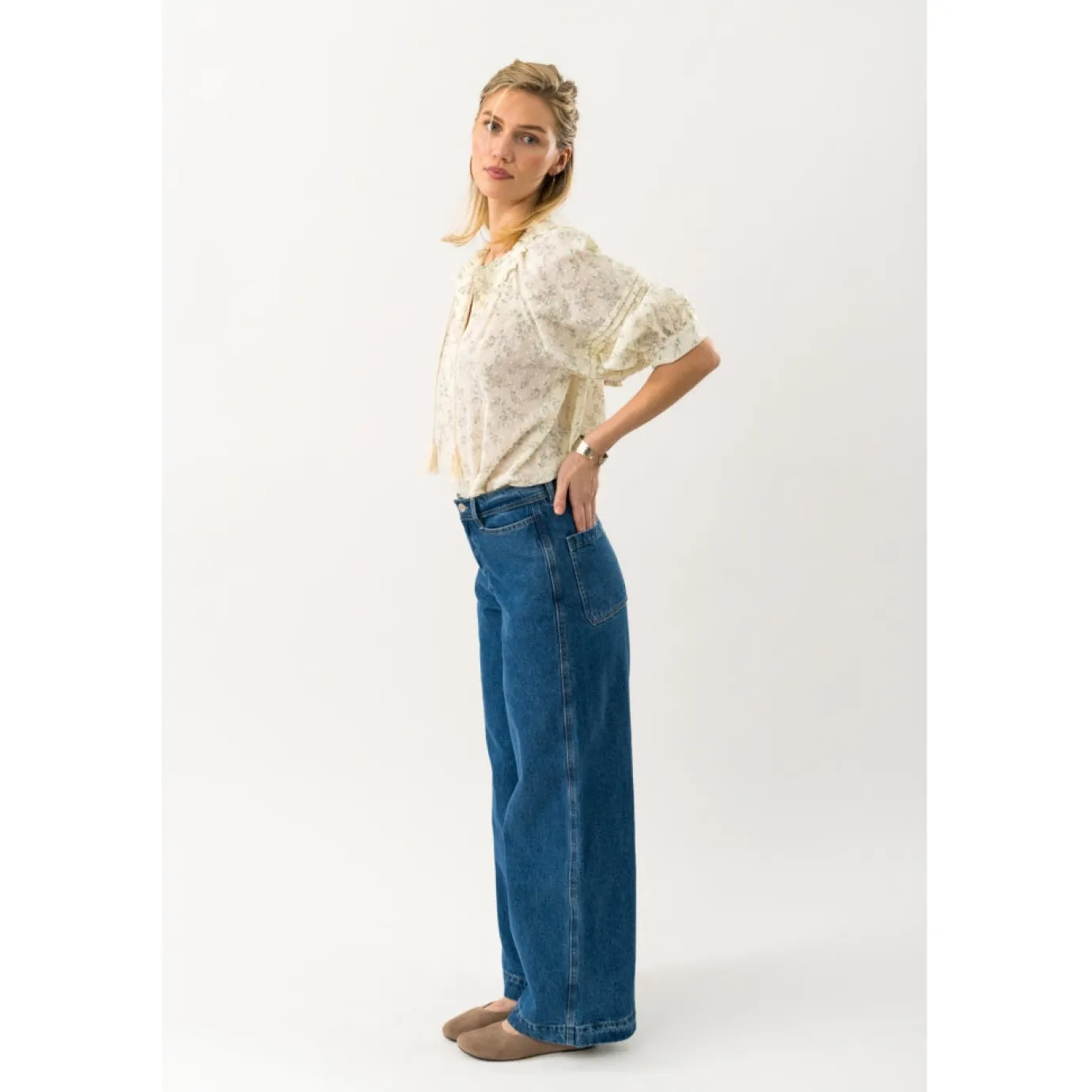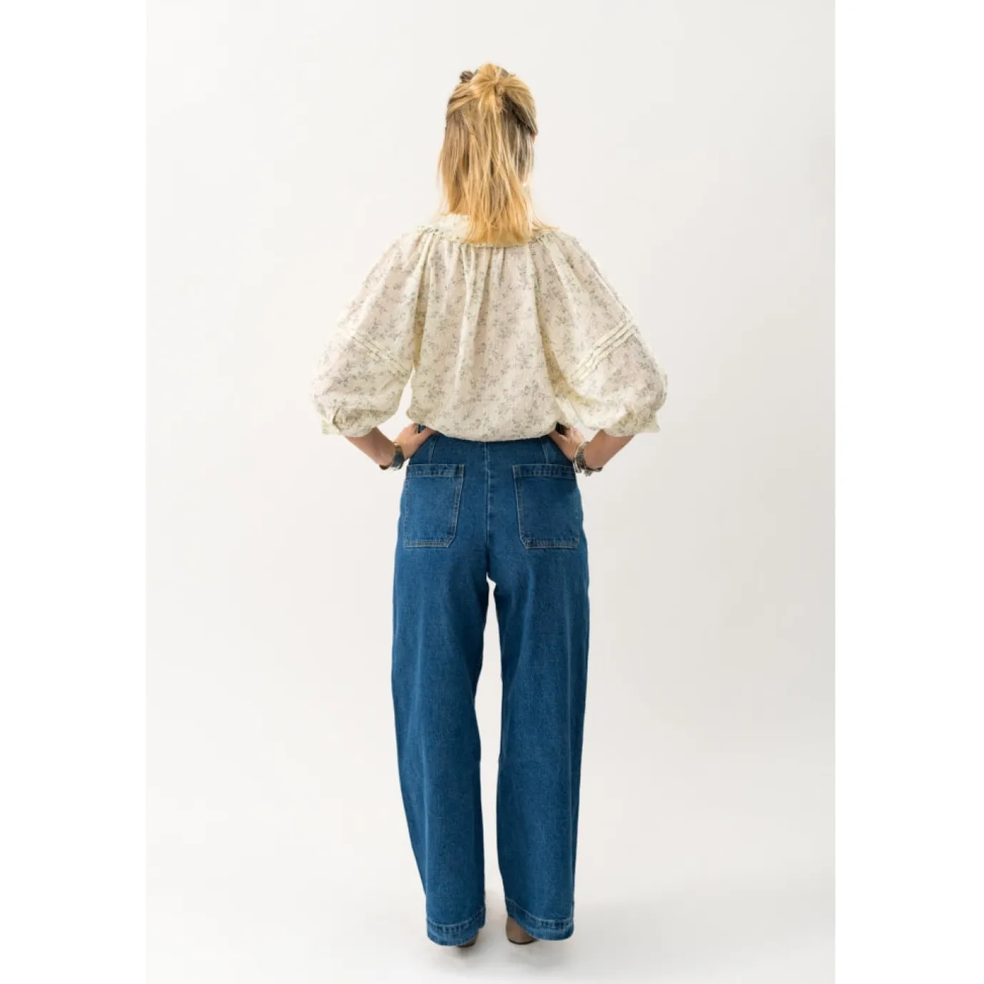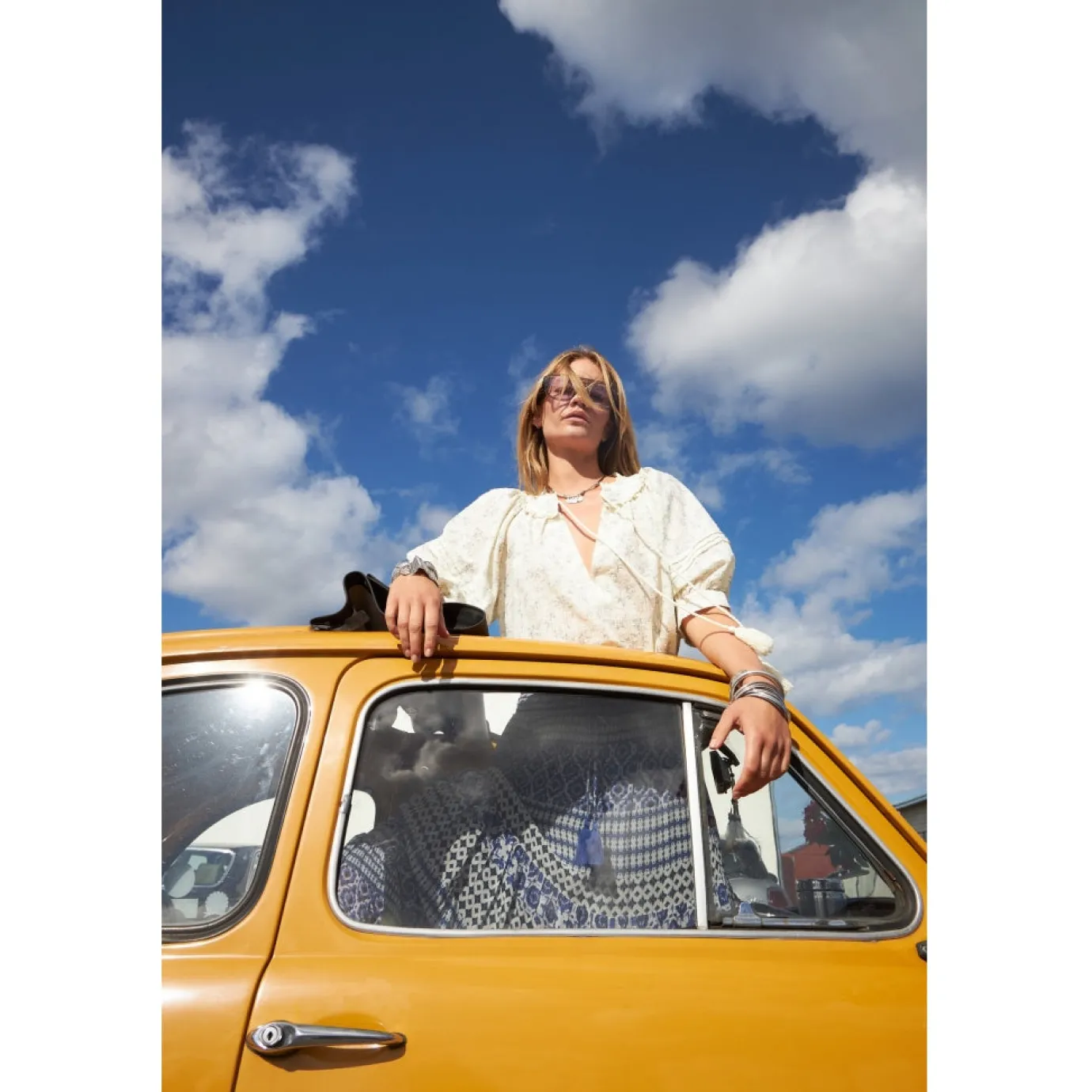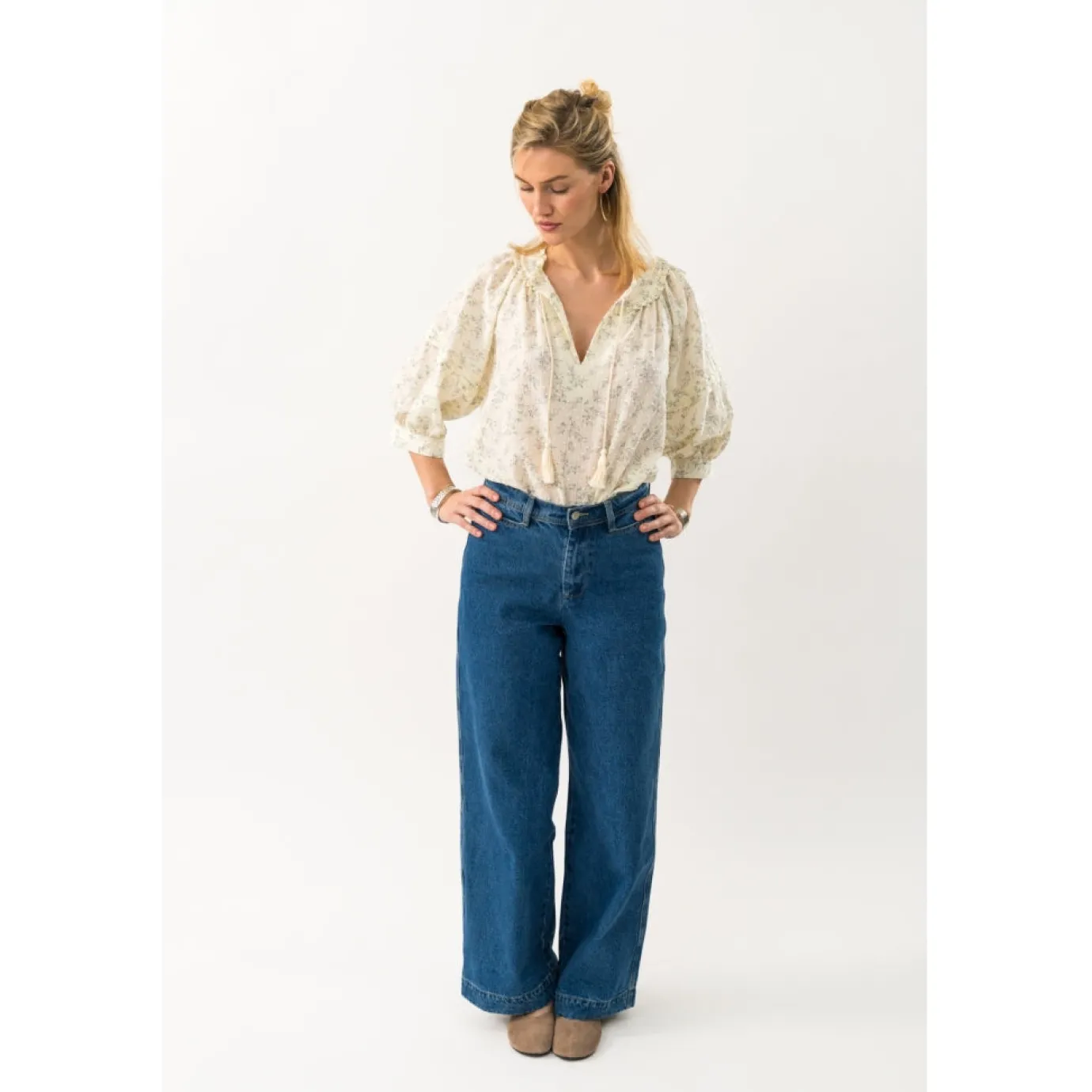 The Alvi Creme Print Blouse by Lollys Laundry offers a breezy, elegant look perfect for warm days. Its loose fit and delicate floral fabric ensure comfort and style, while 3/4 pleated sleeves with wide cuffs add volume and charm. Featuring a round neckline with tie strings and boho tassels, plus frill details on the collar, this blouse pairs effortlessly with jeans, skirts, or shorts for a relaxed yet sophisticated summer outfit.