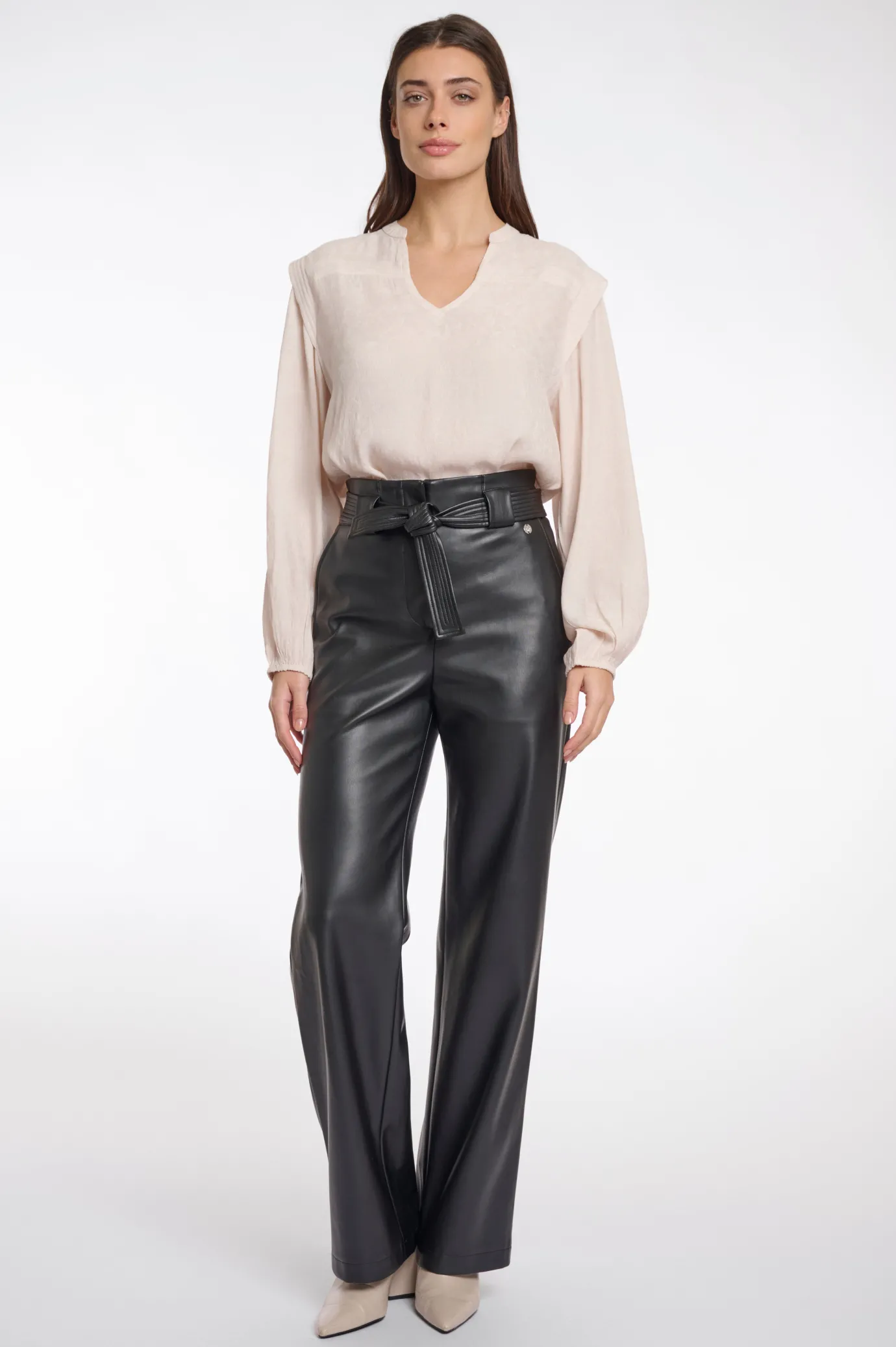 Crafted in sleek black faux leather, these Annemie trousers combine style and comfort effortlessly. Featuring a regular length and straight leg design, they offer a flattering silhouette for any occasion. Practical side pockets and a front zip add functionality, while the elasticated back waist ensures a perfect fit. Complete with a stitched belt for a polished finish, these trousers are ideal for elevating your everyday wardrobe with a sophisticated edge.