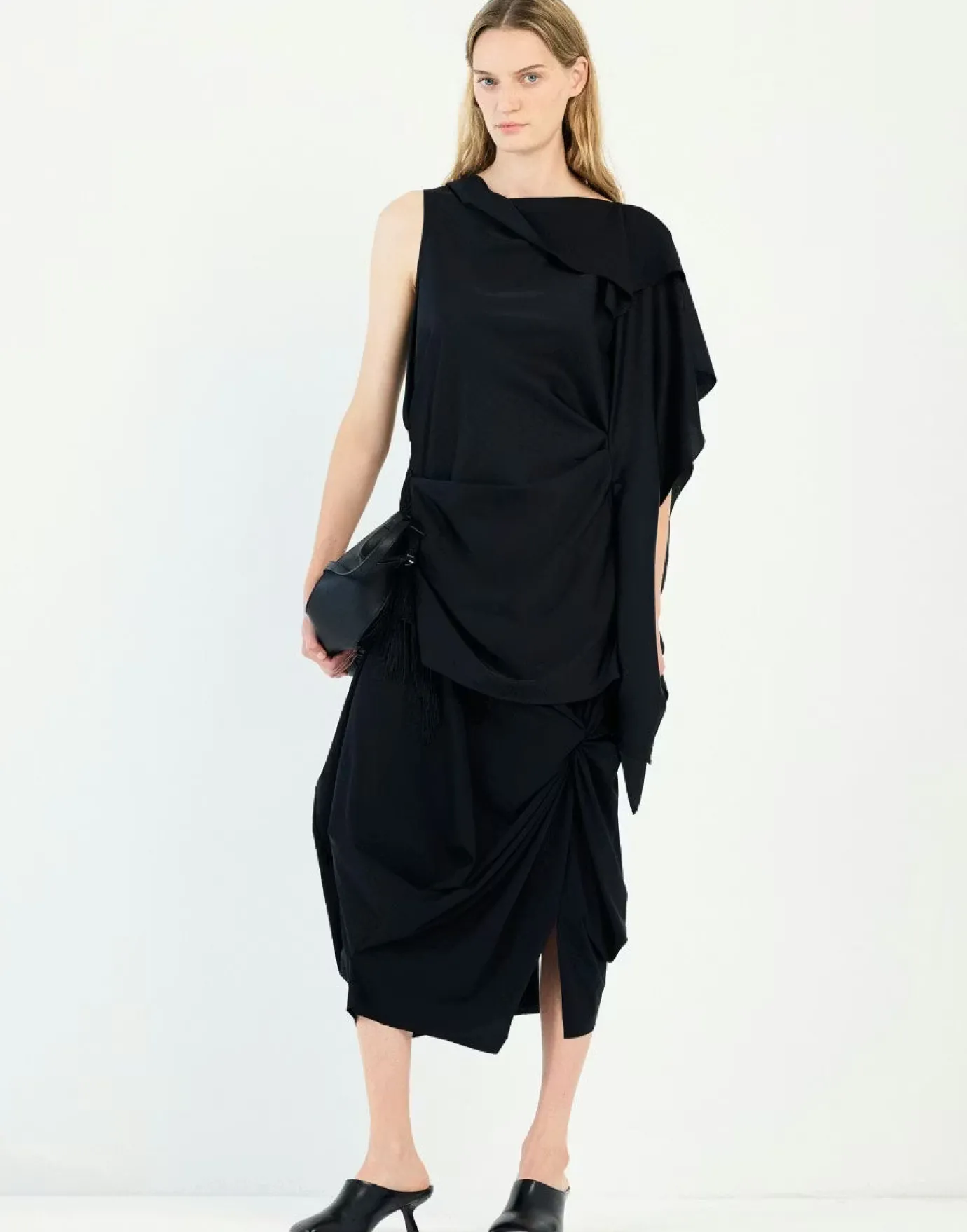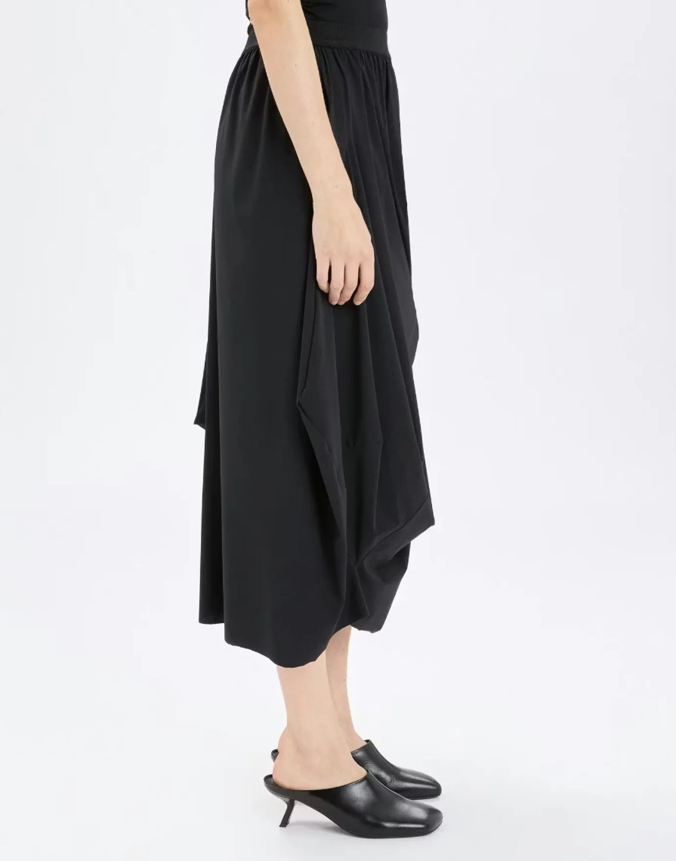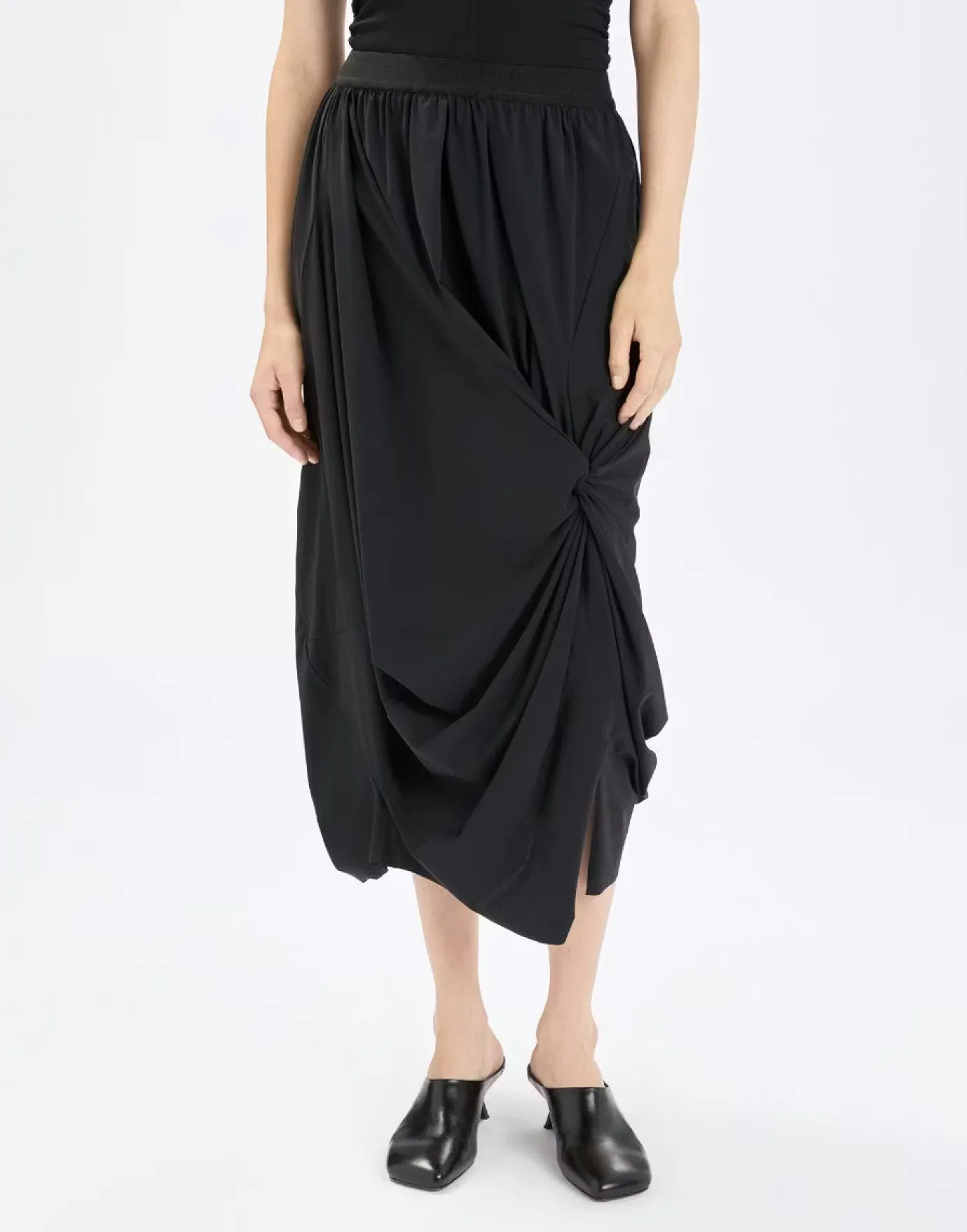 The Askance Rouched Skirt showcases designer sophistication through its innovative draping technique. Crafted from Sensitive jersey—a luxuriously versatile fabric—the skirt features an elegant front gather that culminates in a striking knot detail, instantly elevating your silhouette. The comfortable elastic waistband ensures all-day wearability, while the calf-length cut with asymmetric left slit delivers contemporary edge and movement. Made from 75% nylon and 25% elastane, this piece combines refined aesthetics with practical comfort, making it an essential addition to any discerning wardrobe.