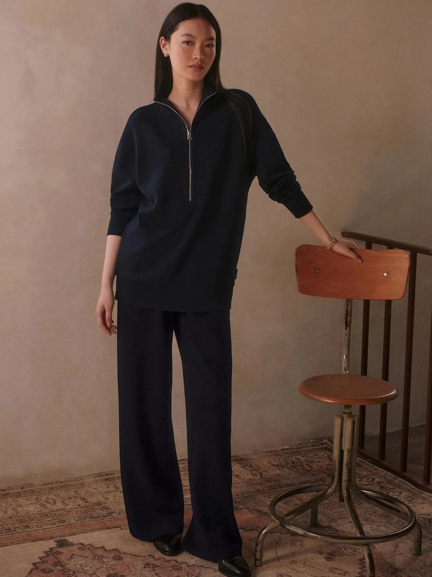 Experience effortless style and comfort with the Extra Wide Leg Pant 32″ in Navy blue, Made from Varley’s signature DoubleSoft® fabric, these pants feature a high waist and elegant front pleats that enhance their chic, extra-wide silhouette. The fully elasticated waistband and side entry pockets provide a perfect fit and practical convenience, making them ideal for everyday wear. Elevate your wardrobe with a versatile piece that combines sophistication and ease in one flattering design.