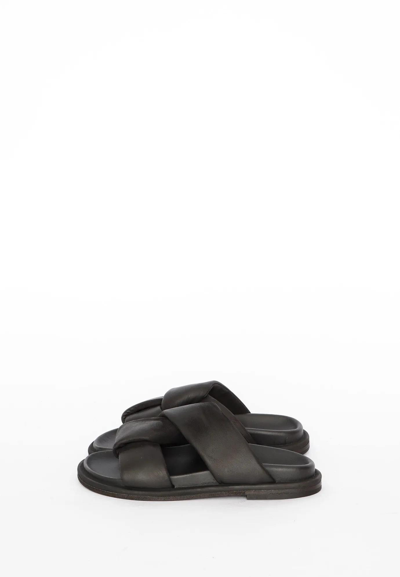 Step into elegance with the Lofina black leather mule, featuring an open toe and a distinctive cable-plaited design crafted from soft, padded calfskin leather. The cushioned sole ensures exceptional comfort, making these sandals perfect for all-day wear. Finished with a premium leather sole, this simple yet sophisticated mule combines style and luxury effortlessly.