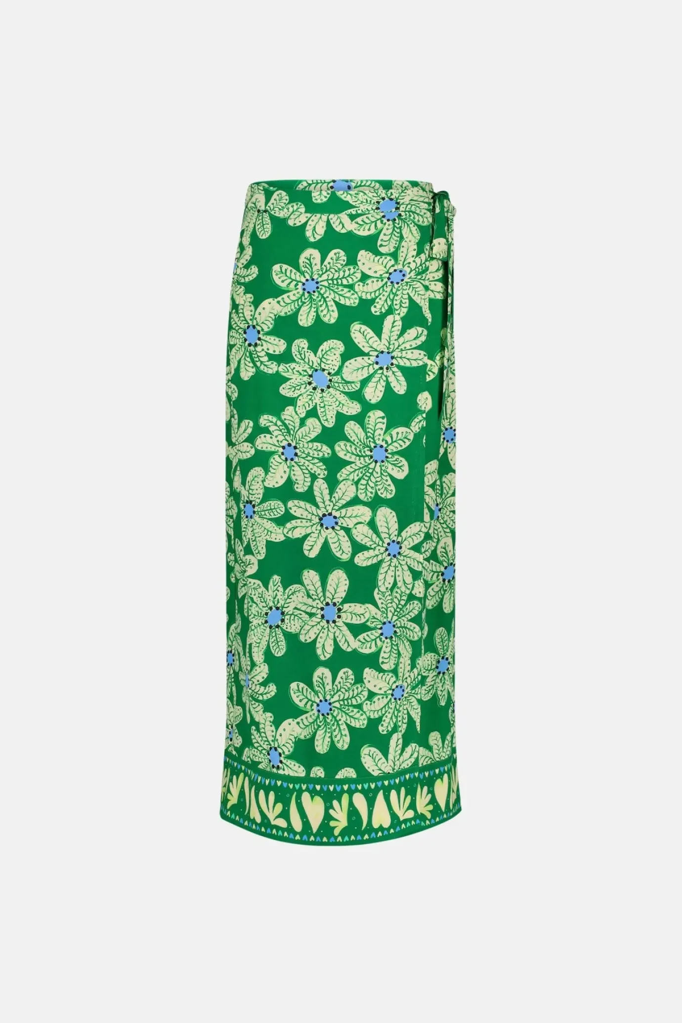 This supple wrap skirt features a ribbon tie in the waist and an all over palms print. It’s made of a blend of fabrics for an airy, supple and durable feel.