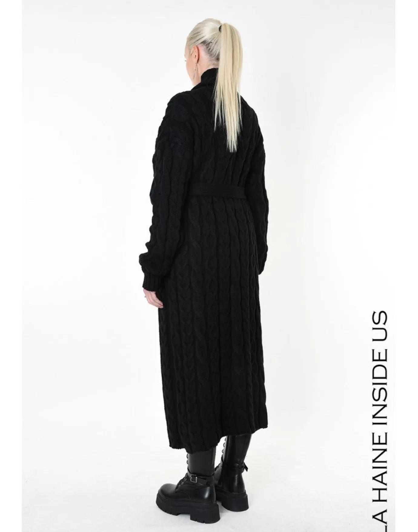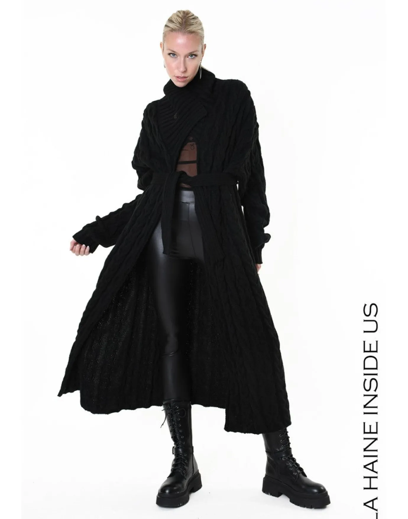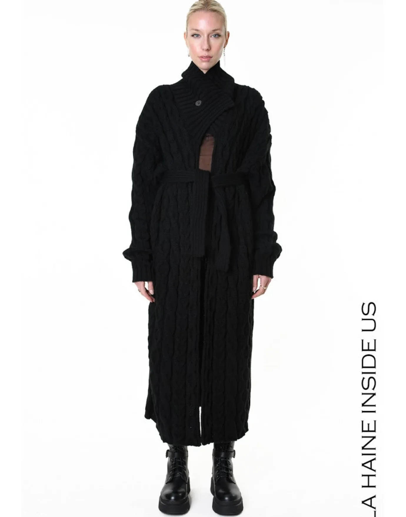 Stay warm and stylish with the midi length cable knit black coat cardigan. Made in Italy from a wool blend fabric, this long design cardigan boasts a button and ribbed high collar, long sleeves, and decorative cable knit, worn belted or loose, it’s perfect for any occasion.