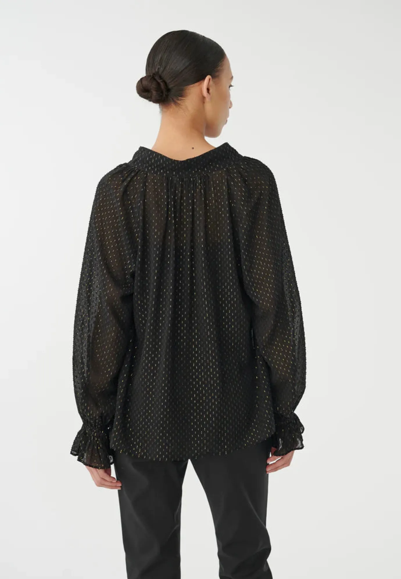 The Dea Kudibal Cassisa Blouse in Lurex Black. Enchanting in its black finery, this Lurex blouse exudes an sophisticated elegance. With a soft sheen that marks it as a luxe piece, it’s sure to be a treasured addition to any high-end wardrobe.
