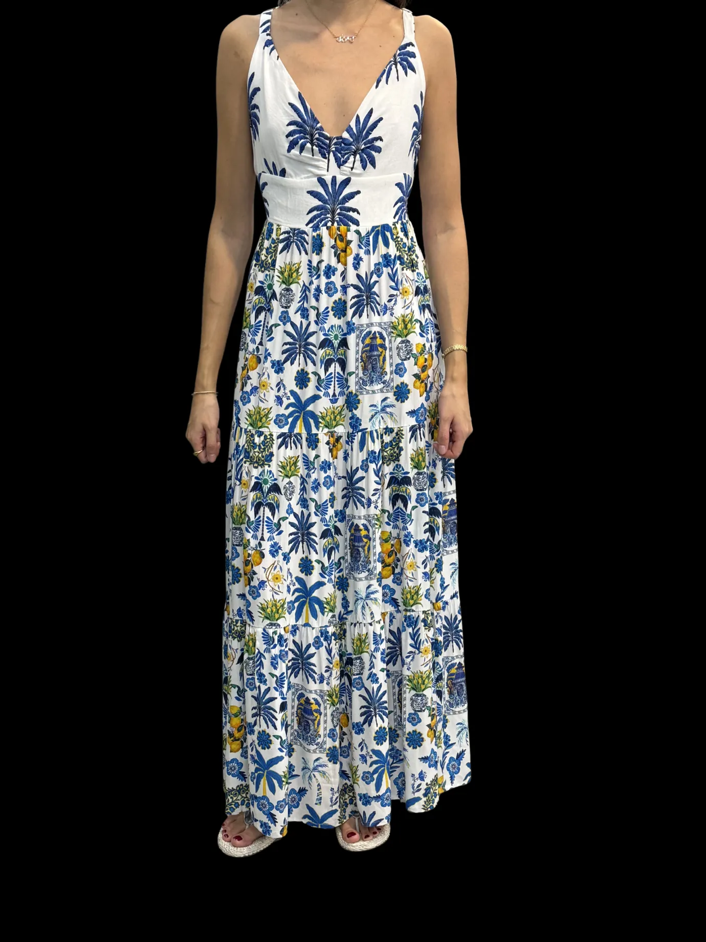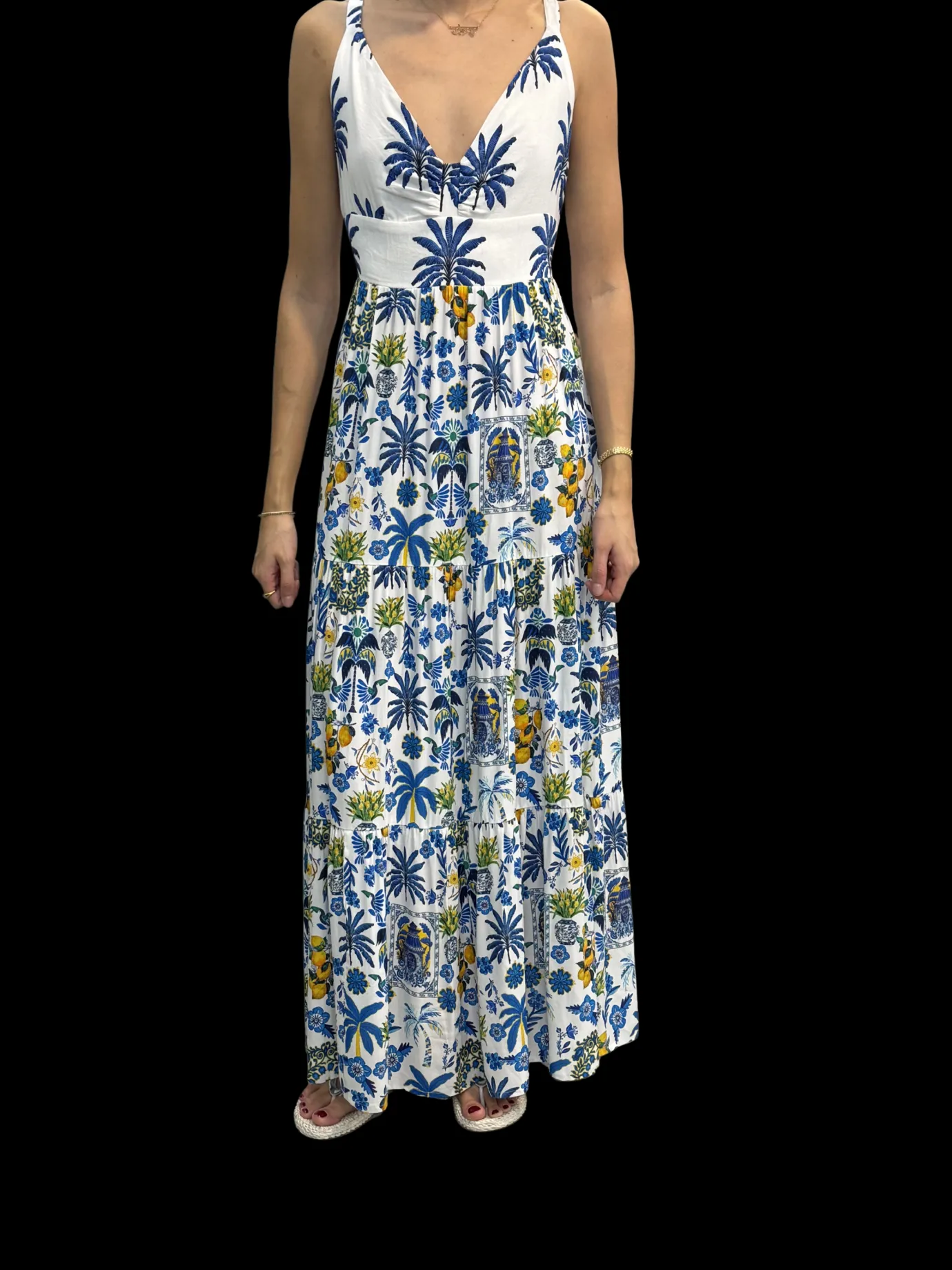 Elevate your wardrobe with the Dina Papercolle Print Dress by Inoa. This elegant maxi dress features a graceful open neckline and delicate spaghetti straps, paired with a flowing silhouette from the waist down. The stunning blue and green botanical print on a crisp white base brings nature-inspired artistry to your everyday style. Perfect for warm weather occasions, this piece seamlessly transitions from casual outings to special events with effortless sophistication.