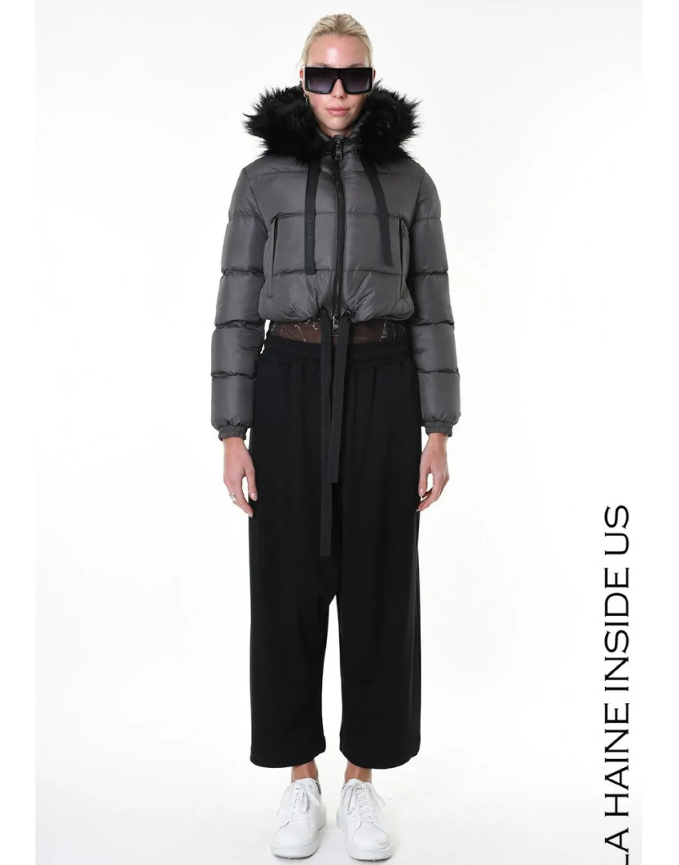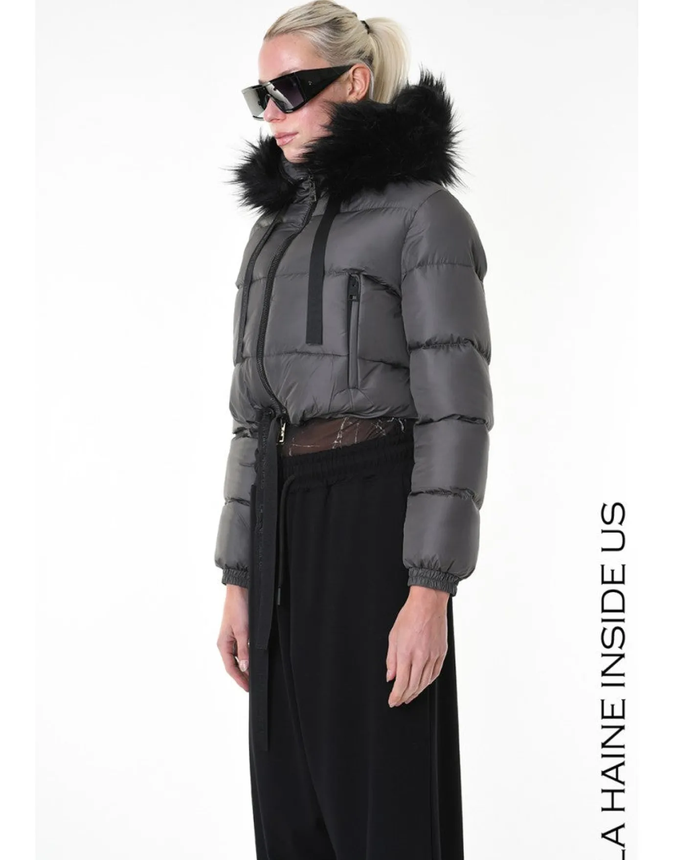 Expertly crafted with padded nylon and filled with luxurious down, the Fango Grey Puffer Jacket is the ultimate in winter warmth. Its double slider zip closure, zip pockets, andDrawstring detailing add functionality and style, while the oversized hood with removable faux fur ensures maximum comfort