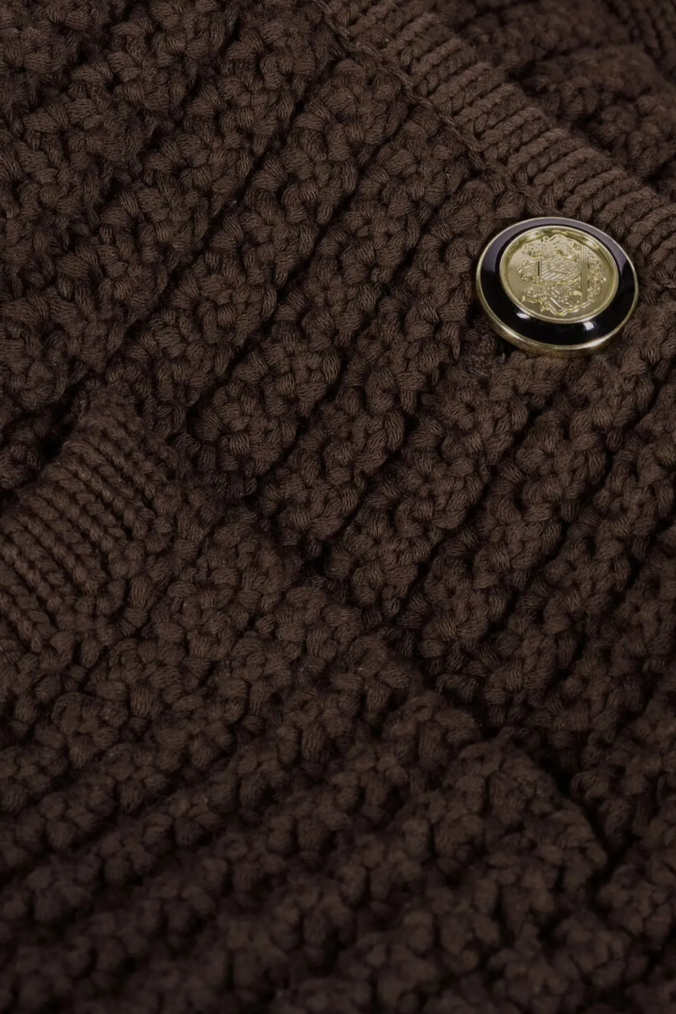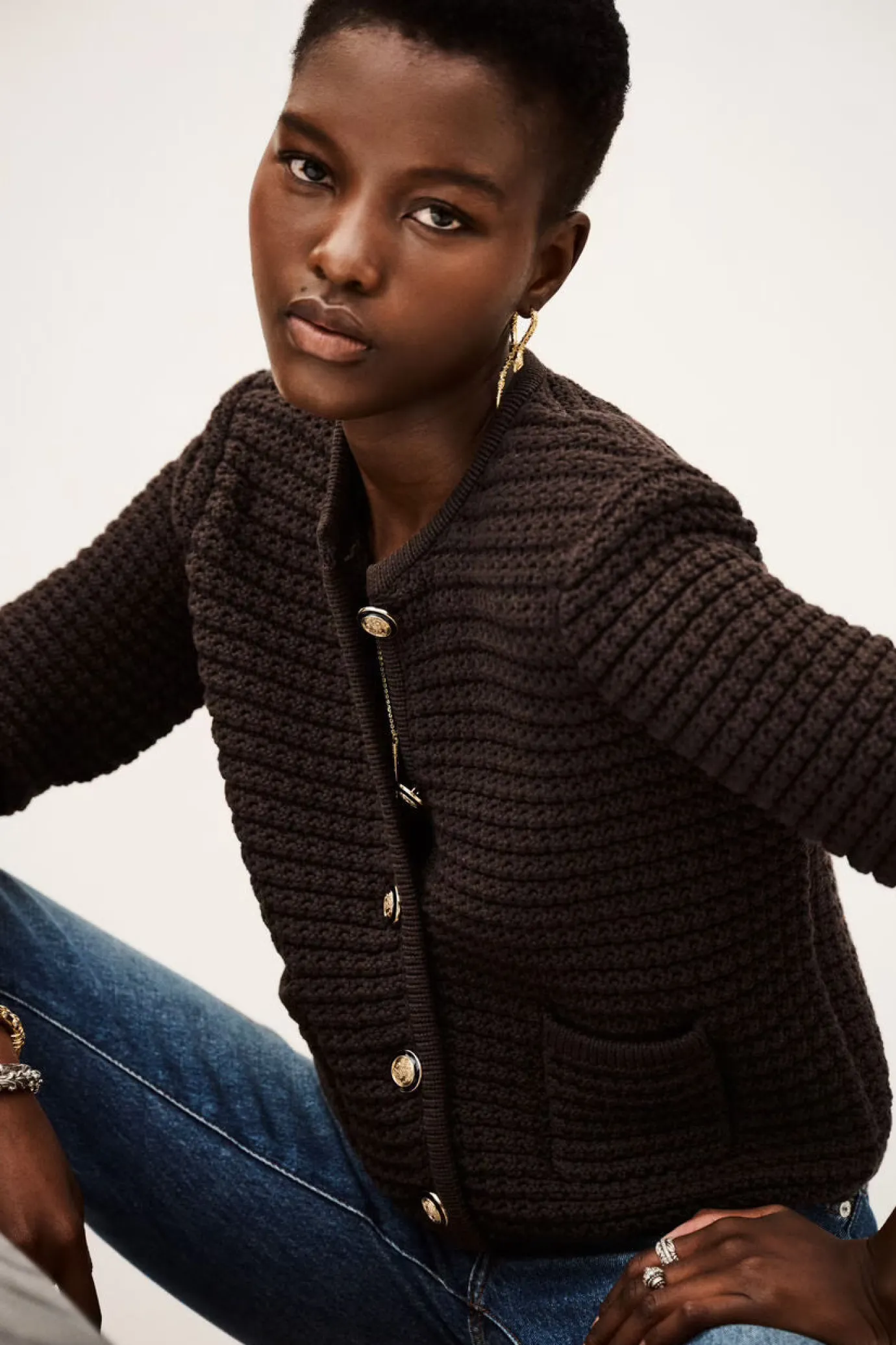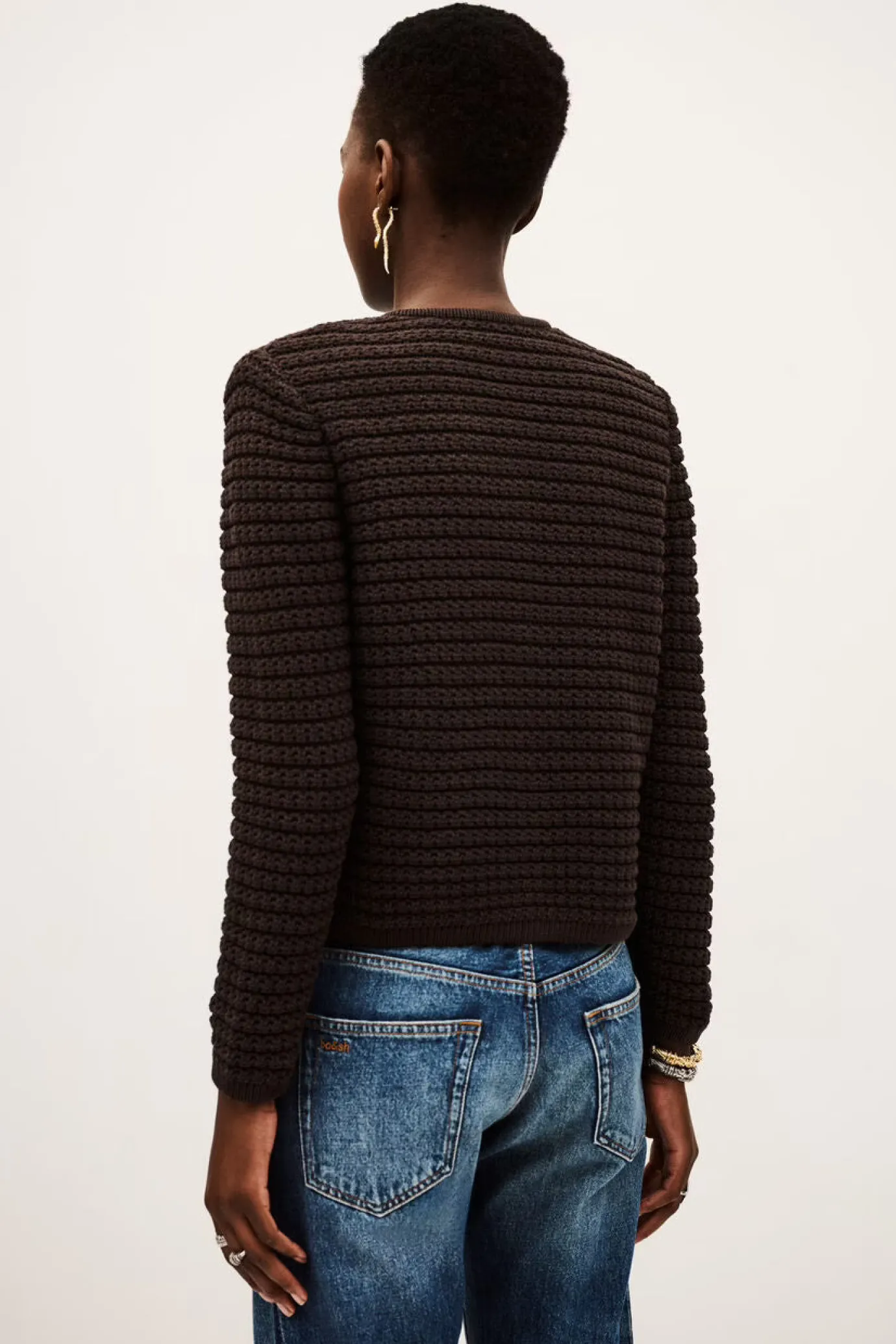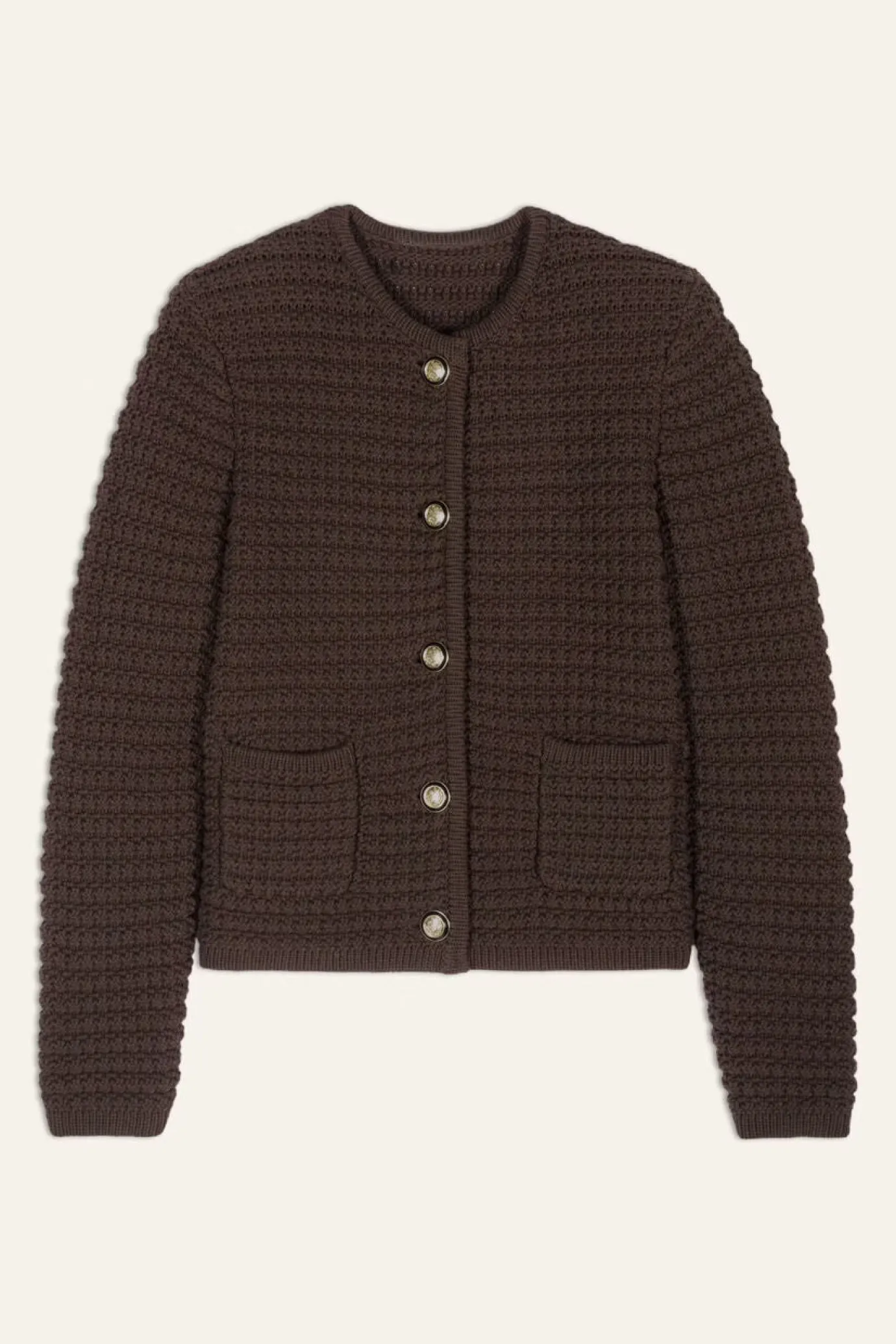 The Gaspard Chocolate Knit Cardigan by Ba&Sh blends the elegance of a designer jacket with the comfort of a knitted piece. Featuring a round neck, cropped sleeves, and structured shoulder pads, it offers a refined silhouette perfect for spring. The technical knit with a tweed-like Ottoman stitch adds texture, while gold and black coat of arms buttons and practical pockets complete the look. Crafted in a soft knit, this cardigan combines style and comfort effortlessly.