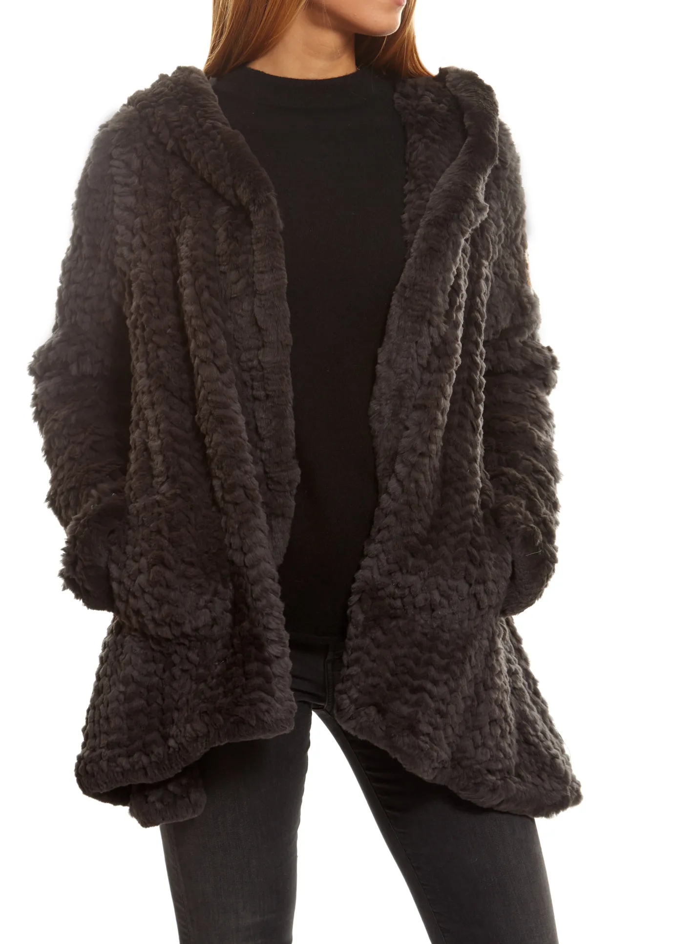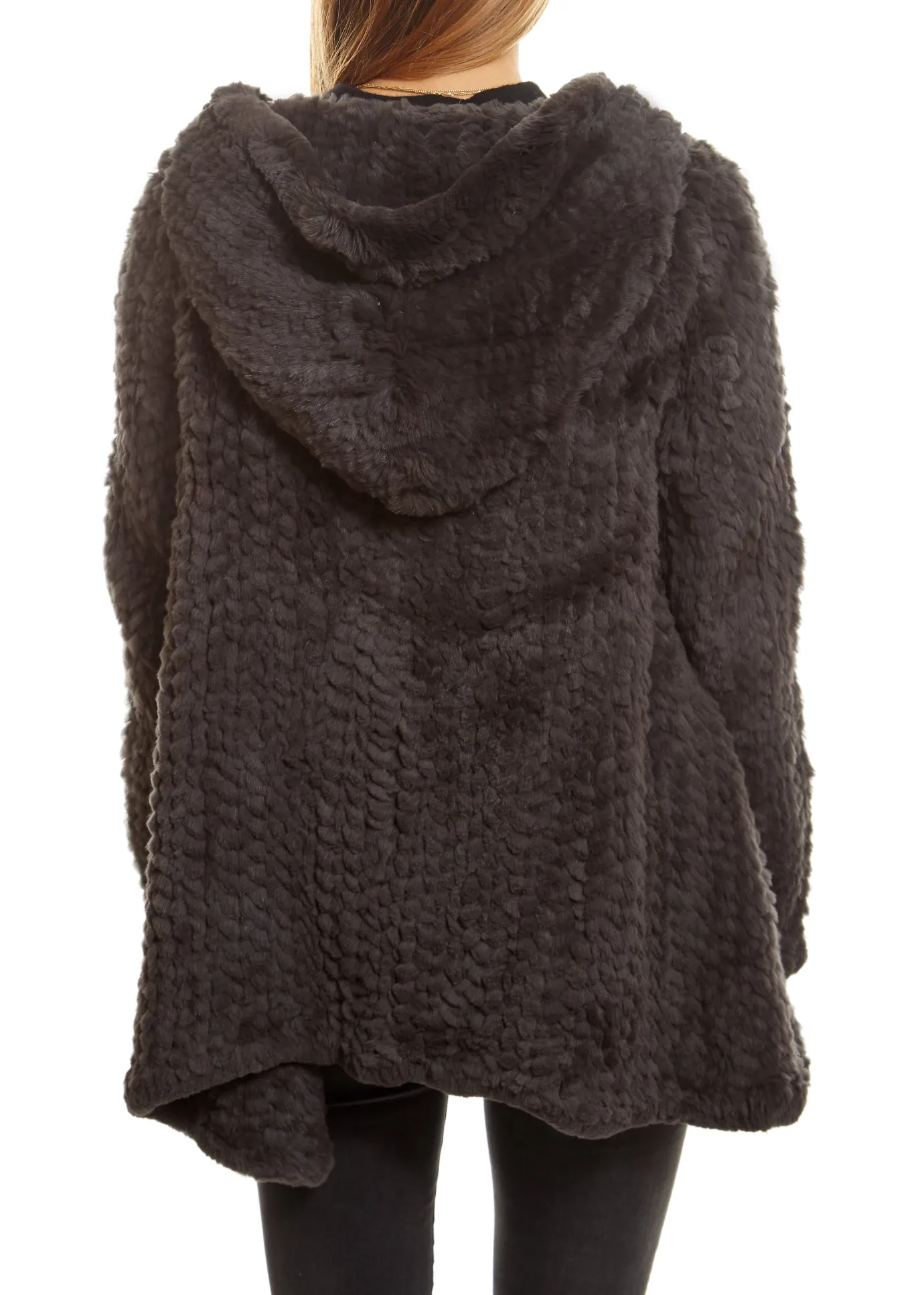 Grey Knitted Real Rex Rabbit Fur Fluted Hoodie by brand ‘Jessimara fur’ features long sleeves, a hood, pockets on either side and a fluted shape.