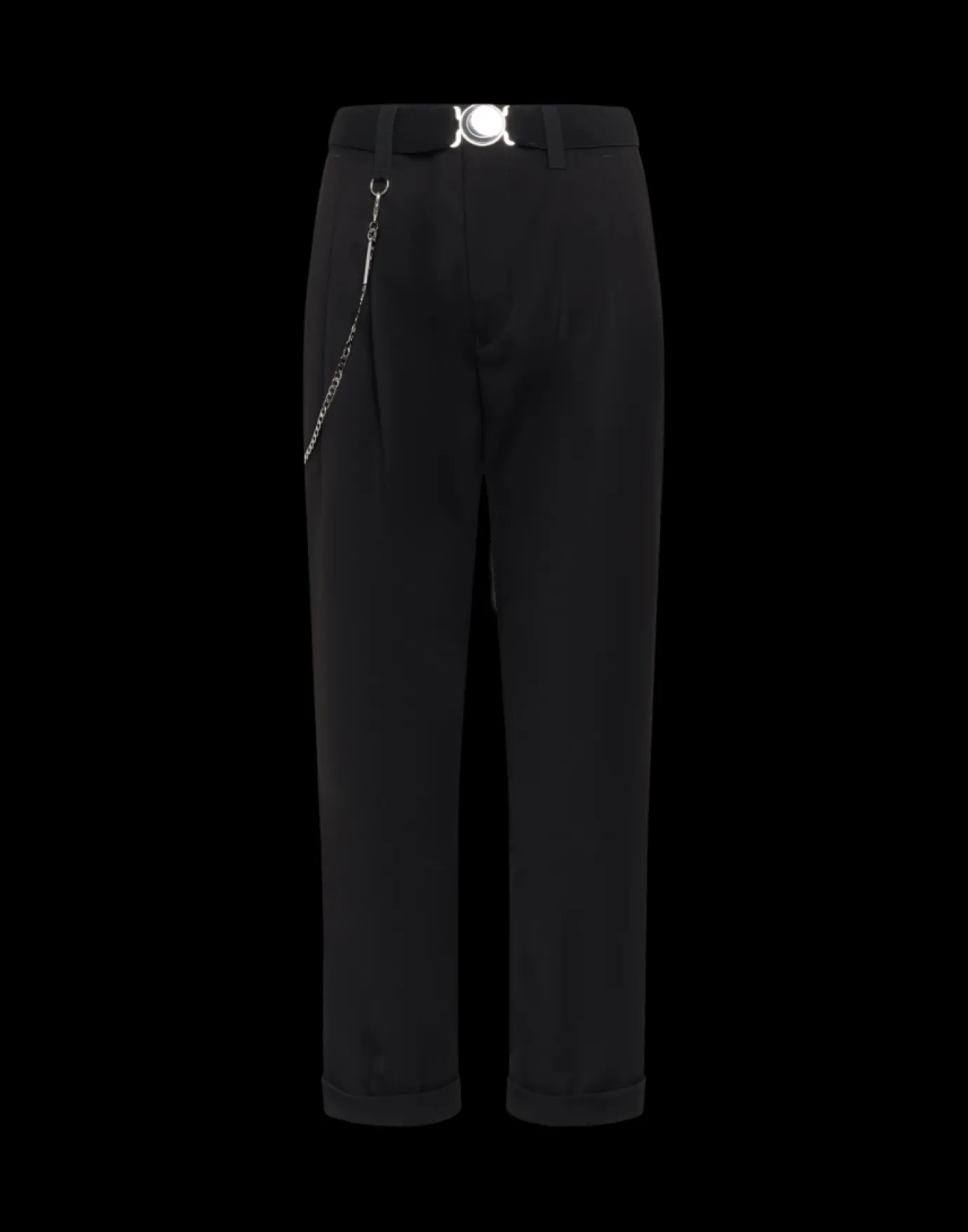 High Courage Trouser Black. A sharp, clean, tapered mid-rise stretch pant crafted in a soft tech fabric. Features a waistband with belt loops, a front button over silver metal zip fly fastening. Slanted side pockets on fronts with double pleats and centre crease. A tapered leg with turn-ups. The reverse has welt pockets with button-down flaps. Complete with a silver metal hip chain accessory.