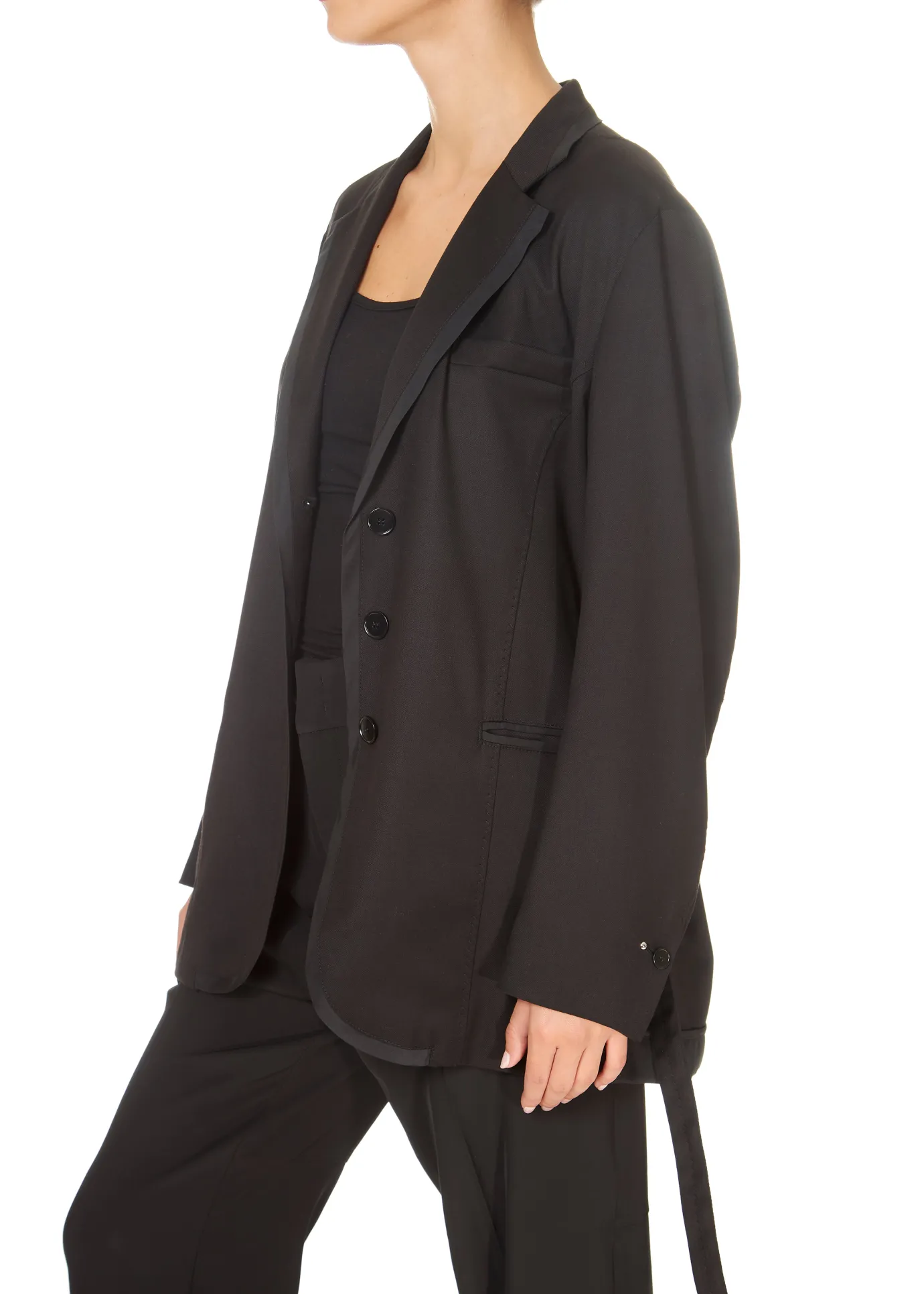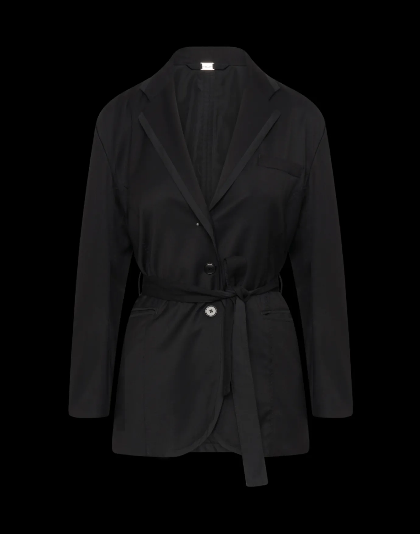 High Talent Belted Blazer Black. A fully lined, soft, unstructured single-breasted jacket crafted in a technical twill. Features a collar, front button fastening and trimming in a matte polyester. Detailed with a faux welt breast pocket and horizontal jet pockets at the side. Long sleeves with split cuffs and a single button. Overstitched belt running through belt loops on the side and back for that waisted look. The reverse is complete with a centre seam, vent and back hem finished in an “inside-out” style.