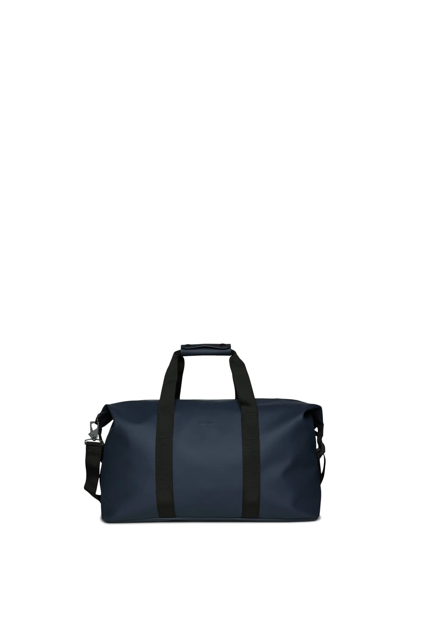 The fabulous weekend bag in navy from the stunning designer Rains. This is perfect for an overnight stay or the gym. Giving a contemporary feel to a classic easy-to-use bag. The bag features one single large compartment, webbed carry handles, a detachable shoulder strap and is finished with adjustable lock slider buckles. The bag is crafted from the Rains signature 100% waterproof fabric.