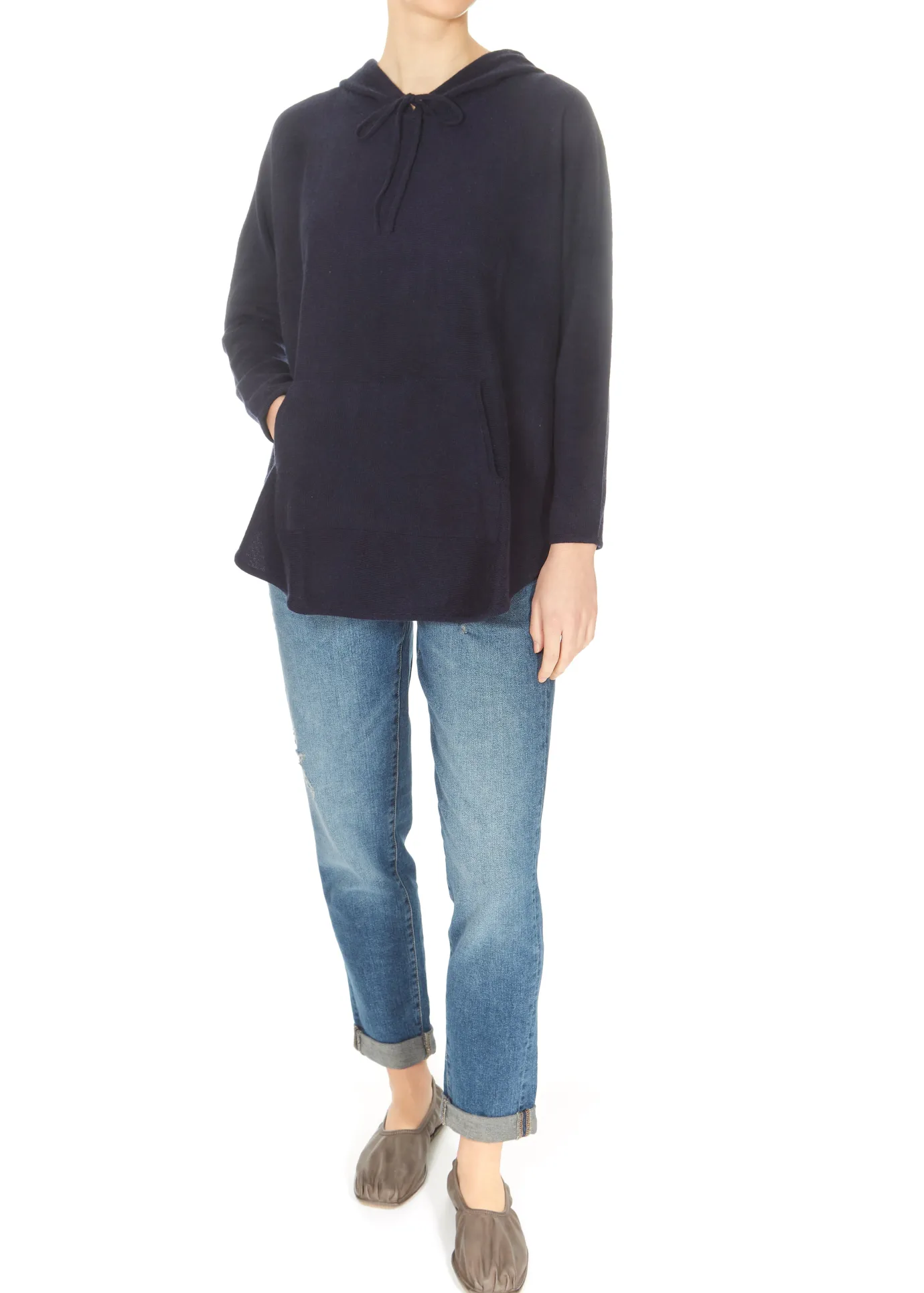 Jessimara Knitwear Harper Navy Pullover Hoodie. Crafted from a mix of cashmere and wool. Features long sleeves, an oversized fit, a large front pocket, a hood and a dropped hem. A wardrobe essential for you. A versatile hoodie which is easy to layer and style up or down. Available in other colours.