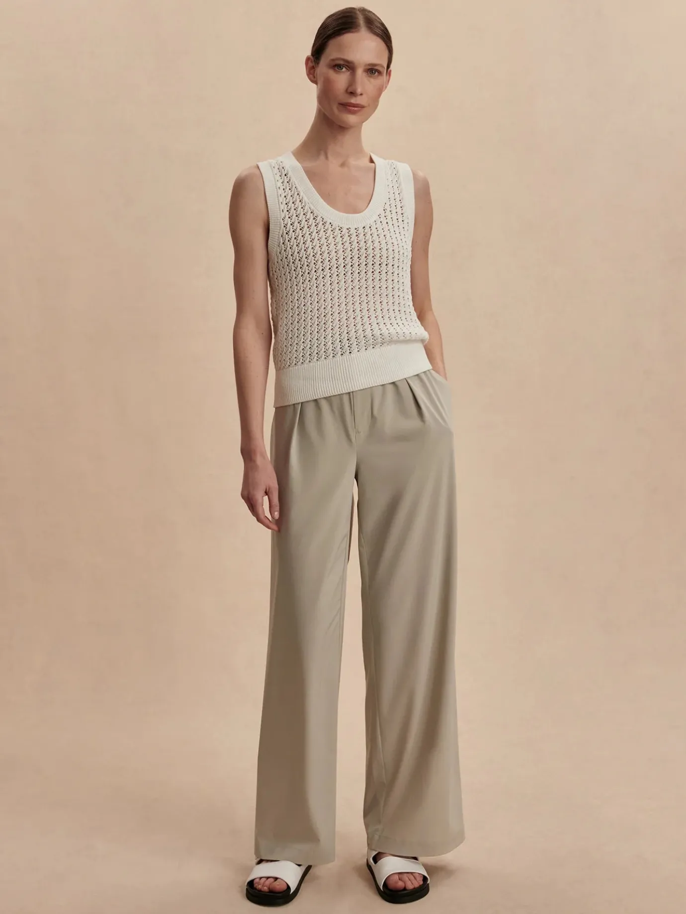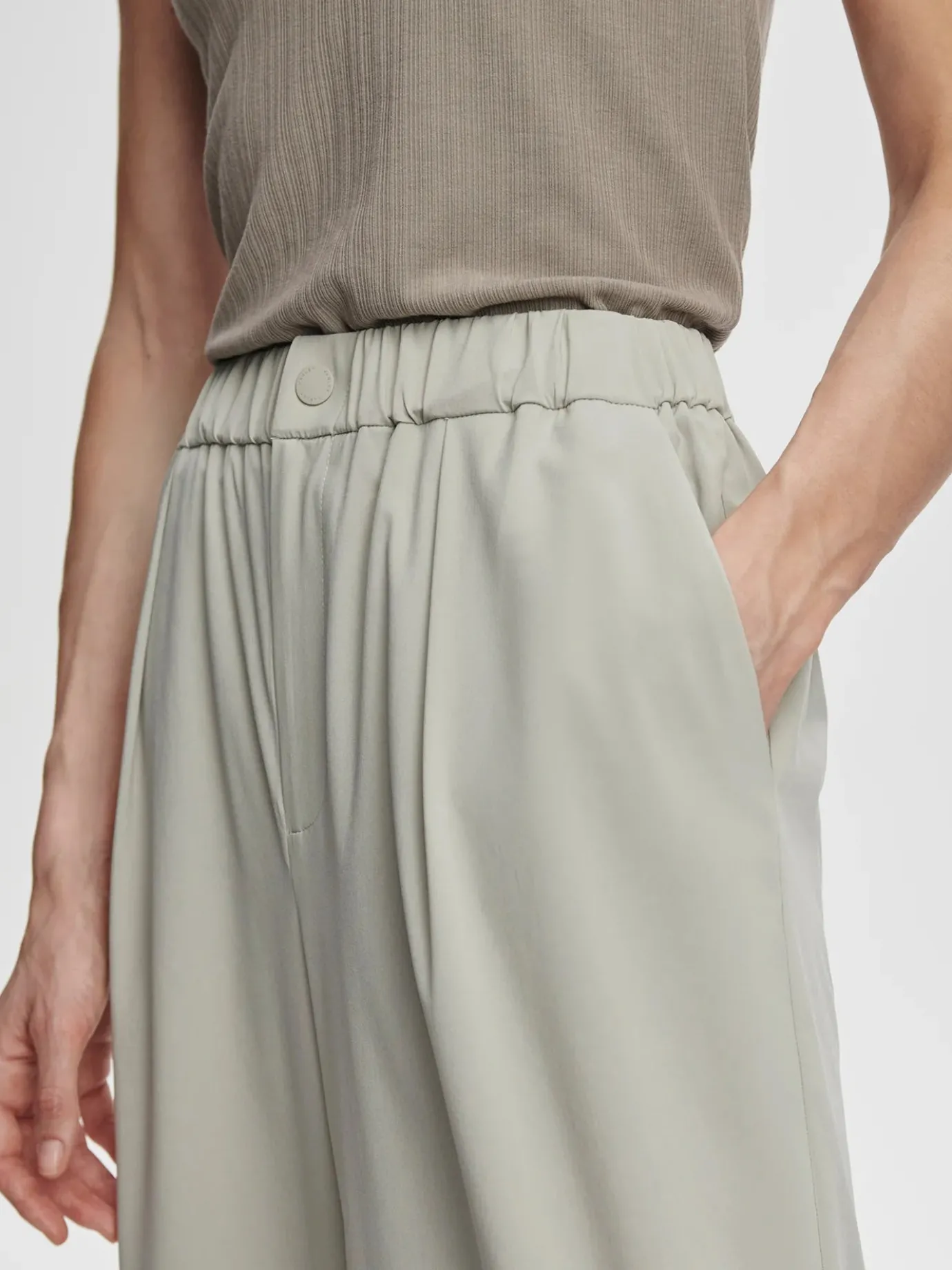 Elevate your wardrobe with these sophisticated Kayson wide leg pants from designer Varley. The contemporary silhouette features elegant front pleating and a flattering wide leg cut that creates a stunning silhouette. Crafted in a versatile sage grey, these lightweight pants transition effortlessly from office to evening. The secure snap and zip fastening ensures a perfect fit while maintaining a sleek profile. A modern essential that pairs beautifully with everything in your closet.