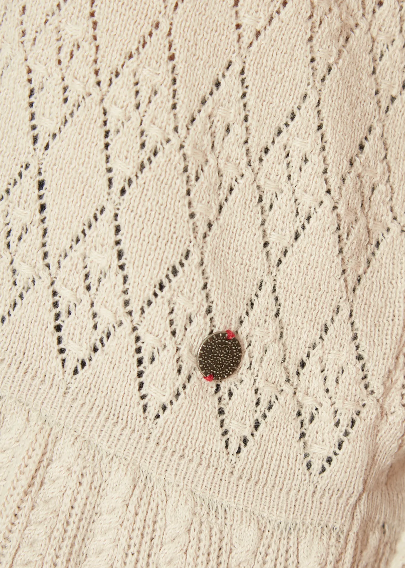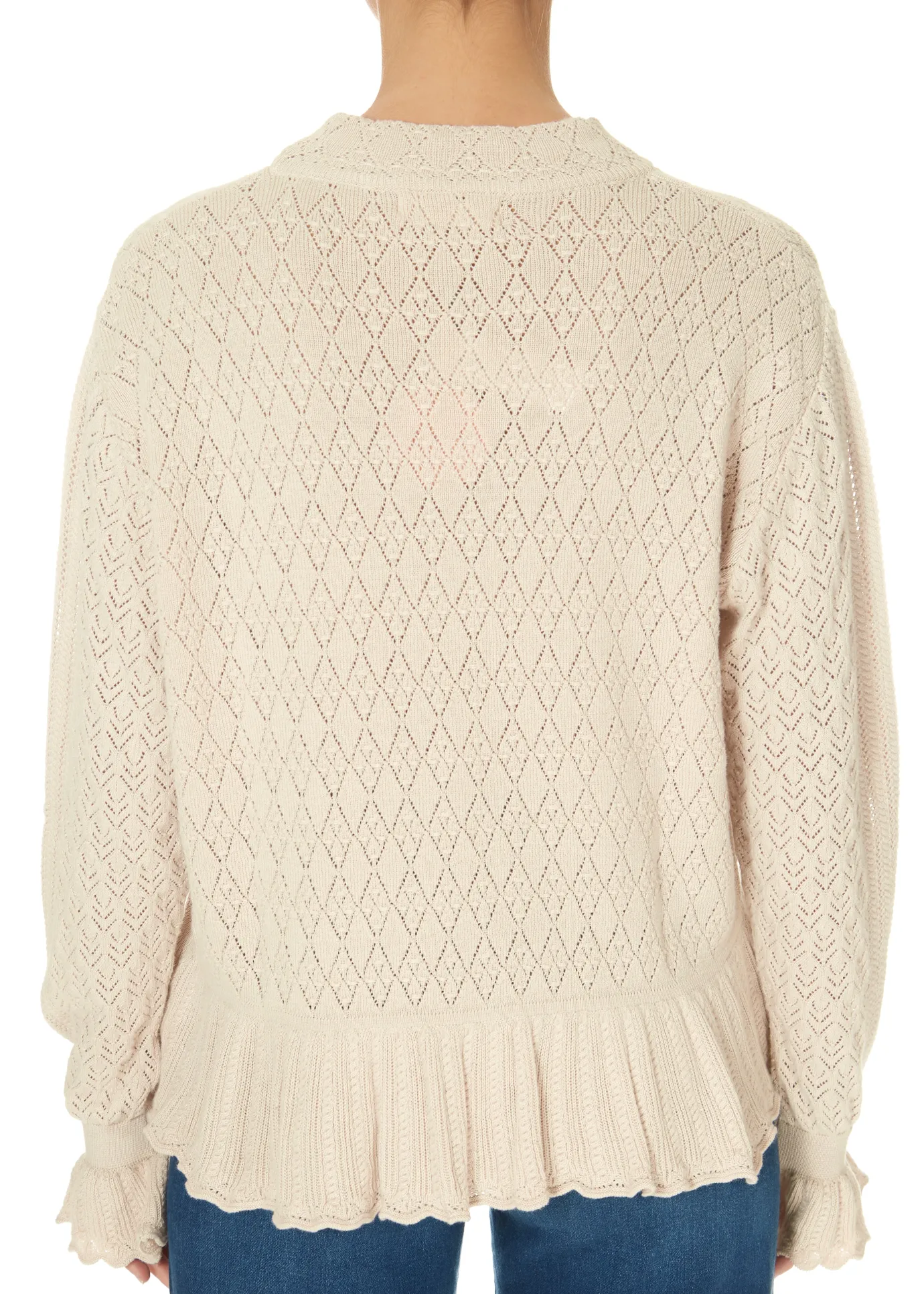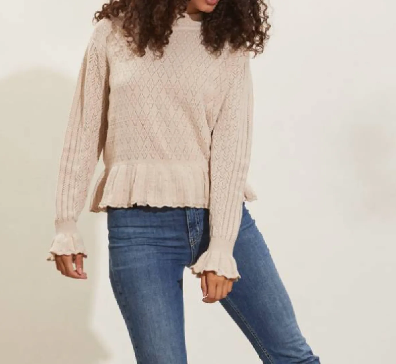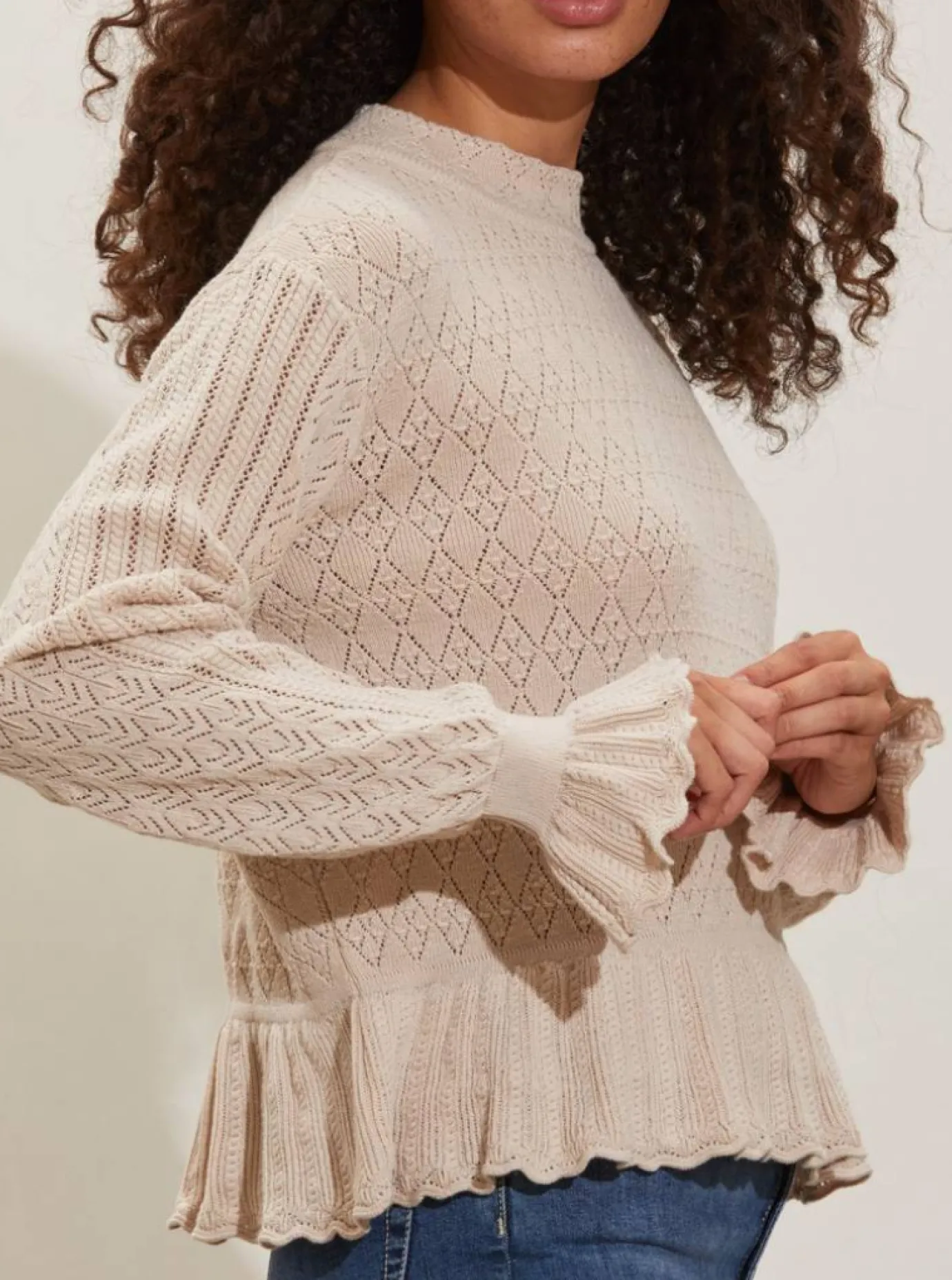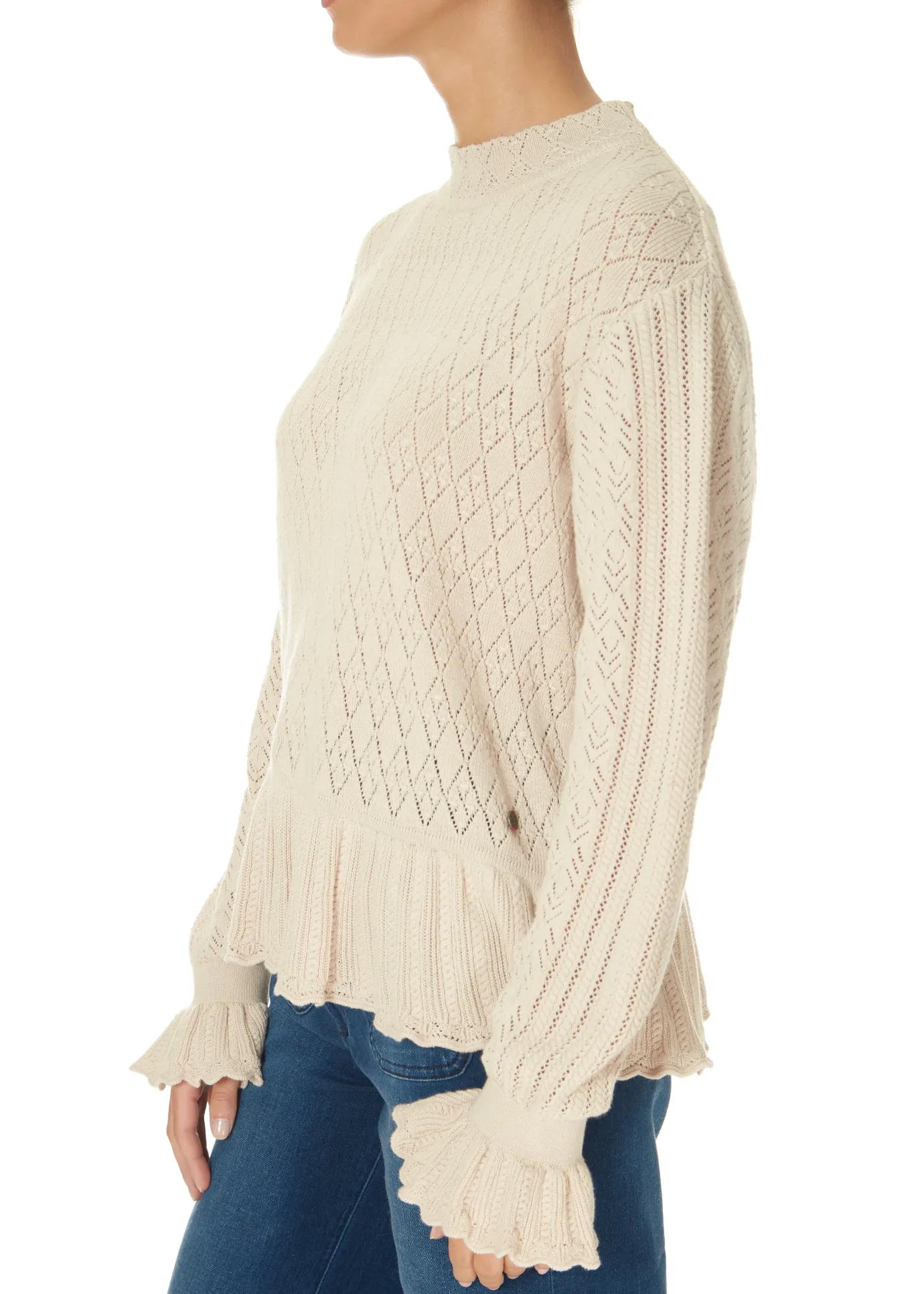 Odd Molly Eden High Neck Sweater in Porcelain. A pointelle knitted light cosy sweater, with a high neck, crafted from organic cotton. Features full-length sleeves with fluting and frill details at the waistline edge and around the cuffs. A simple, soft, sweet feminine knit.