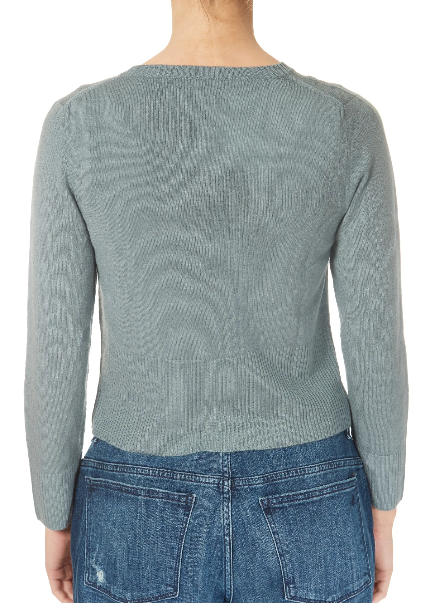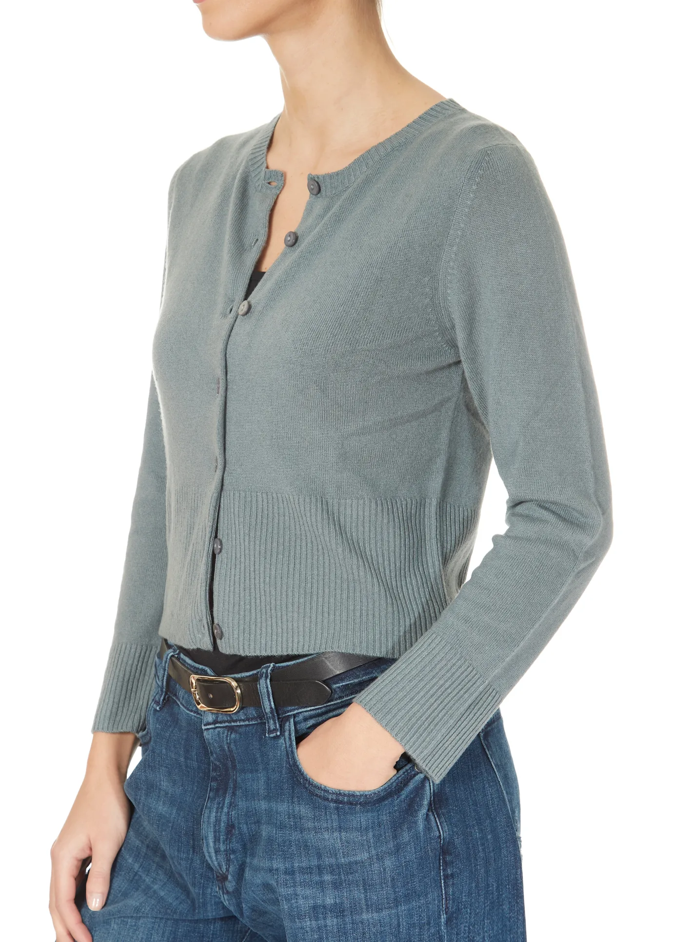 This is the ‘Short ribbed cardigan’ by ‘Jessimara Knitwear’. It features a round neckline, long sleeves and button closures down the centre front. Around the bottom edge and the cuffs on each sleeve it features a ribbing detail.