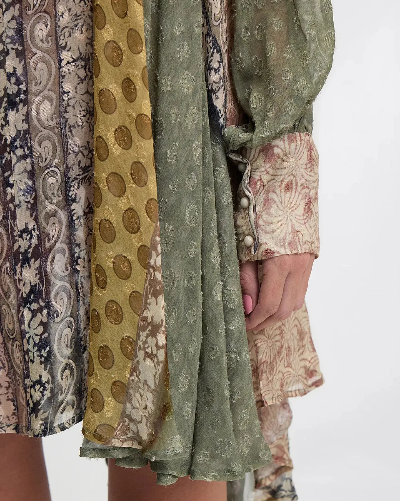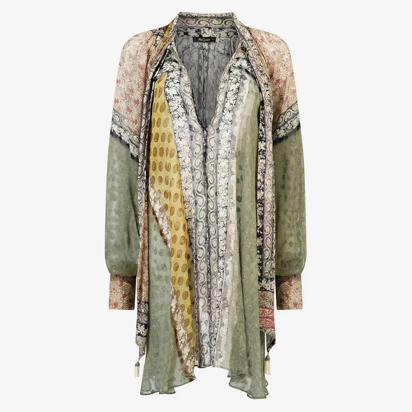The Sienna dress by french designer Mes Demoiselles is a cool addition to your wardrobe. The dress is made in a fabulous jacquard patch viscose print of khaki and ochre tones. The dress features a wide cut that offers ease on the body, allowing you to move freely while remaining chic. The dress has long sleeves and can be worn as a short dress or tunic. This can be worn casually or for a special evening out. Eye catching and a boho feel.