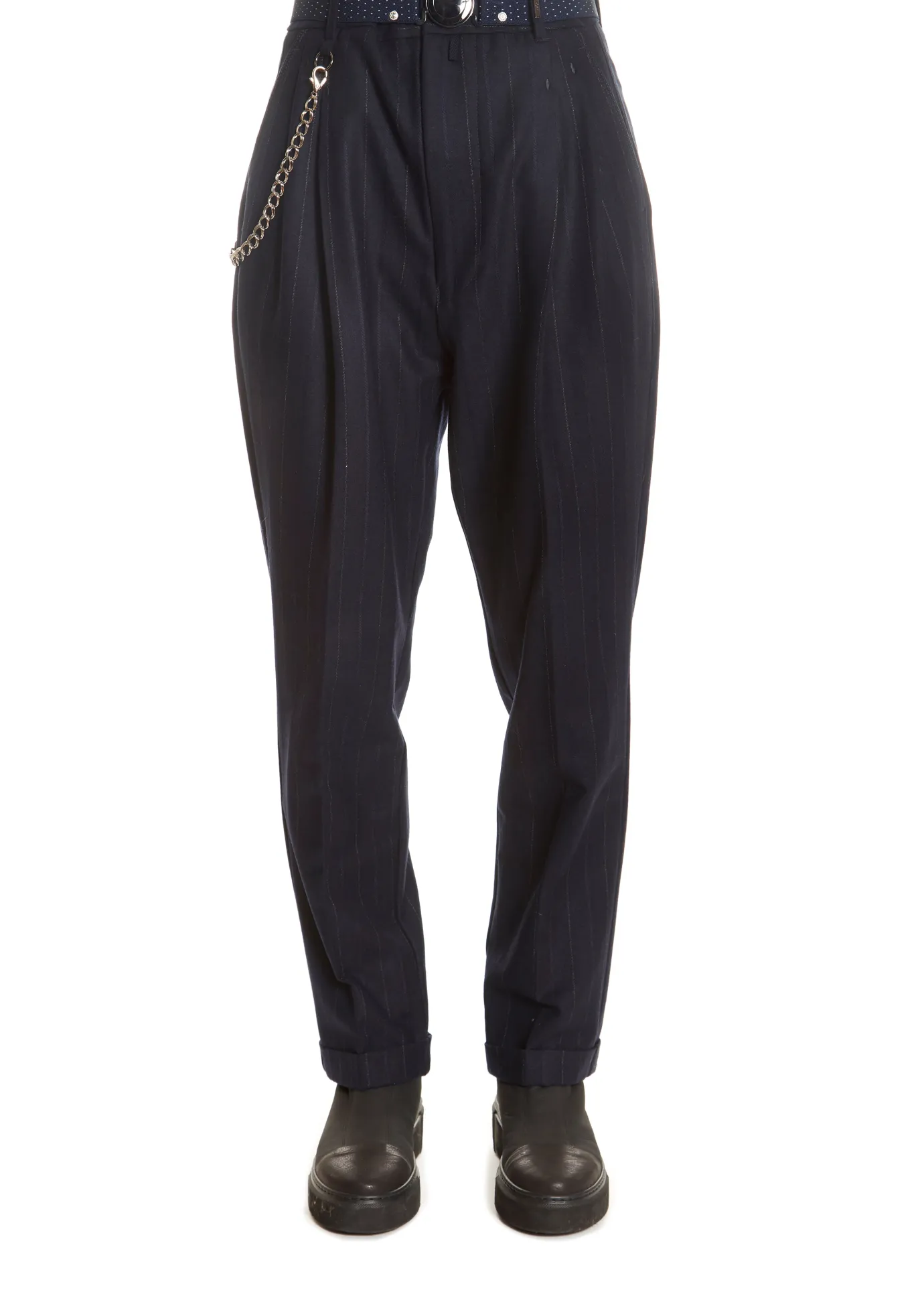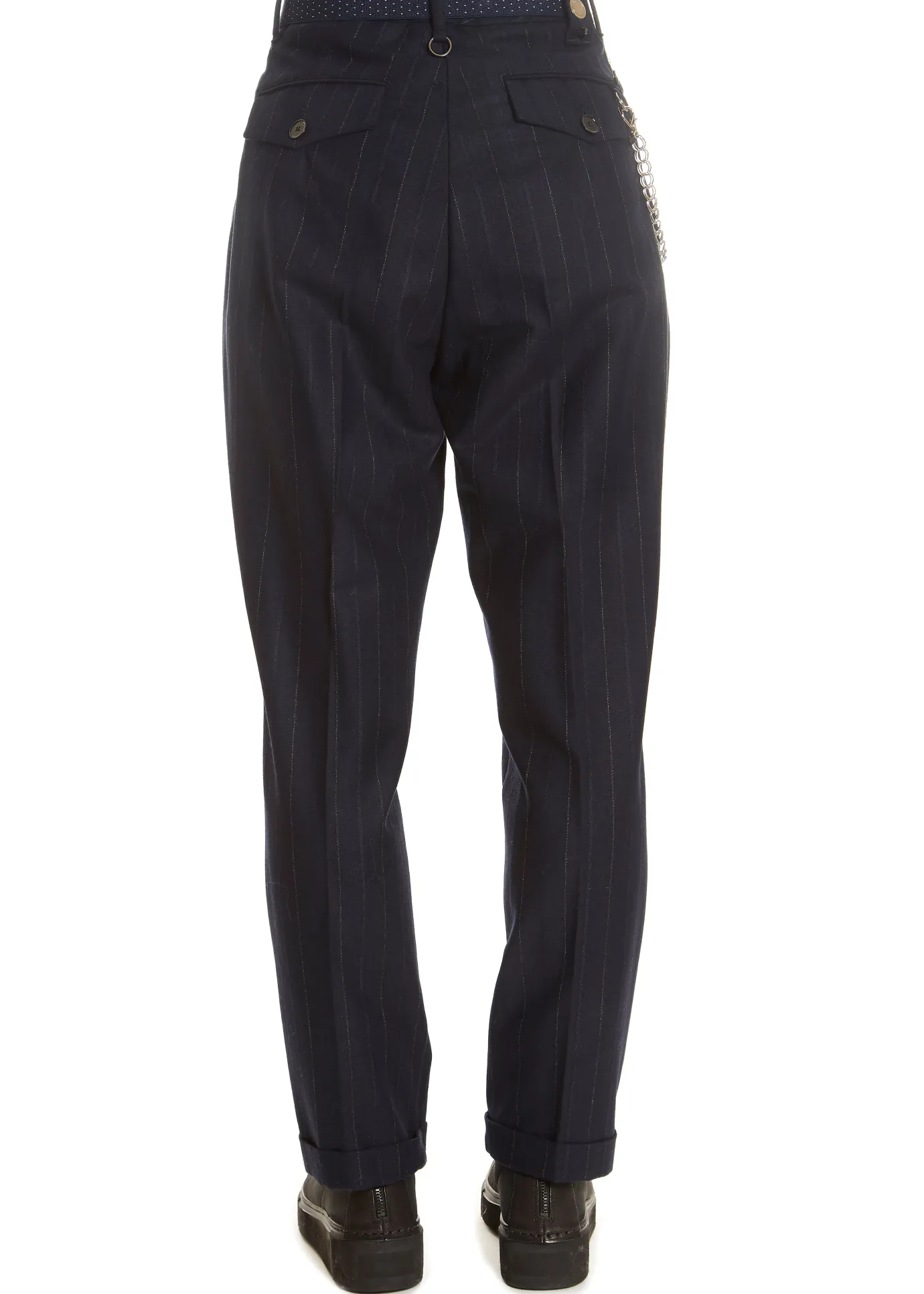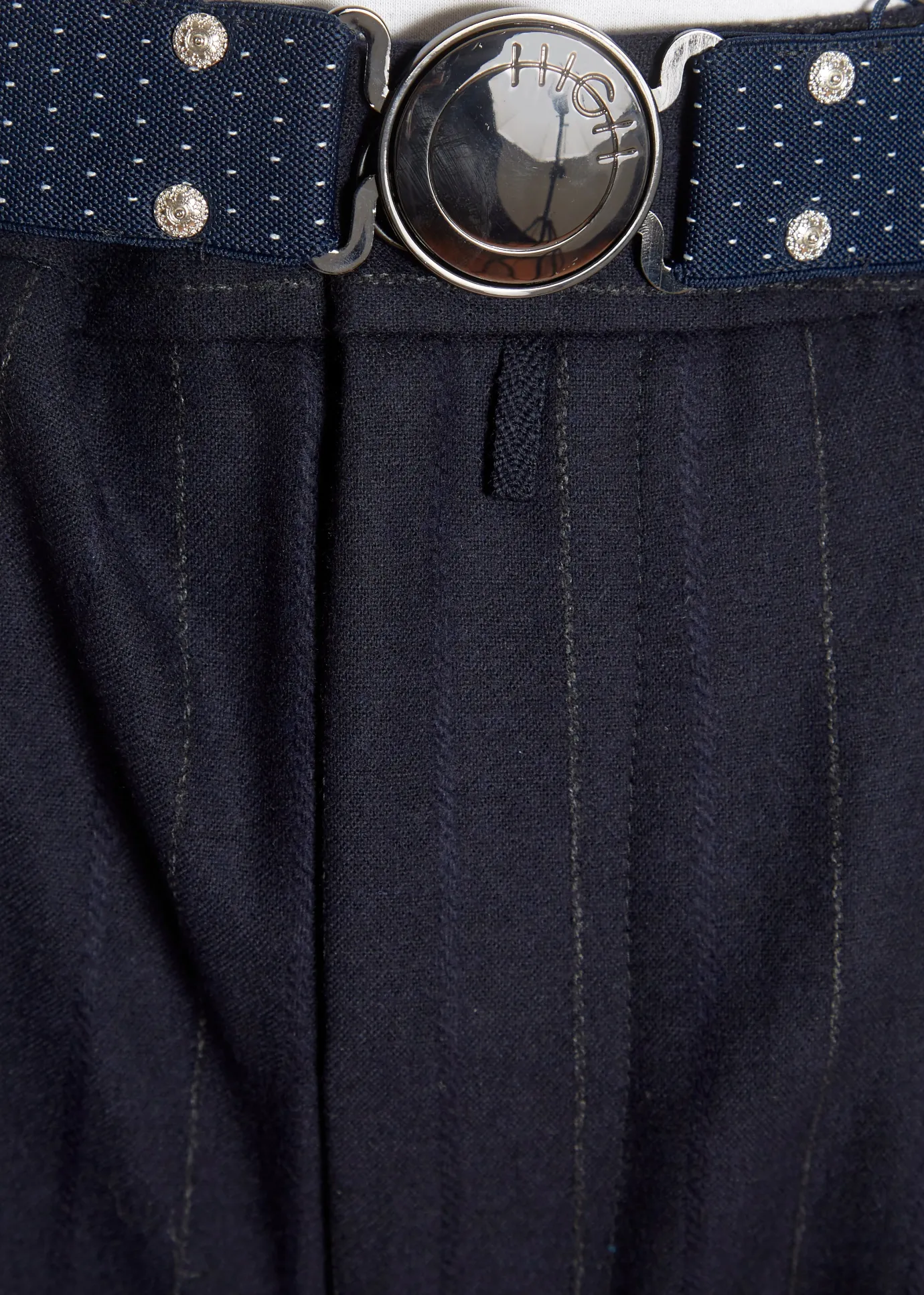 This is the ‘Sneek’ Navy Pinstripe Suit Pant by our friends at HIGH Couture! Sharp, clean pants in wool and cotton mix wide navy twisted pinstripe with fixed waistband with belt loops fastened by a single navy button over a silver metal zip fly front. Worn with navy mini-dot stretch elastic belt with HIGH disc buckle. Slanted side pockets. Front has double pleat with front and back centre crease. Reverse has buttoned flap back pockets. Tapering leg with turn-ups.