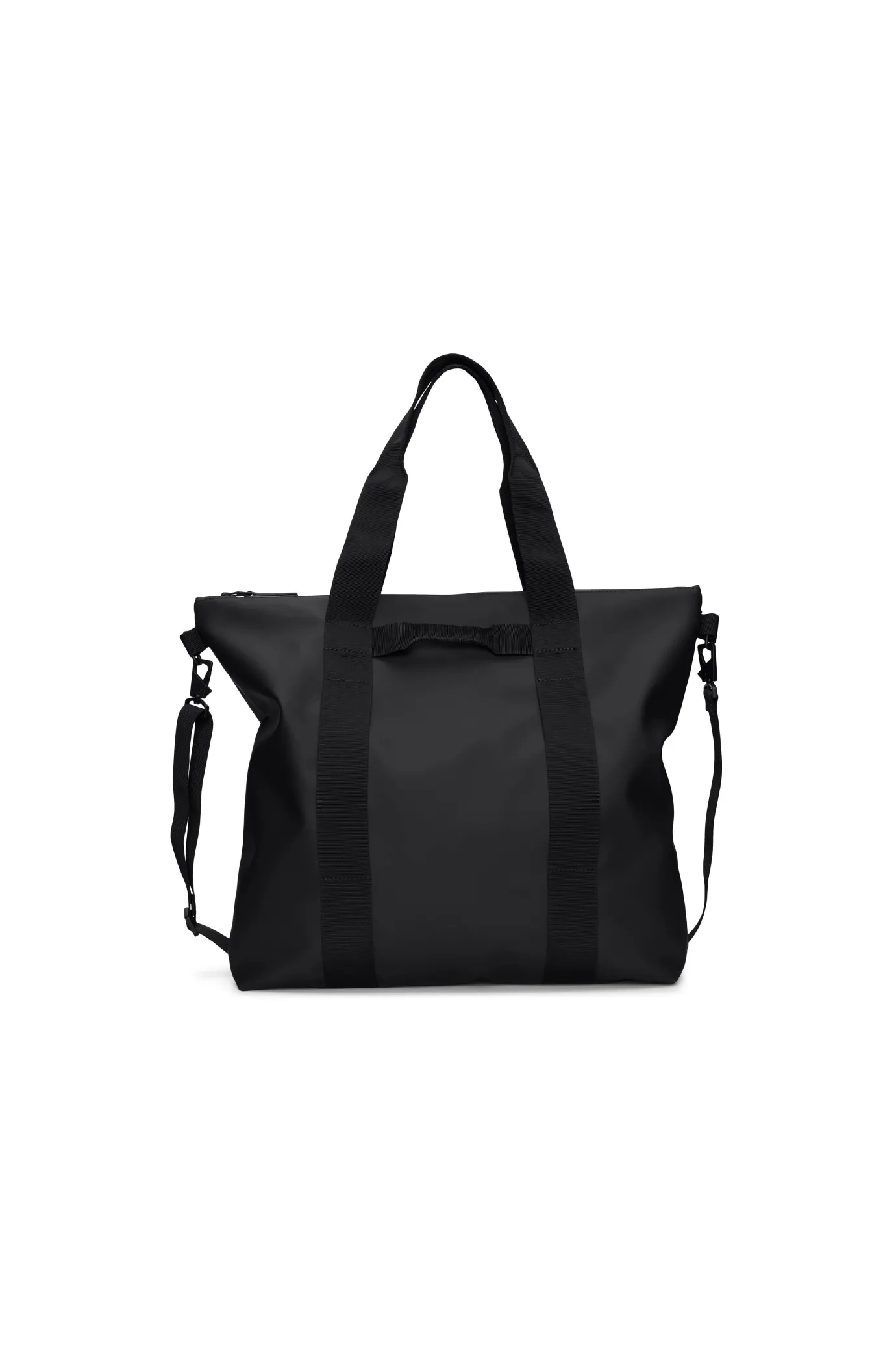 Introducing the RAINS Tote Bag in Black. A waterproof tote bag that is perfect for everyday shopping, commuting, or the workplace. It has a utilitarian look and a smooth feel, with a full-length coated zip, spacious main compartment, zip pocket, and numerous carrying solutions, including a detachable shoulder strap and extended hand/shoulder straps offer convenient carrying as well as a side-mounted grab handle. Make your life easier with this powerful and stylish bag!