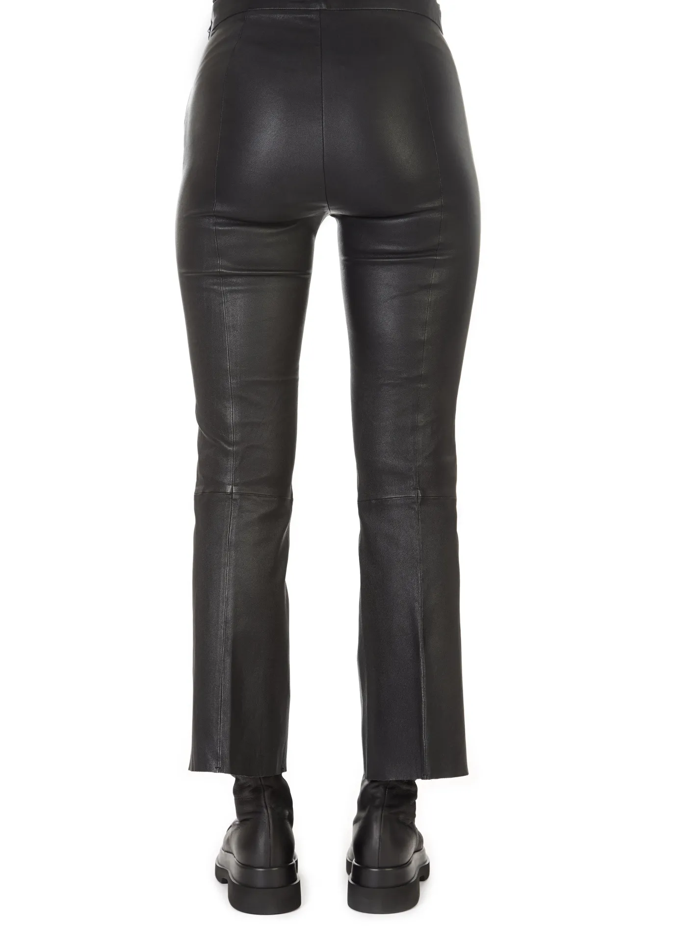 This is the ‘Tyson’ Crop Flare Leather Trousers by our friends at Dante6. The Dante6 Tyson cropped leather pants in black are made of soft stretch nappa leather and fall just above the ankles. Closes with a zipper at the left side and has a side pocket on the right side. Combine with a blouse for a chic appearance or with a sweater for a more casual look.