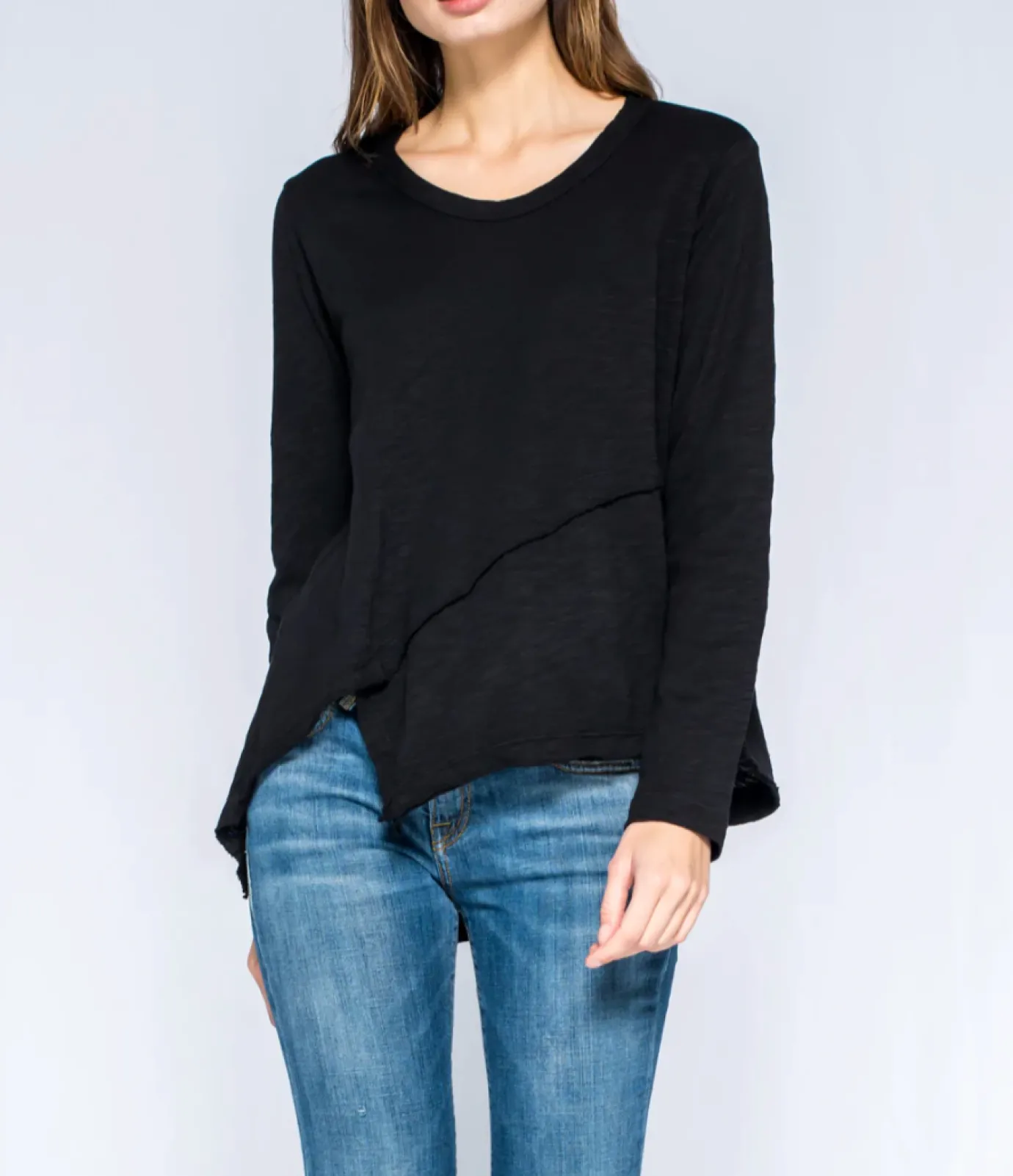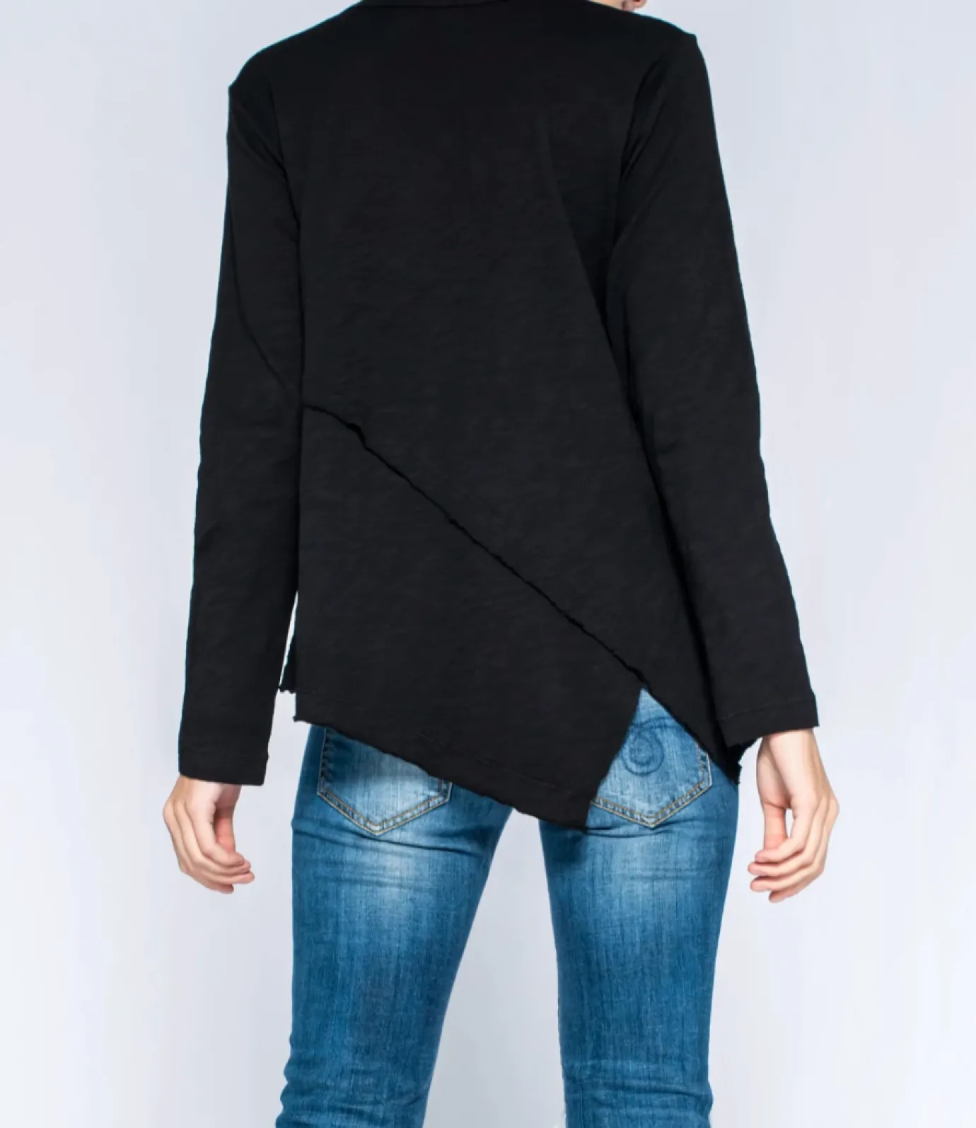 This is the ‘Crossover’ hem black top by the stunning brand Wilt. The Crossover is a great flattering sweater that is sure to keep you warm. It has a mock hem and full length sleeves.