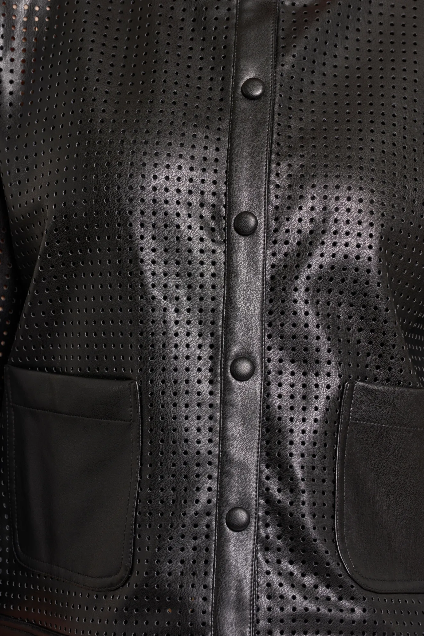 Discover understated luxury with this Rino & Pelle design. The Abou Birch Perforated Jacket in black showcases contemporary craftsmanship through its perforated faux leather construction, creating visual interest with strategic ventilation. Featuring a structured silhouette with a cropped cut, this jacket maintains its shape while remaining remarkably soft to the touch. Practical details include a button closure, two front pockets, and subtle sleeve slits that enhance movement without compromising the refined aesthetic. The airy perforations add dimension to the black tone, making it an versatile layering piece that transitions effortlessly across seasons and occasions.
