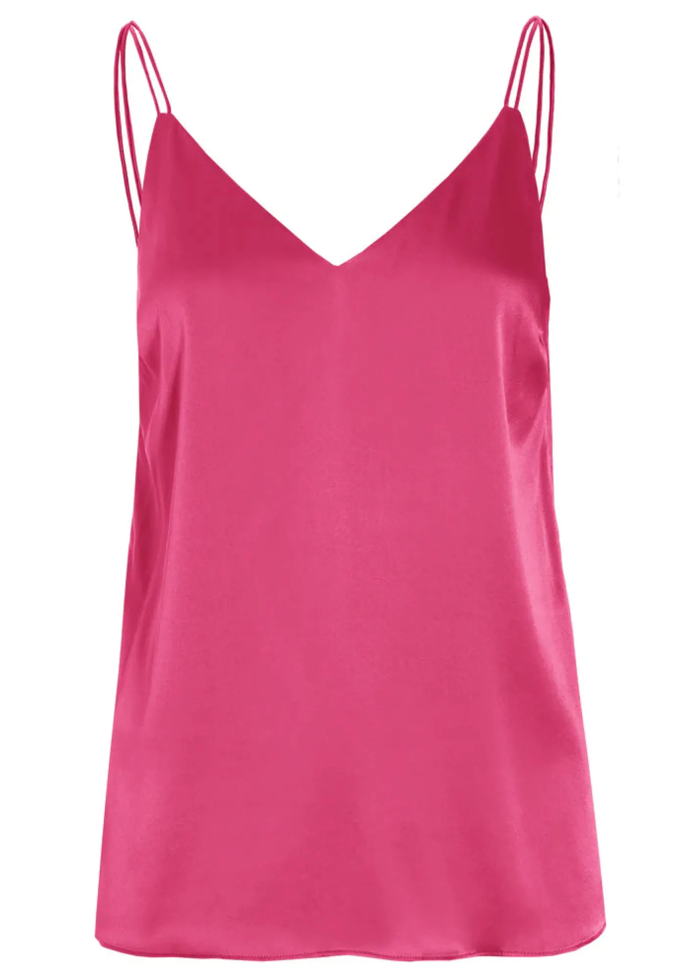 Dea Kudibal Avena Silk Tank in fushia pink. The v-neck classic vest features thin double straps on both sides, and soft high-quality silk feel. Perfect for layering under blazers, shirts and blouses for a stylish and elegant night look or with a jean for a casual day look.