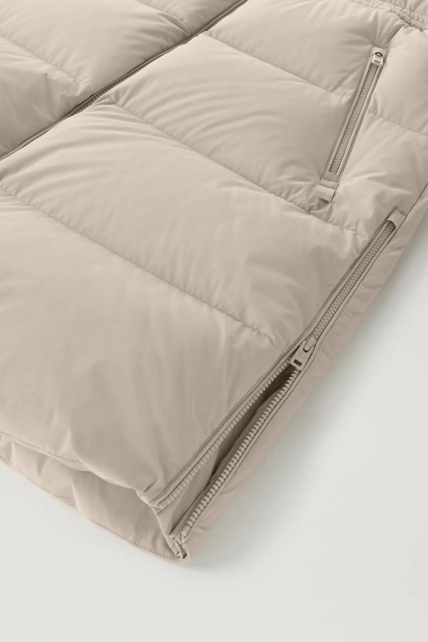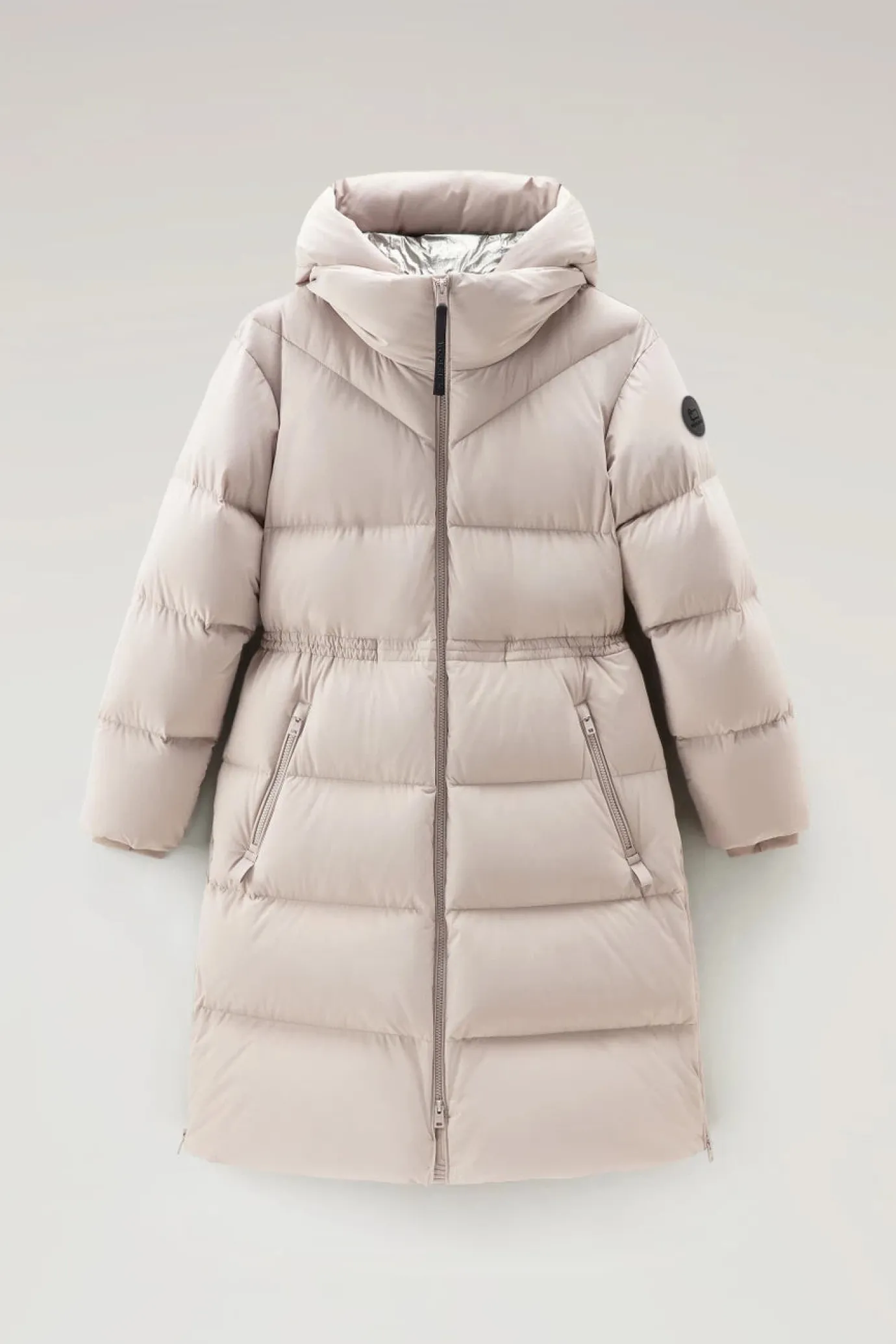 This warm and soft garment is essential for the cold season—a model with soft lines that combines style and performance. Made of stretchy, matte-finish nylon, it’s water and wind-resistant and padded with duck down. It features a detachable hood and an extra protective high collar. The internal drawstring at the waist allows you to adjust the fit, while the side zippers at the bottom make it perfect for layering. The garment has a button and zipper closure, two oblique zip pockets, an internal pocket, and elasticized cuffs with thumbholes, perfect for blocking the wind.