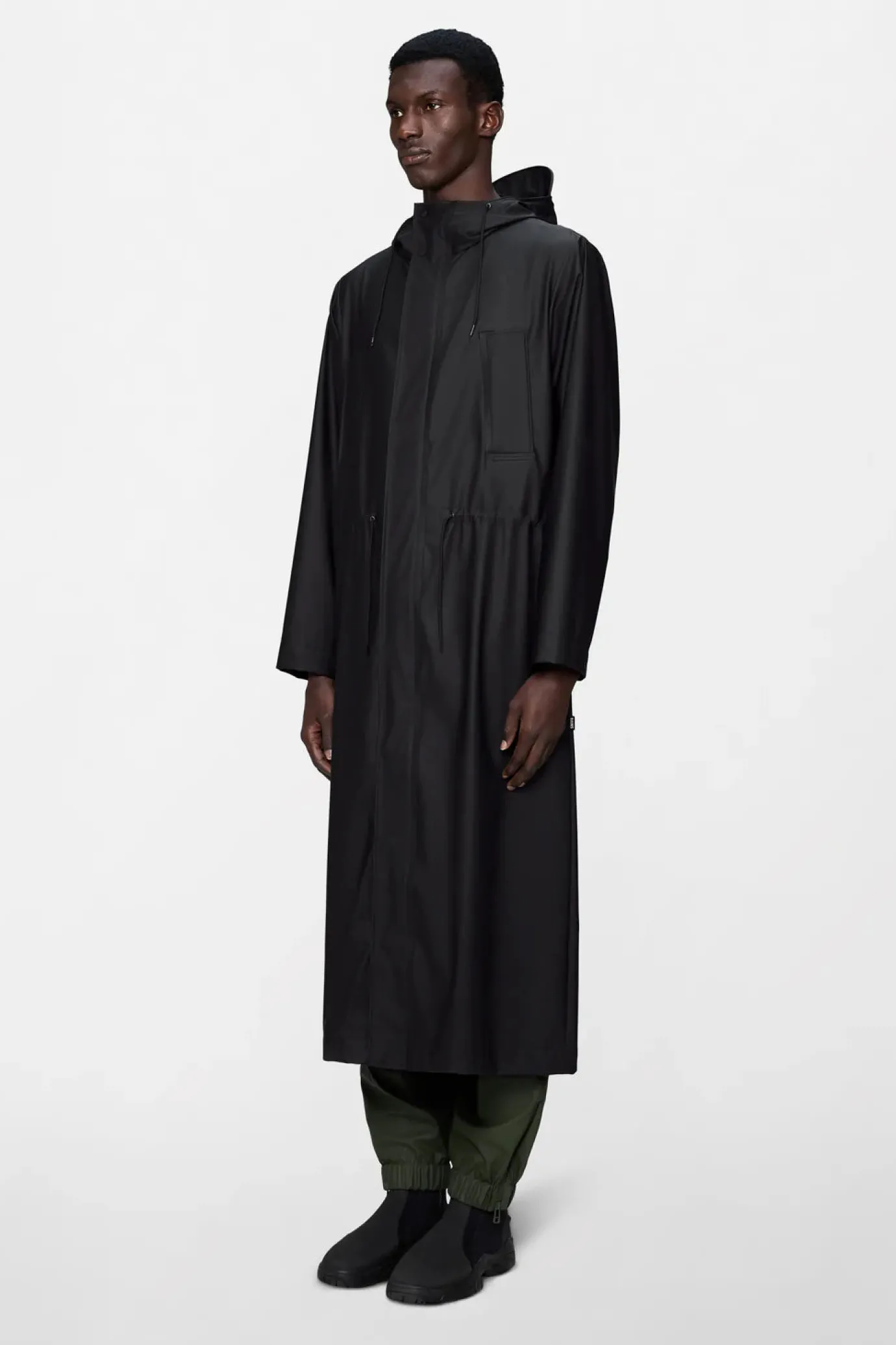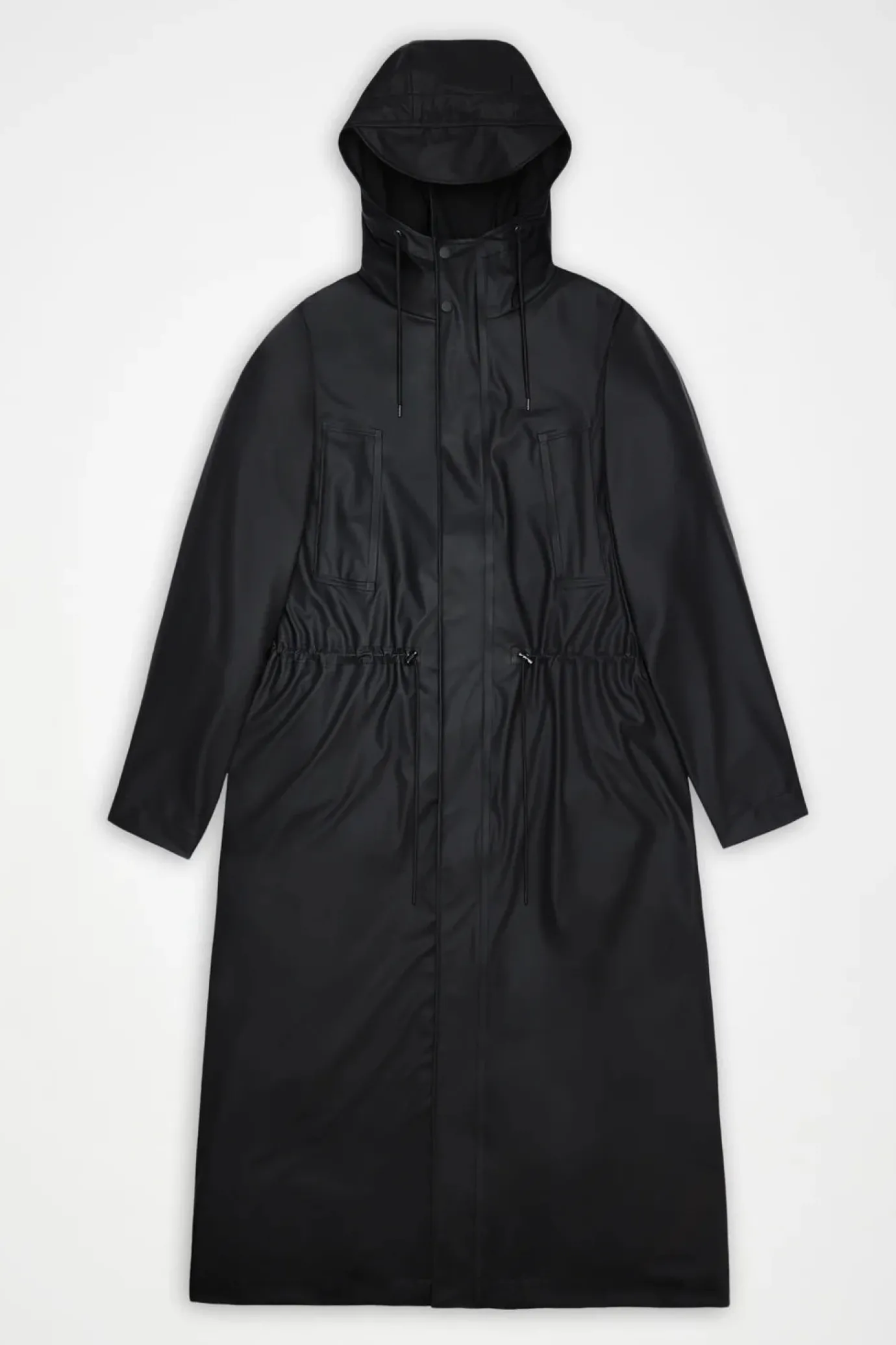 Make a statement with the Bold Longest Jacket, a unisex rain essential that transforms practical protection into fashion-forward design. This maxi-length parka features an exaggerated silhouette with courageous details: a drawstring hood, concealed snap closures, and a dramatic back yoke with breathable mesh lining. Stay dry and comfortable with the waist adjustment and generous welt pockets, while the elevated construction ensures you’ll turn heads navigating the city in style. This design is cut from Rains’ signature PU fabric and features welded seams. The finish is lightweight with a smooth feel.