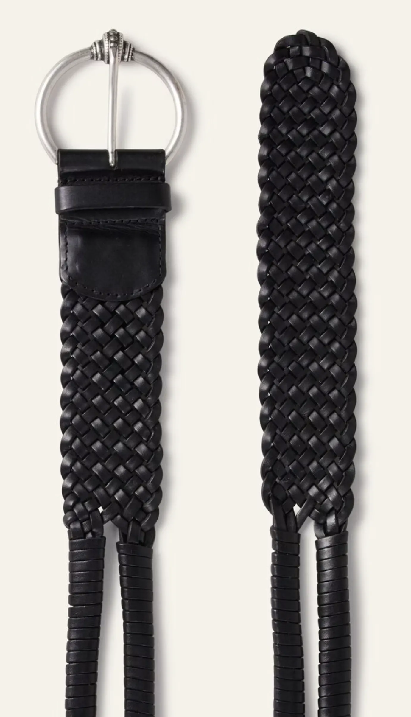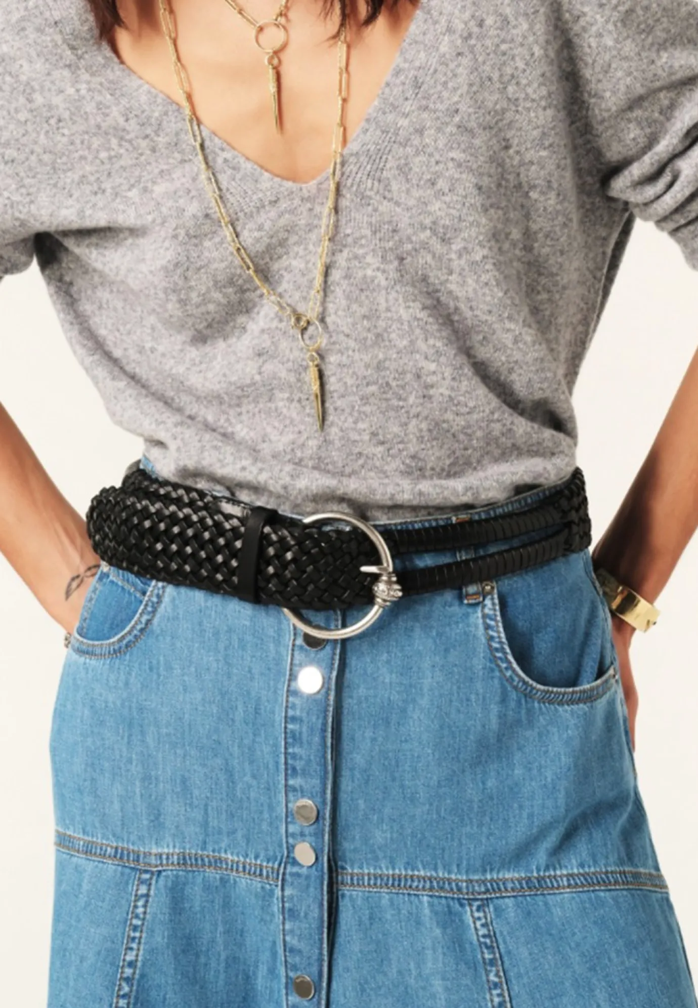 Elevate your outfit with the Brisbane Black Belt, expertly crafted in Spain from premium cowhide leather. Its timeless black woven design pairs beautifully with Ba&sh dresses, while the oversized buckle adds a sophisticated focal point. Perfect for defining your waist and enhancing your silhouette with understated elegance.