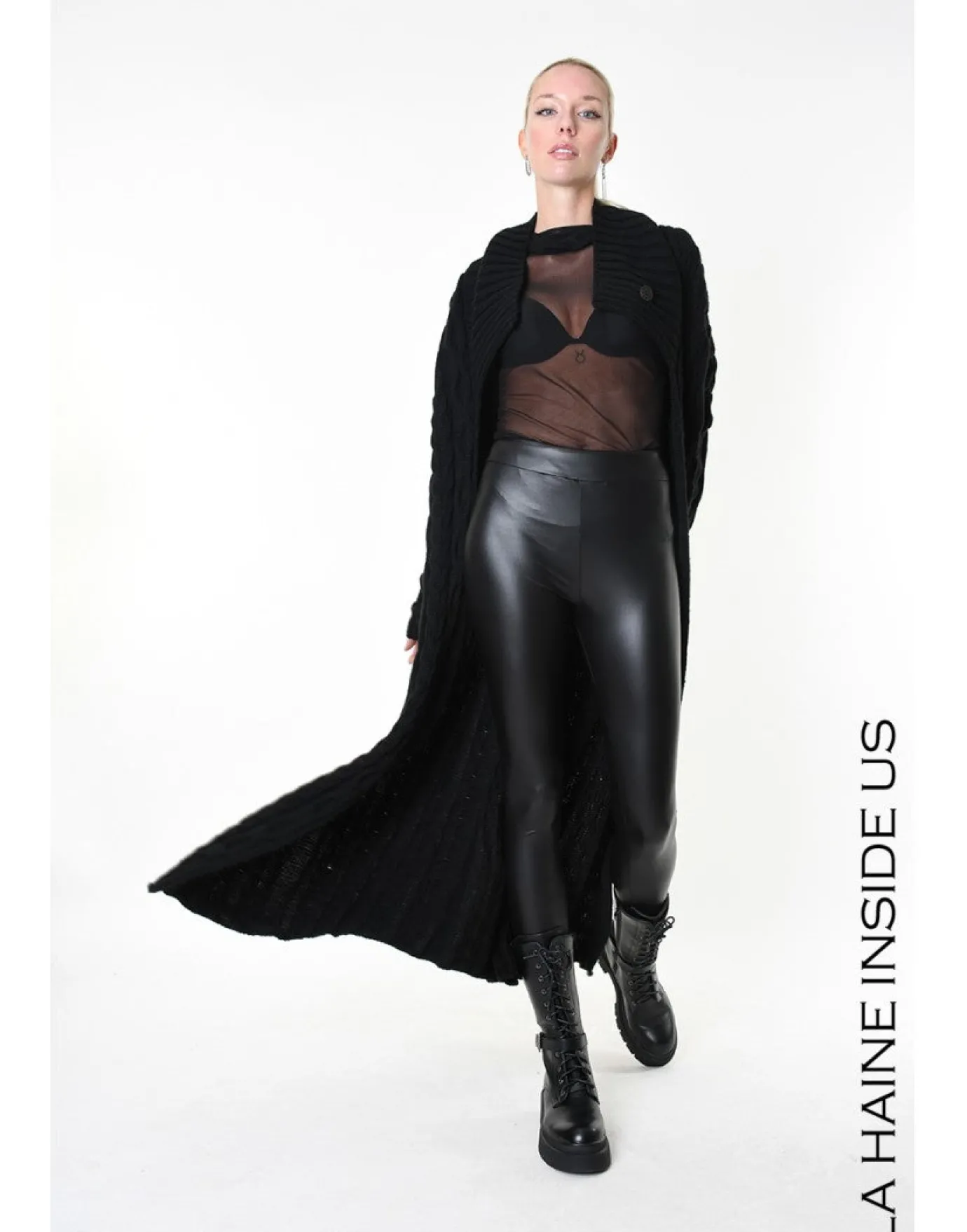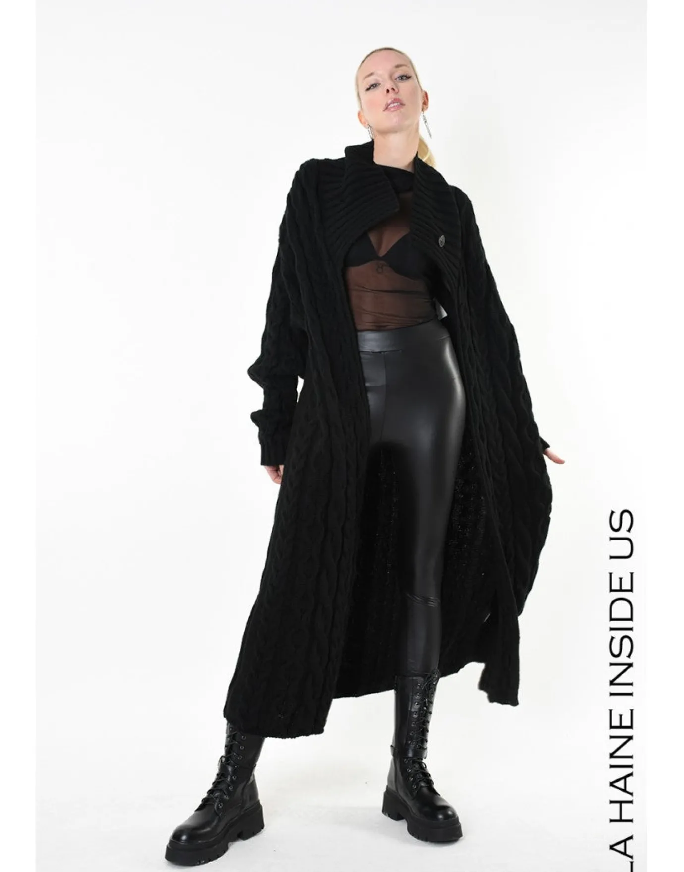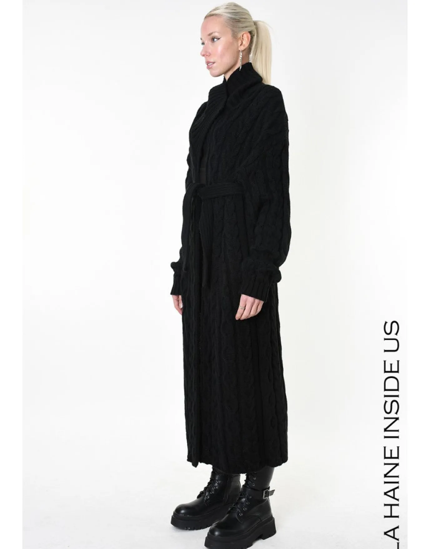 Stay warm and stylish with the midi length cable knit black coat cardigan. Made in Italy from a wool blend fabric, this long design cardigan boasts a button and ribbed high collar, long sleeves, and decorative cable knit, worn belted or loose, it’s perfect for any occasion.