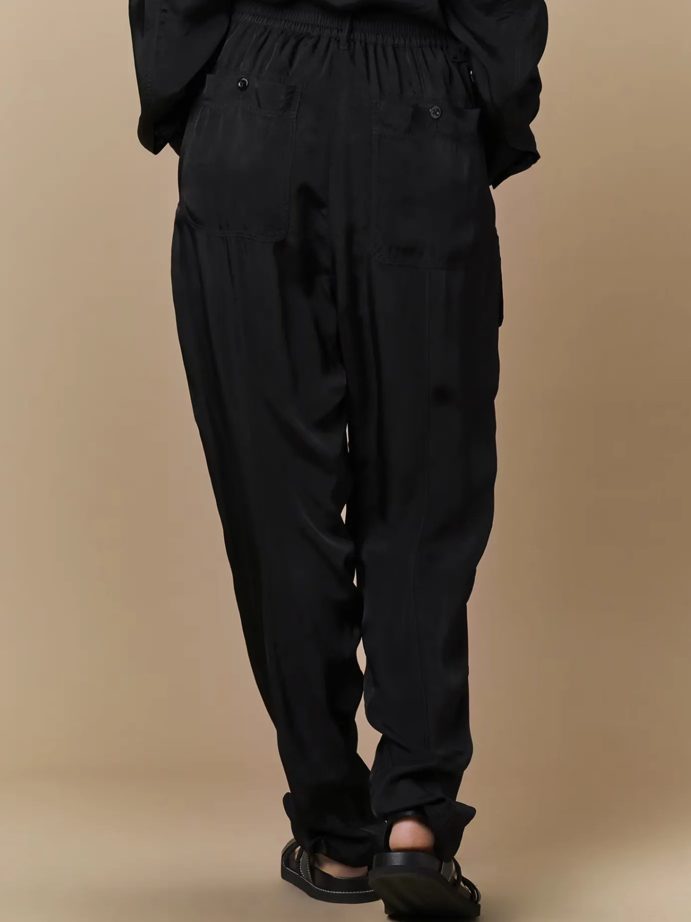 Experience an ultimate flattering silhouette with the SS24 Discipline Trousers by High. Made from a luxurious soft, fluid, and lightweight satin fabric, these trousers feature a waistband and belt loops with a button-thru fly for a secure fit at the front and an inset elastic waistband at the back for comfort. Two bellows-style slanting hip pockets are featured on the front and two oversized patch pockets with button closure at the back that provides both functionality and style. Detail stitching on the front and back leg seams add a touch of quirky detail. Revamp your closet with these dynamic and fashionable trousers.
