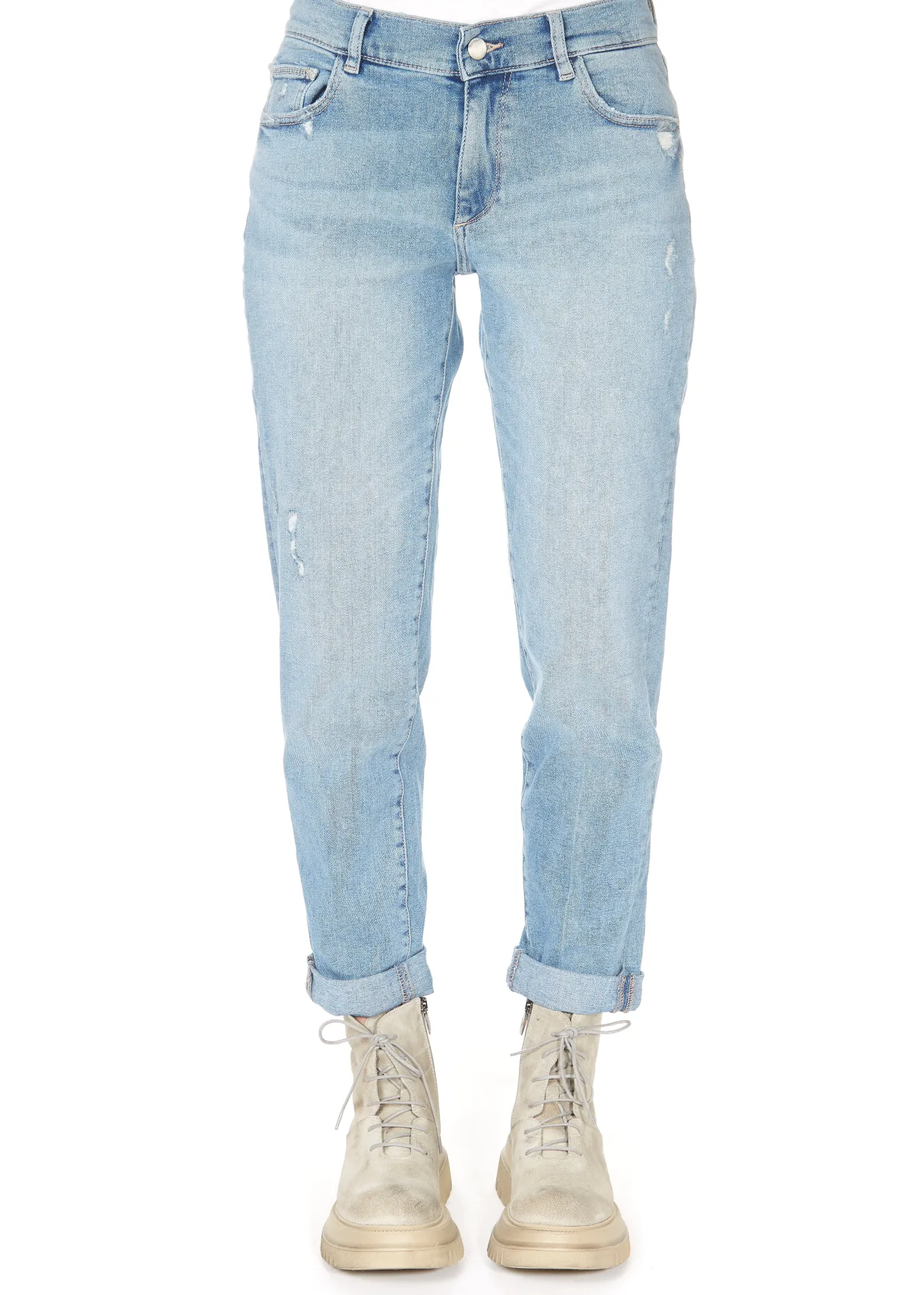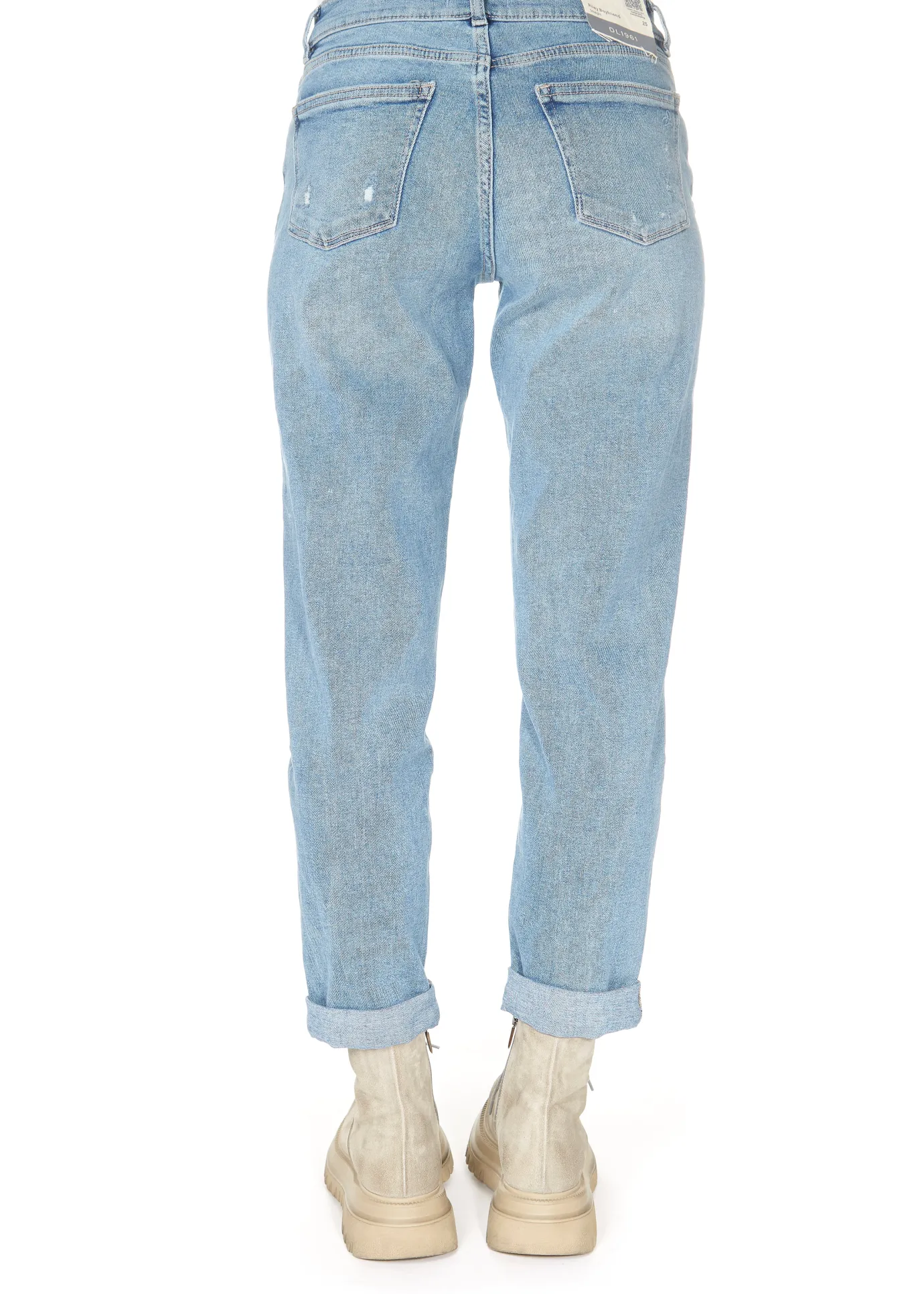 DL 1961 Riley Straight Boyfriend LT Glacier Distressed. A slouchy relaxed fit jean with a tailored straight leg. Features a mid-rise waist and a mid to light wash. Zip and fly, distressed and pocket clipping detail, front and back pockets and an adjustable rolled hem. Can also be worn as a full length. Crafted from cotton, these cool and comfortable straight leg jeans are a perfect match with Lofina boots and a leather jacket.