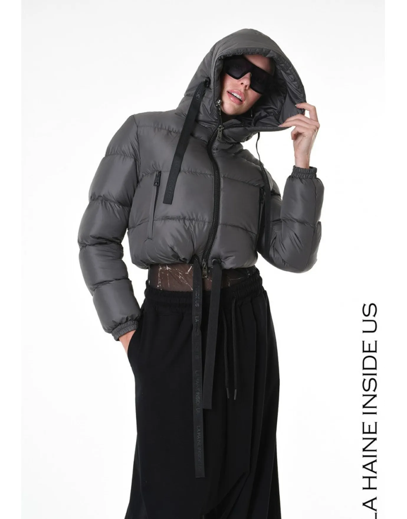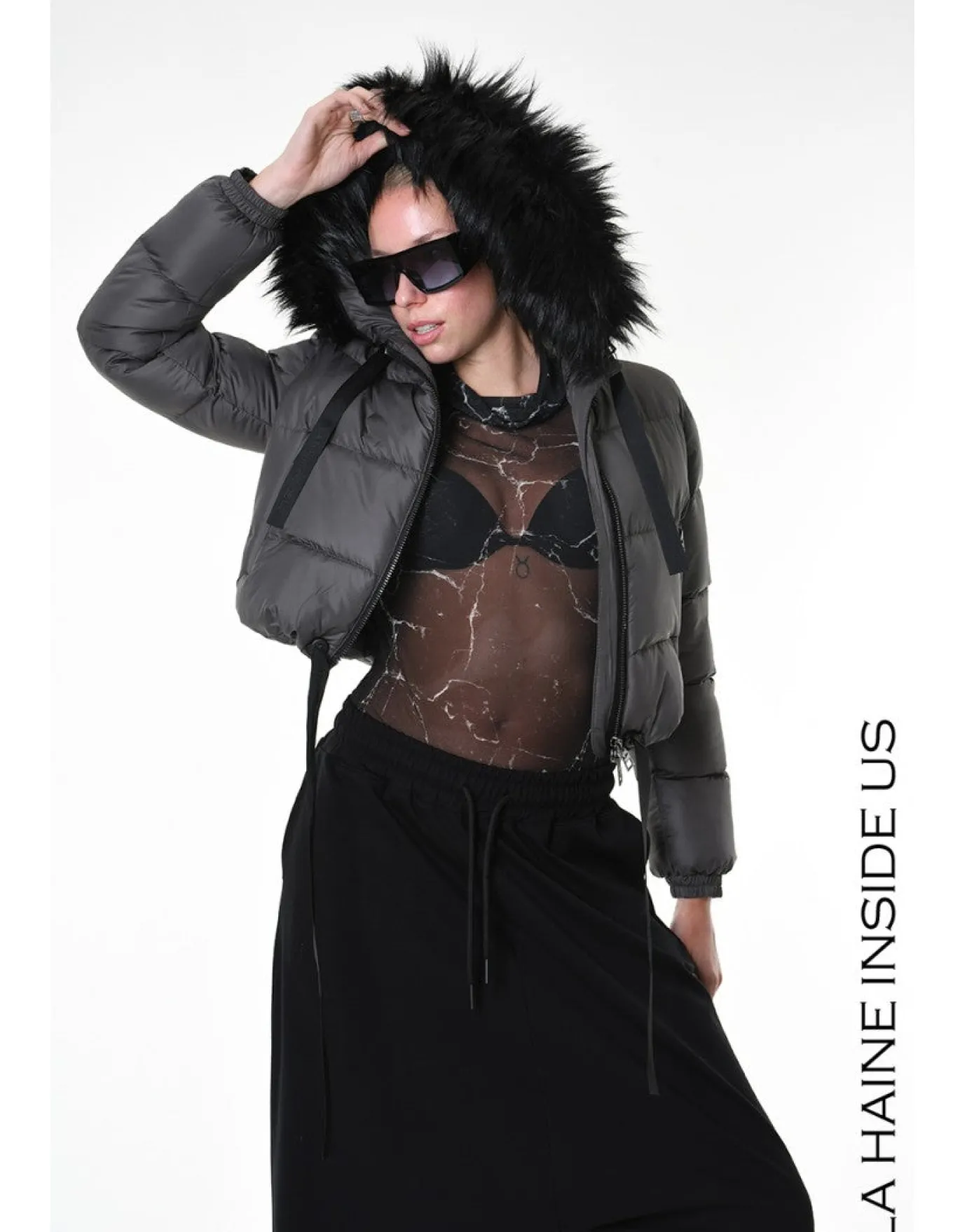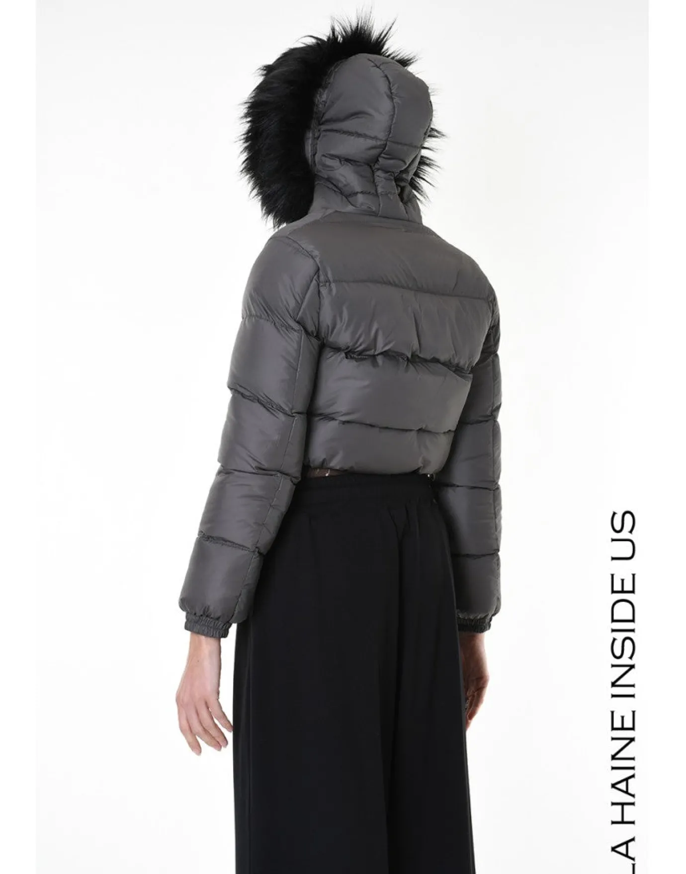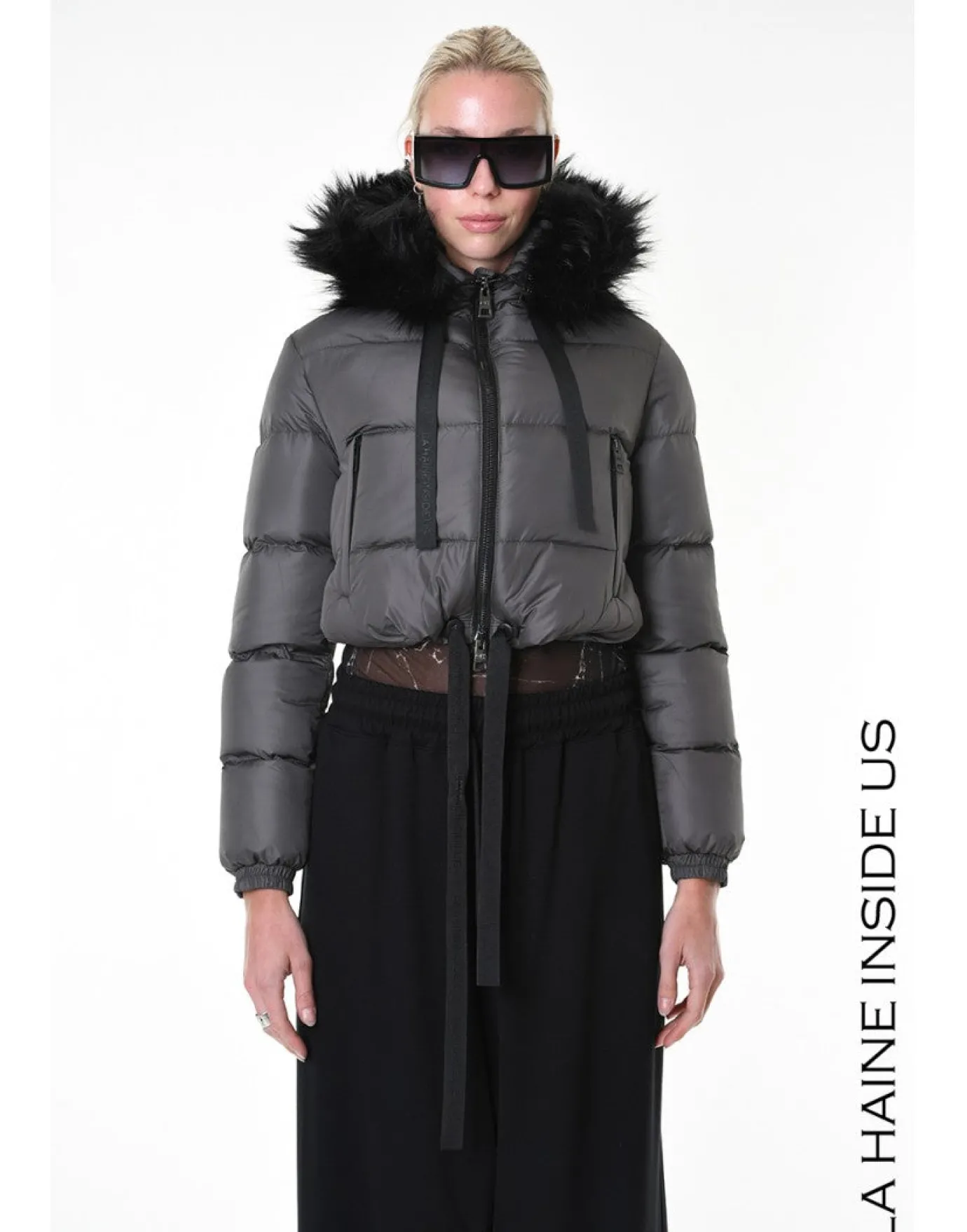 Expertly crafted with padded nylon and filled with luxurious down, the Fango Grey Puffer Jacket is the ultimate in winter warmth. Its double slider zip closure, zip pockets, andDrawstring detailing add functionality and style, while the oversized hood with removable faux fur ensures maximum comfort