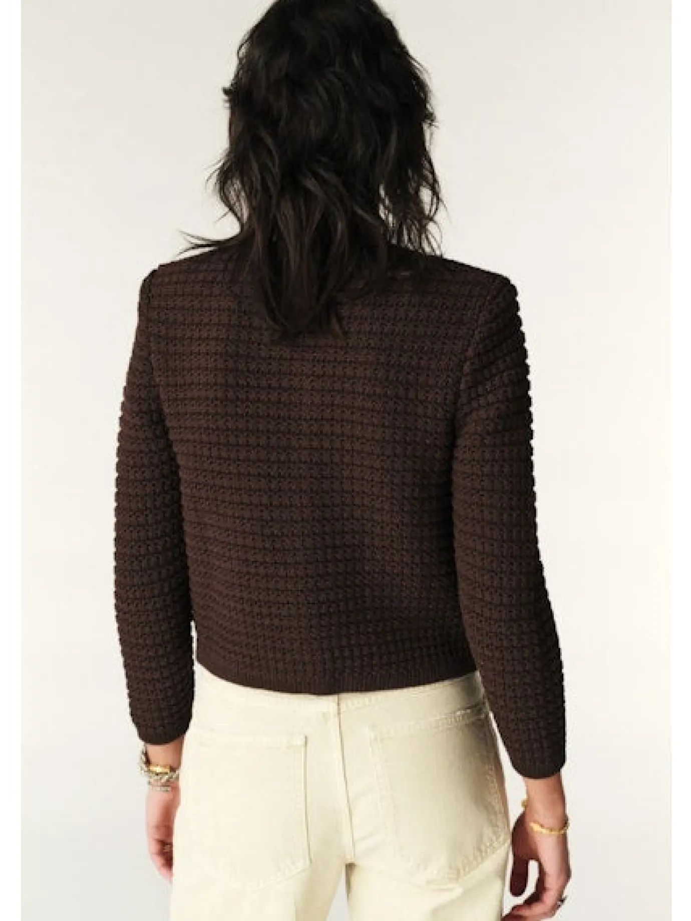 The Gaspard Chocolate Knit Cardigan by Ba&Sh blends the elegance of a designer jacket with the comfort of a knitted piece. Featuring a round neck, cropped sleeves, and structured shoulder pads, it offers a refined silhouette perfect for spring. The technical knit with a tweed-like Ottoman stitch adds texture, while gold and black coat of arms buttons and practical pockets complete the look. Crafted in a soft knit, this cardigan combines style and comfort effortlessly.