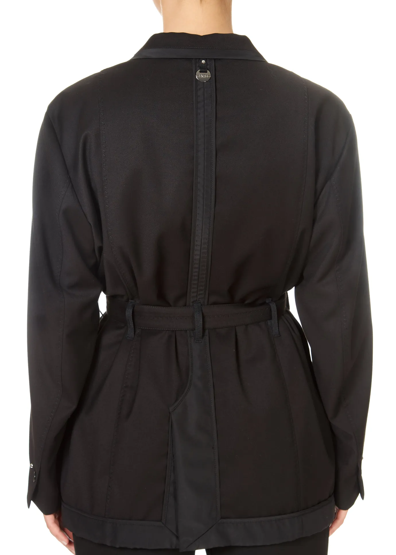 High Talent Belted Blazer Black. A fully lined, soft, unstructured single-breasted jacket crafted in a technical twill. Features a collar, front button fastening and trimming in a matte polyester. Detailed with a faux welt breast pocket and horizontal jet pockets at the side. Long sleeves with split cuffs and a single button. Overstitched belt running through belt loops on the side and back for that waisted look. The reverse is complete with a centre seam, vent and back hem finished in an “inside-out” style.