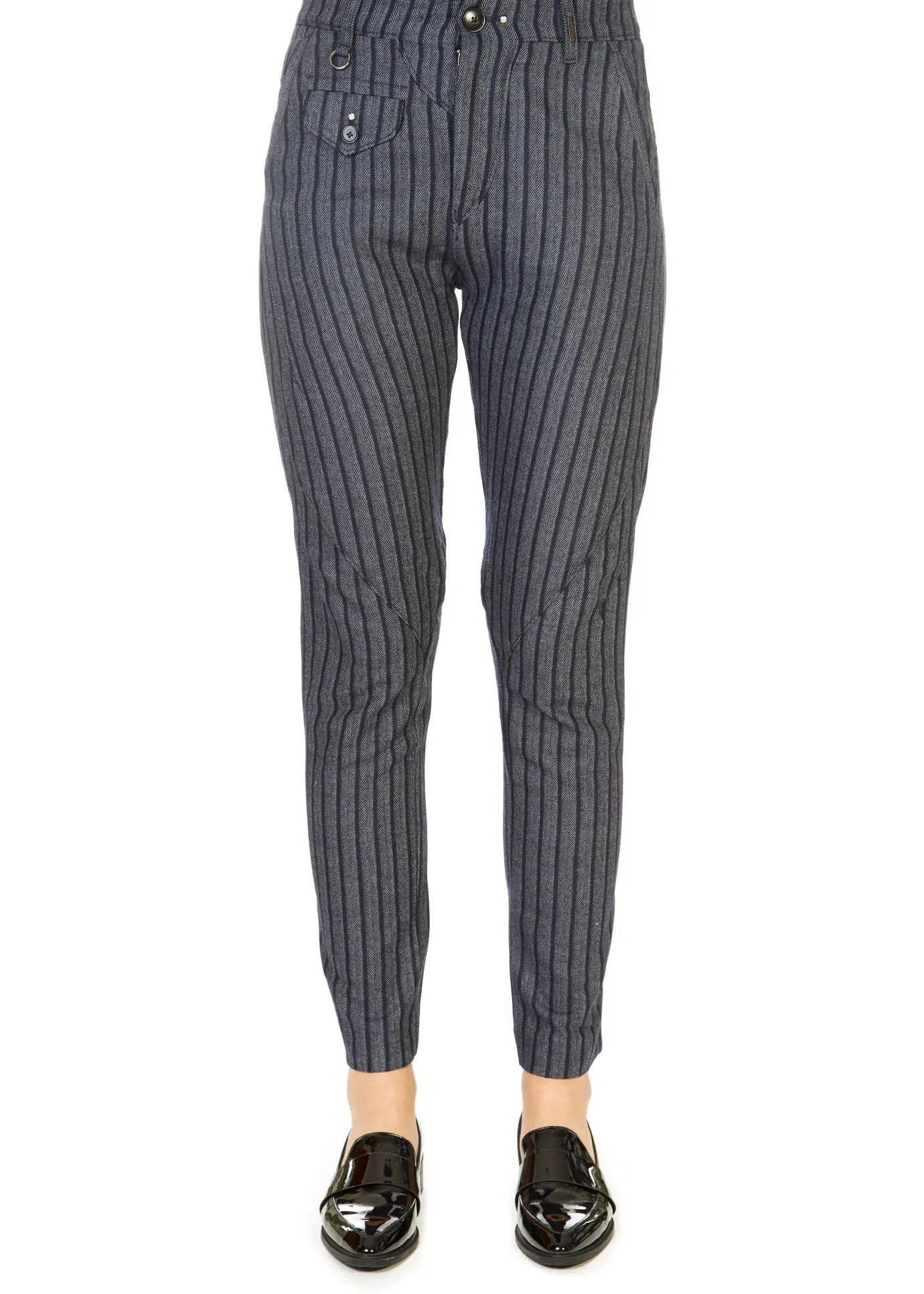 This is the ‘In Motion’ Grey Striped Trousers by our friends at HIGH Couture! Tapered and shaped leg pant in plain navy and navy herringbone stripe wool cotton mix. Asymmetrically seamed waistband with single button fastening and belt loops over a fly front with silver metal zip. Slanting welt hip pockets and coin pocket with button flap and stud detail. Diagonal seams running across front leg. Multi-seamed reverse has shaped yoke and back pockets with button flaps. Tapering seam runs down back leg to hem.