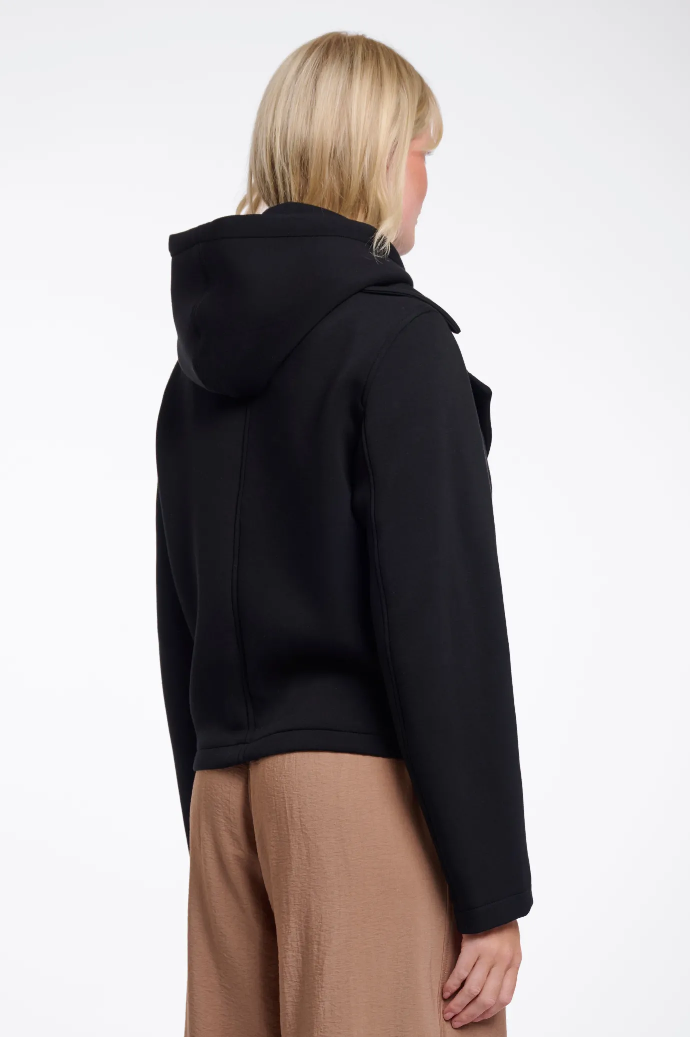 Elevate your outerwear game with the Jennifer BikerJacket. Crafted from a modern scuba-like material, this sophisticated double-breasted jacket features a detachable hood with drawstrings for customization, and side slit pockets for convenience. With a secure button fastening and dual removal options for the hood, this jacket offers both style and functionality.