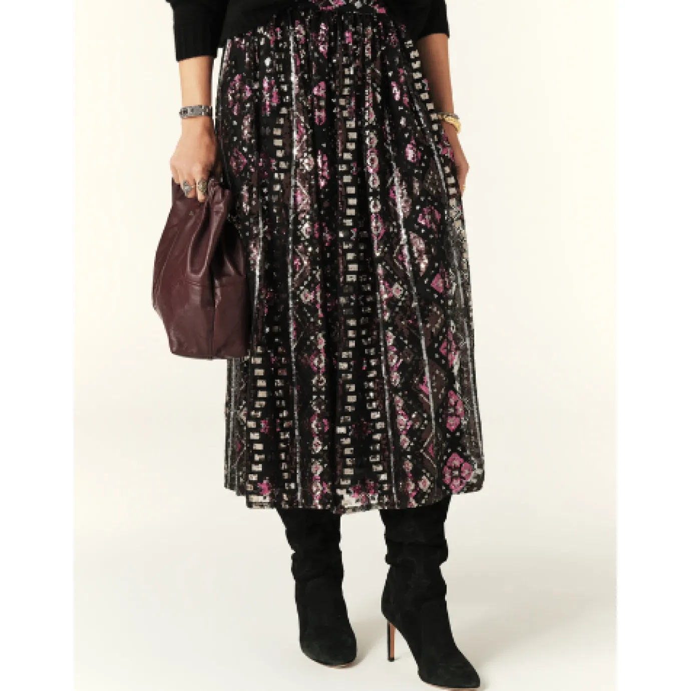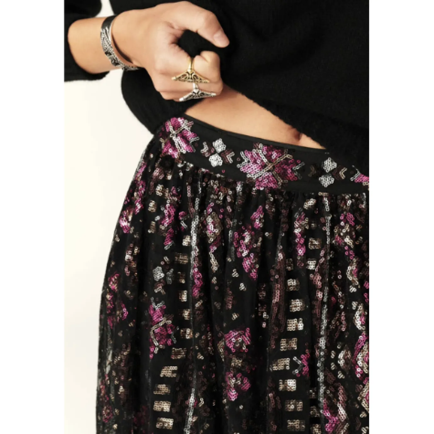 The Pippa sequin midi length skirt is a stunning ballerina-inspired skirt featuring a fitted waist and a flared tulle design, perfect for channeling your inner Carrie Bradshaw. The embroidered tulle is adorned with light-catching sequins, while a petticoat ensures the skirt remains opaque. Add some sparkle to your wardrobe and embrace your inner fashionista with this show-stopping piece.