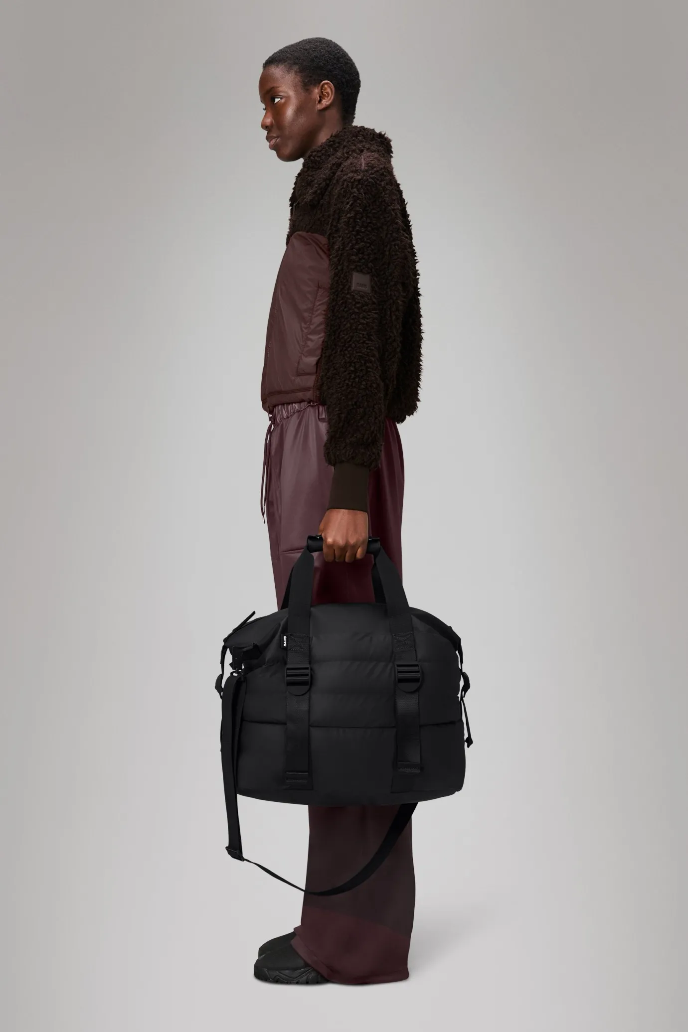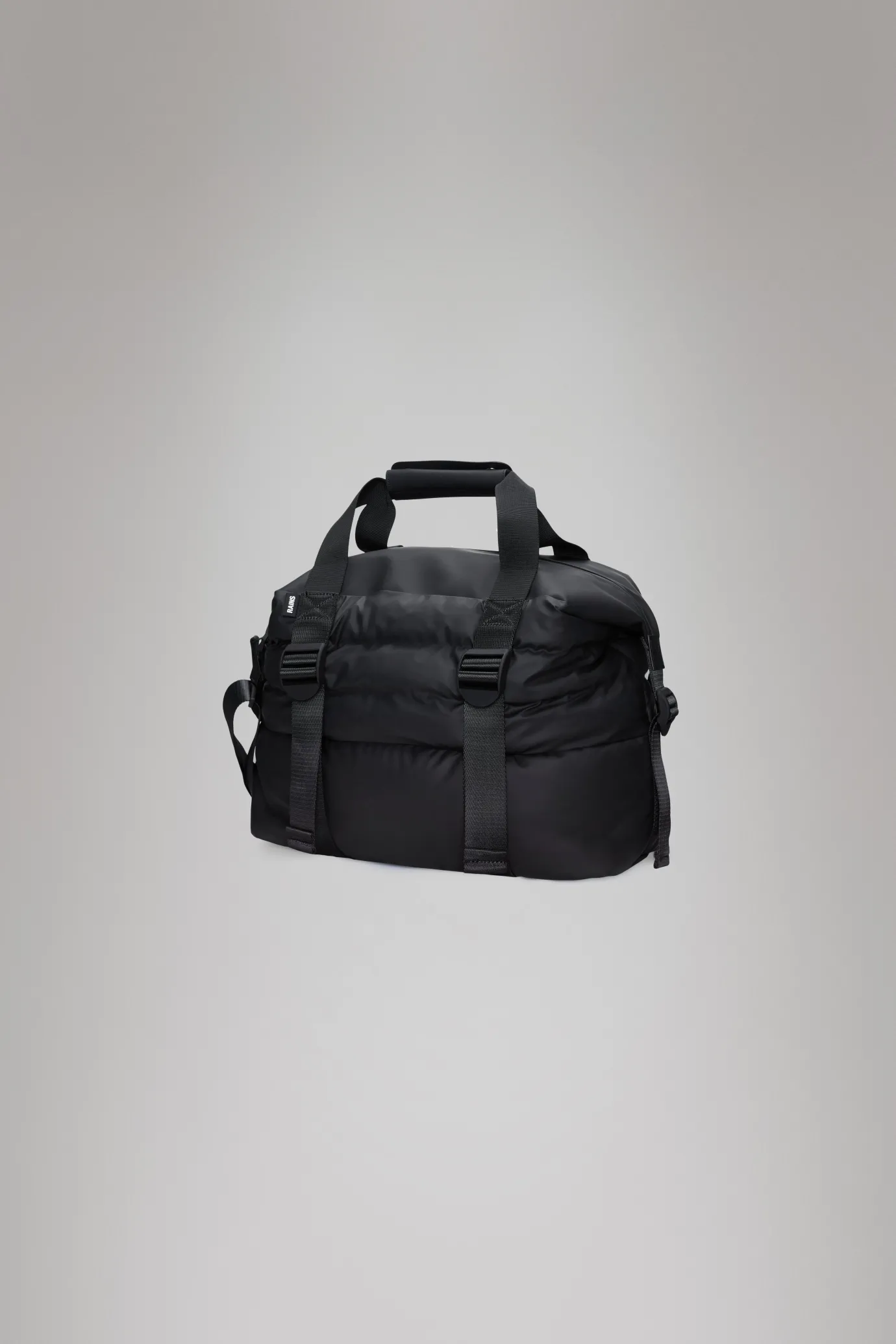The Puffer Mix small black Weekend Bag by Rains is a refined take on the classic Hilo design, combining a spacious main compartment with an internal zip pocket for secure storage of smaller items. Crafted from Rains’ signature waterproof PU fabric, it offers durability and protection against the elements. Adjustable front straps and side compression straps provide extra storage and secure packing, while webbing carry handles and a detachable shoulder strap ensure versatile carrying options. Ideal for light travel, this bag blends the iconic puffer style with practical functionality for a reliable overnight companion.
