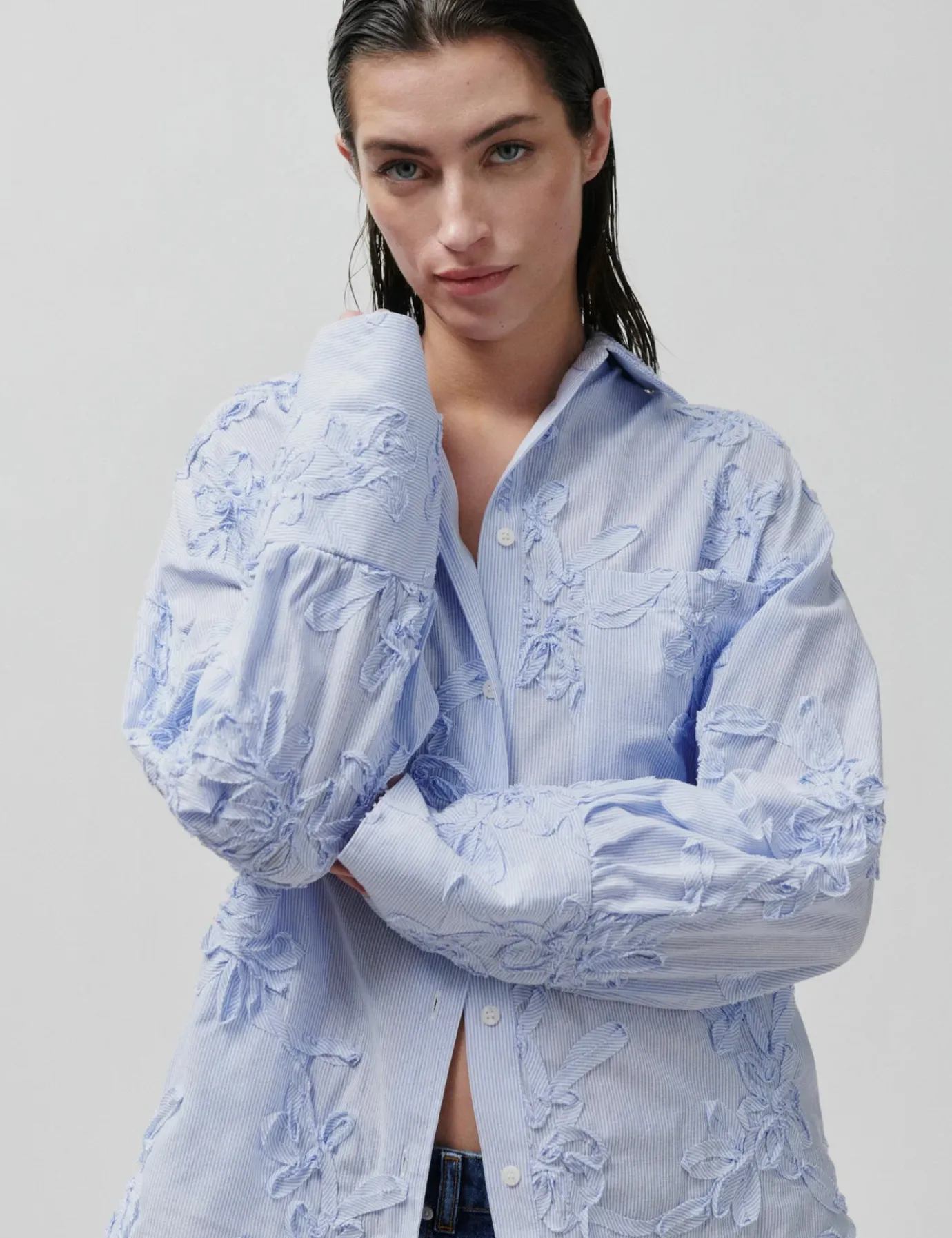 This designer button-up shirt by 2nd Day combines practicality with artistic flair. The Rumis Serenity blue striped shirt featuring a curved, dipped hem and functional chest pockets, it’s detailed with textural floral decals that add visual interest throughout. The crisp summer fabric ensures breathability and comfort, making it ideal for warm days. Style it over straight-leg jeans for an effortlessly chic ensemble, or layer it for versatile seasonal wear. A sophisticated piece that balances everyday wearability with designer-quality craftsmanship.