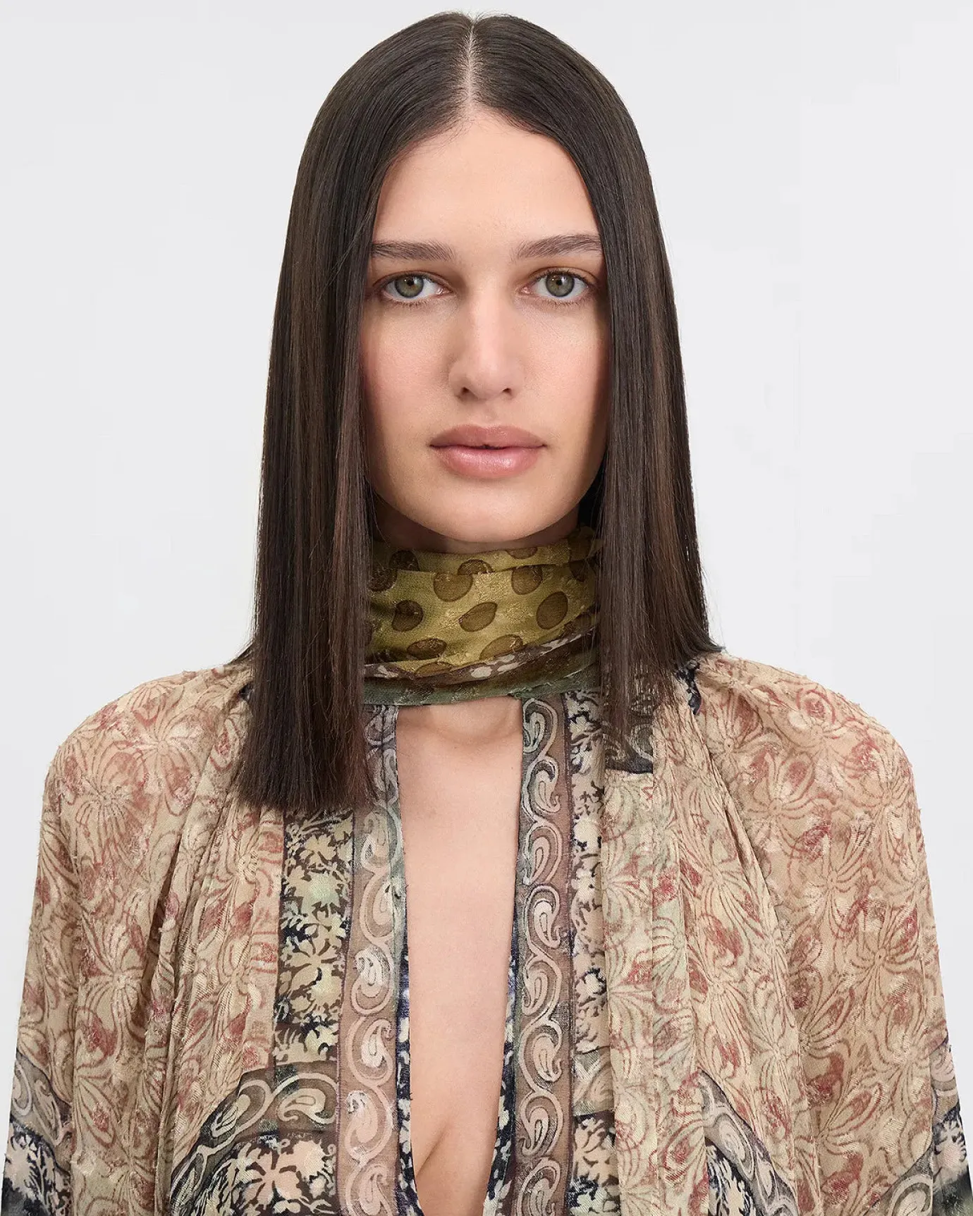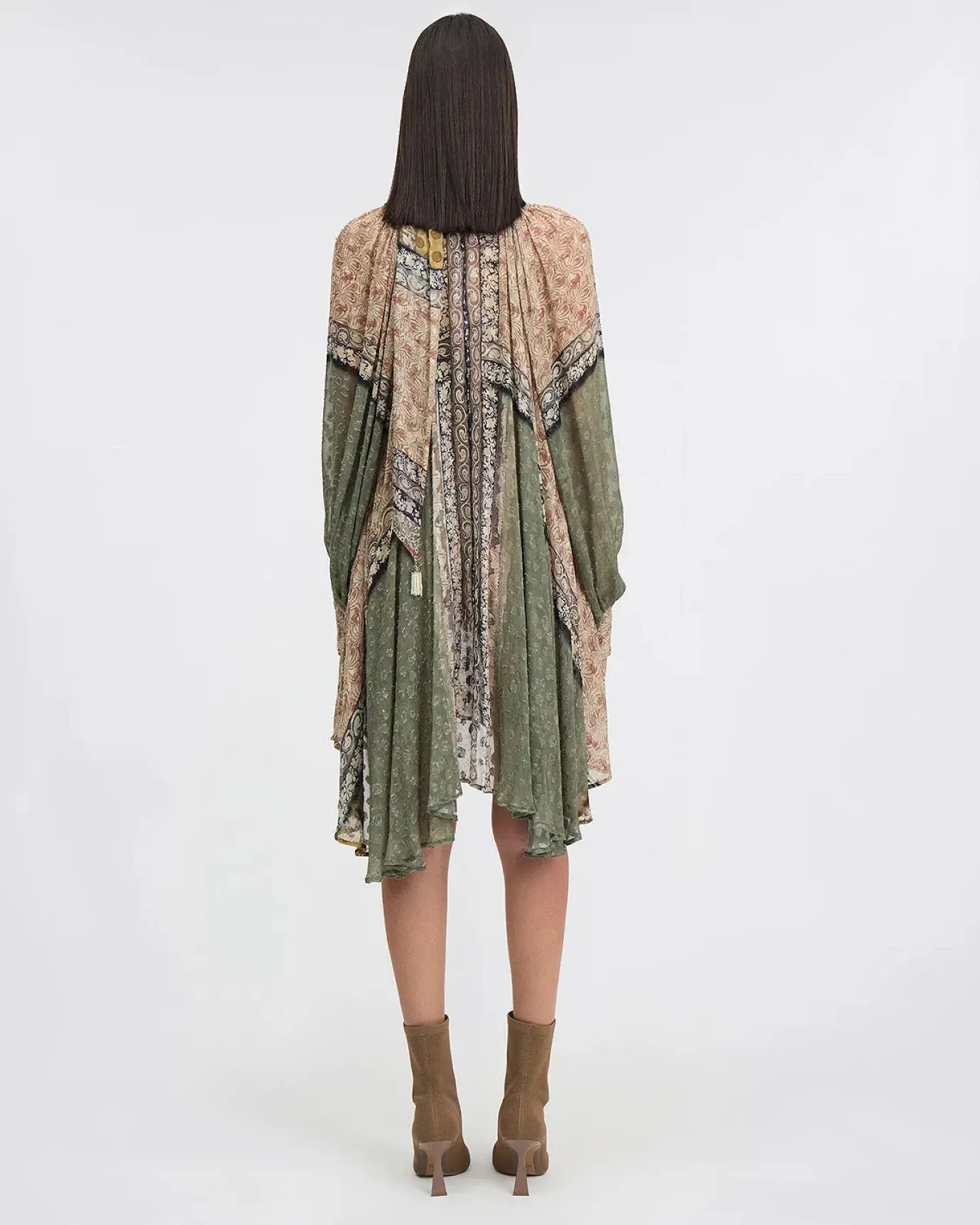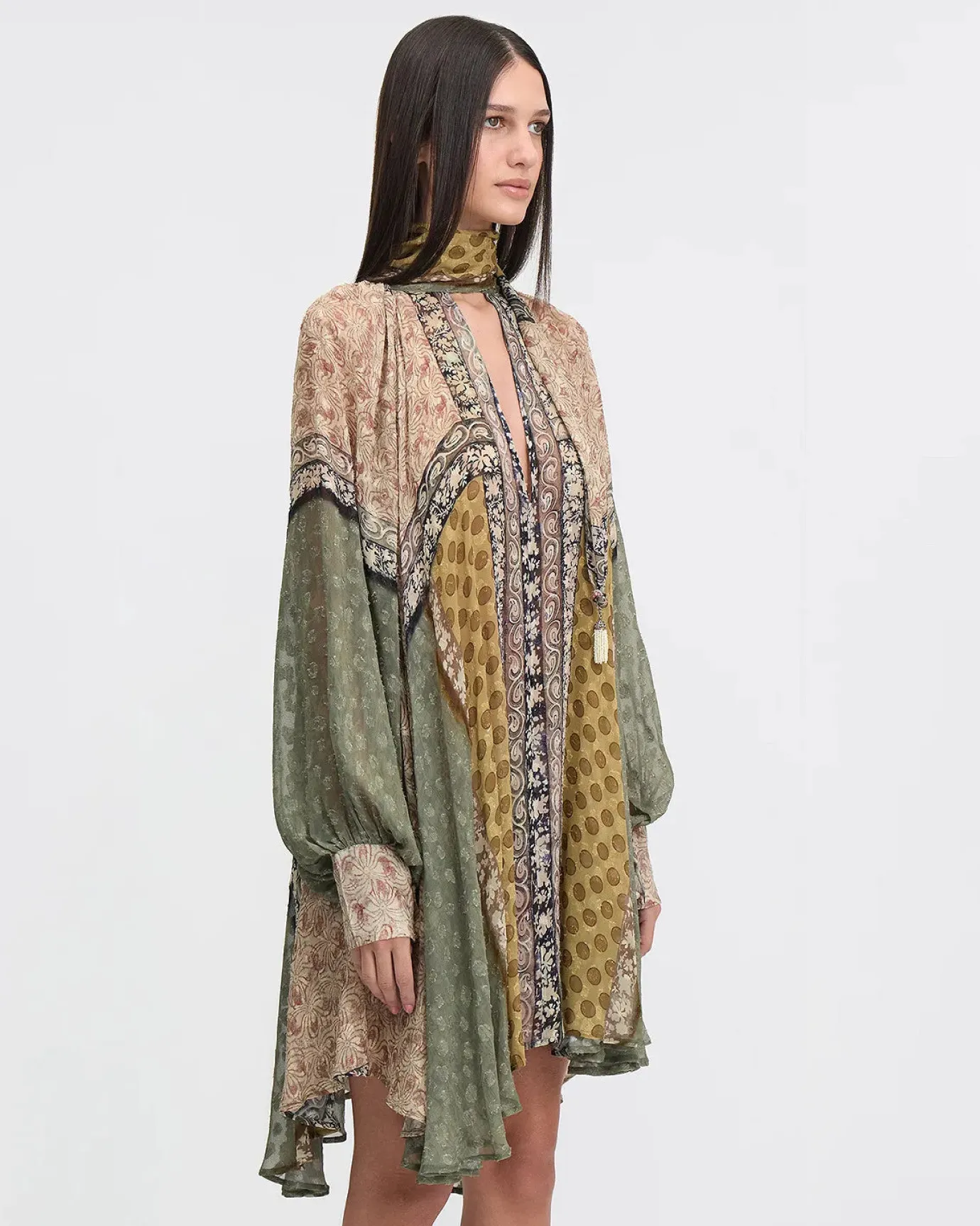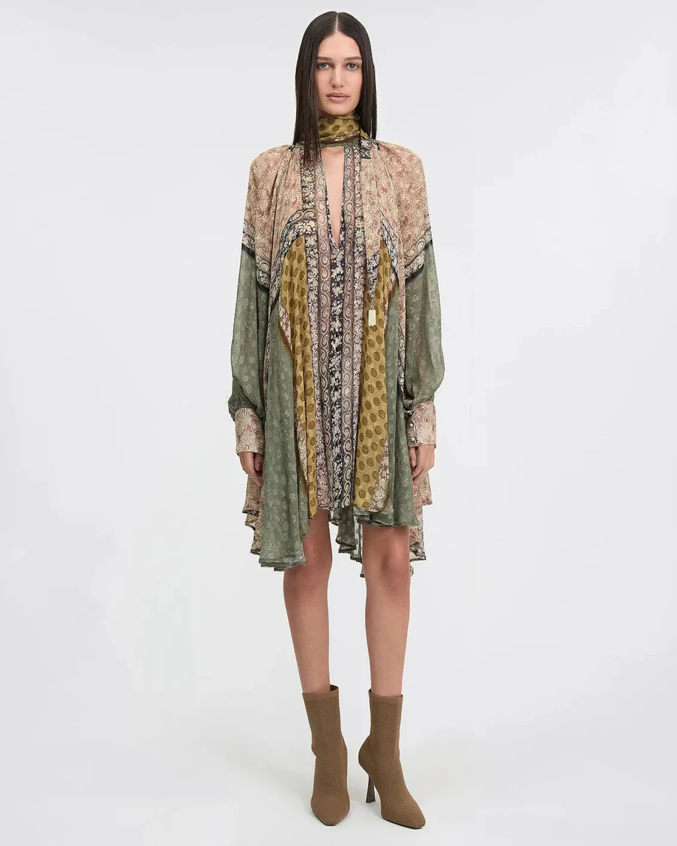 The Sienna dress by french designer Mes Demoiselles is a cool addition to your wardrobe. The dress is made in a fabulous jacquard patch viscose print of khaki and ochre tones. The dress features a wide cut that offers ease on the body, allowing you to move freely while remaining chic. The dress has long sleeves and can be worn as a short dress or tunic. This can be worn casually or for a special evening out. Eye catching and a boho feel.