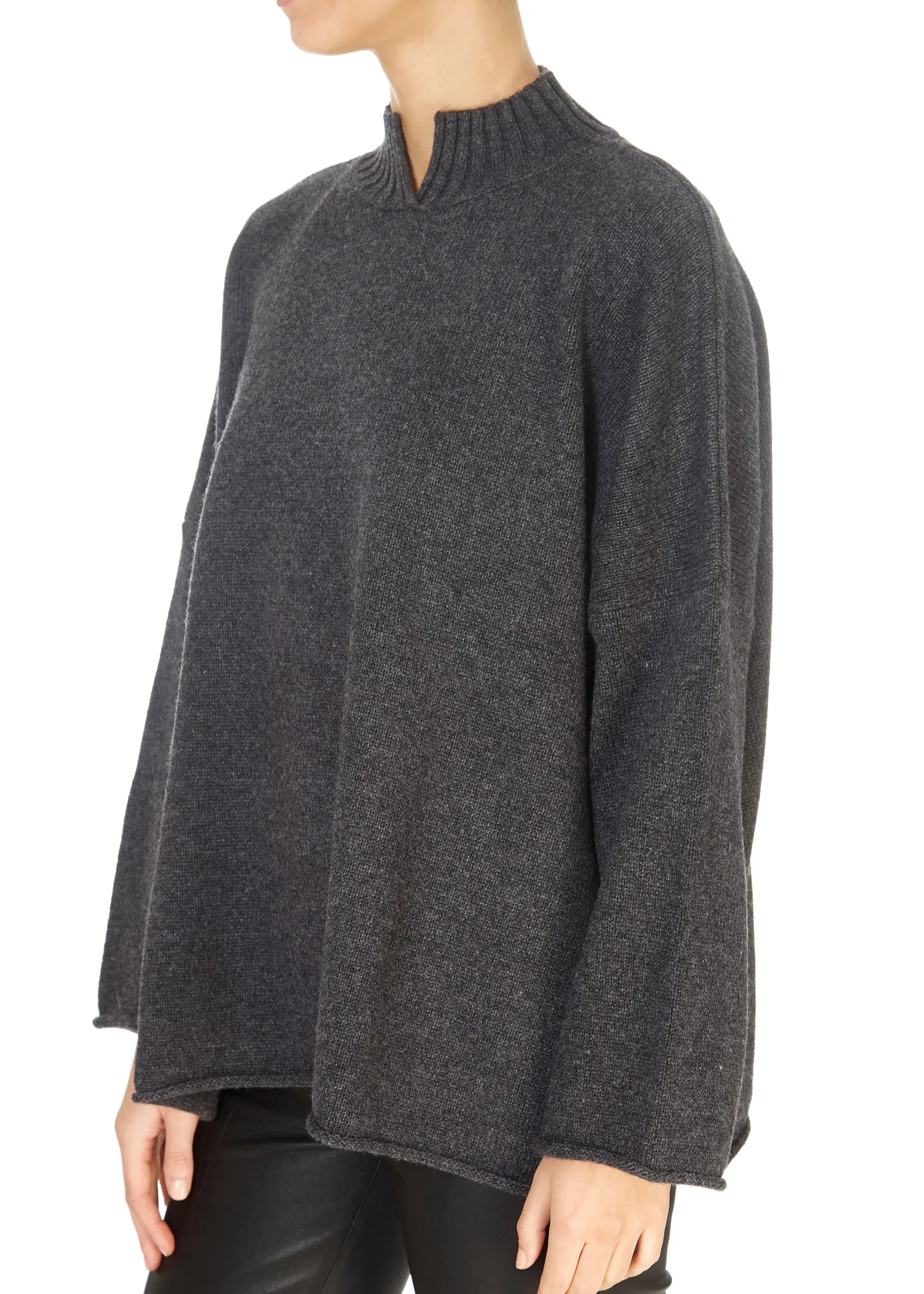 This is the ‘Stella’ Graphite Grey Cashmere Sweater from our own brand, Jessimara. It features a full length sleeve with rib detailing at the bottom, a v-neck line with a collar and an oversized fit. This piece falls slightly shorter at the front than the back, as well as two side splits on either side.This sweater is a fabulous easy everyday piece.
