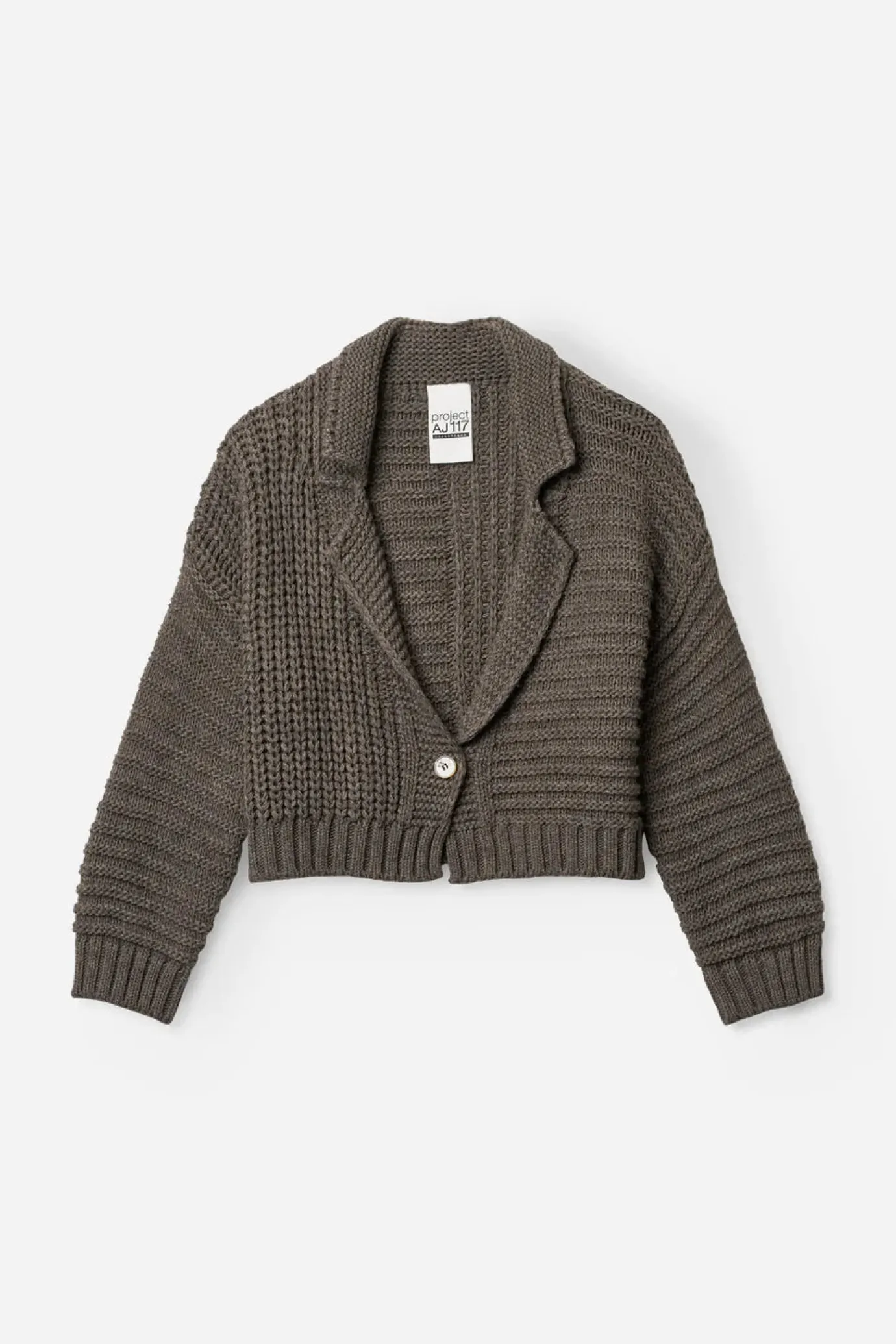 The Sting Cardigan in Soil by Project AJ117 is a stylish single-breasted piece crafted from a mixed knit patchwork for a unique texture. Its loose, wide fit and short chunky design offer effortless comfort and versatility. Wear it casually with jeans or elevate your look by pairing it smartly over a dress or skirt. This cardigan blends cozy warmth with contemporary style, making it a must-have for any wardrobe.